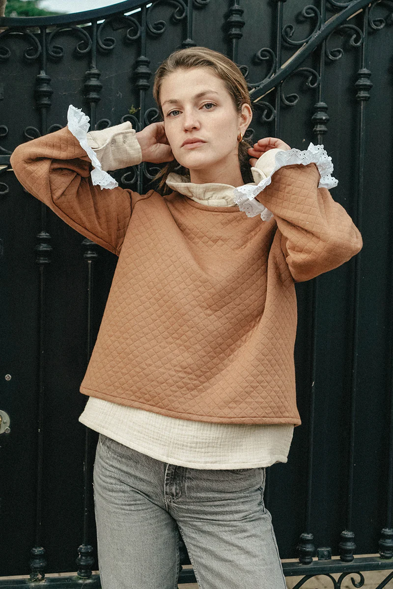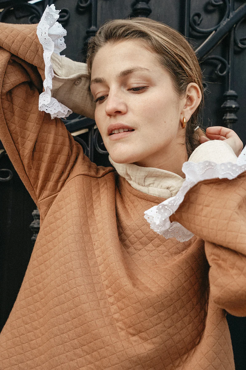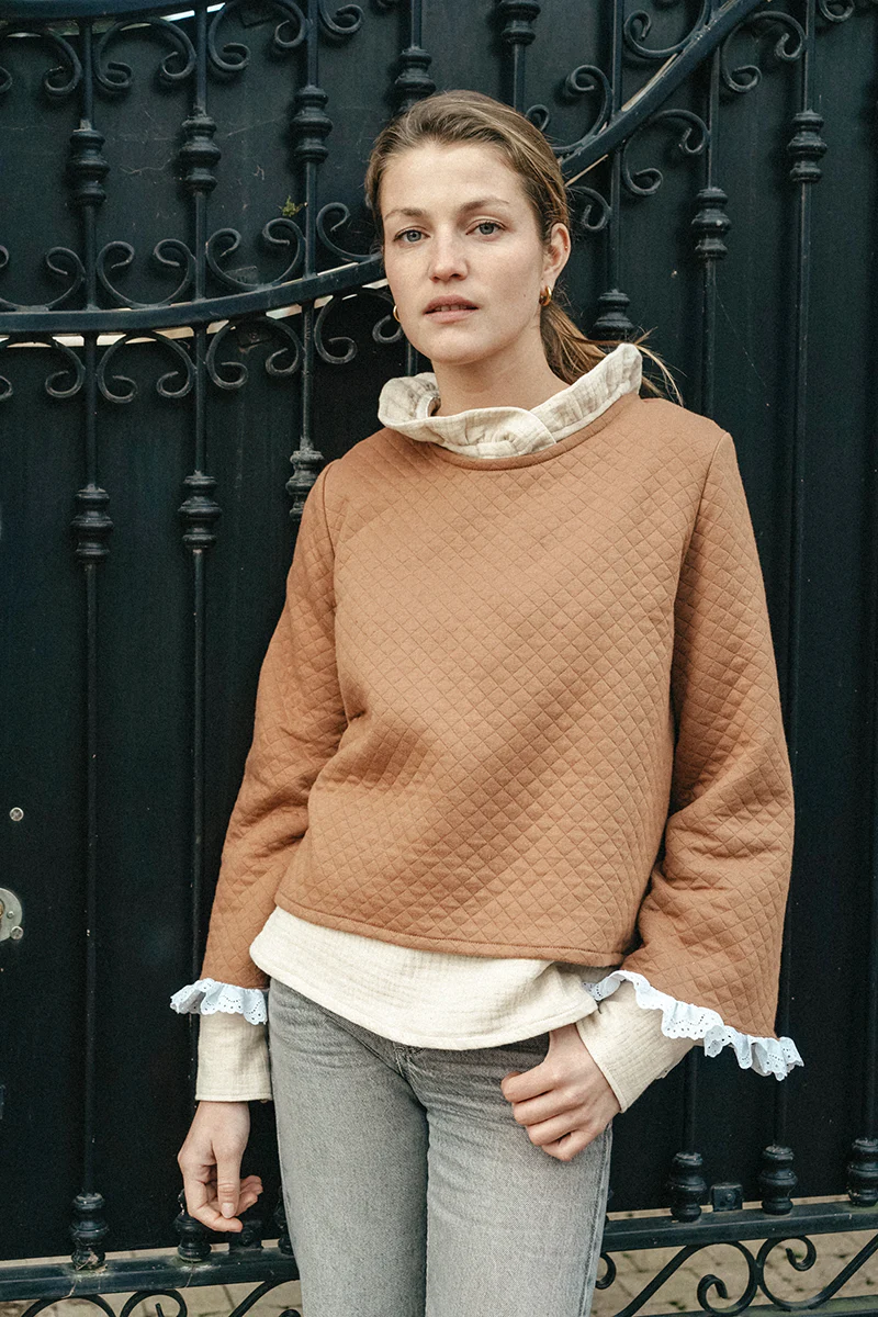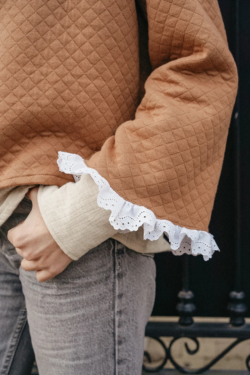 Sweat matelassé à manches très évasées, avec broderies au bas des manches froncées.