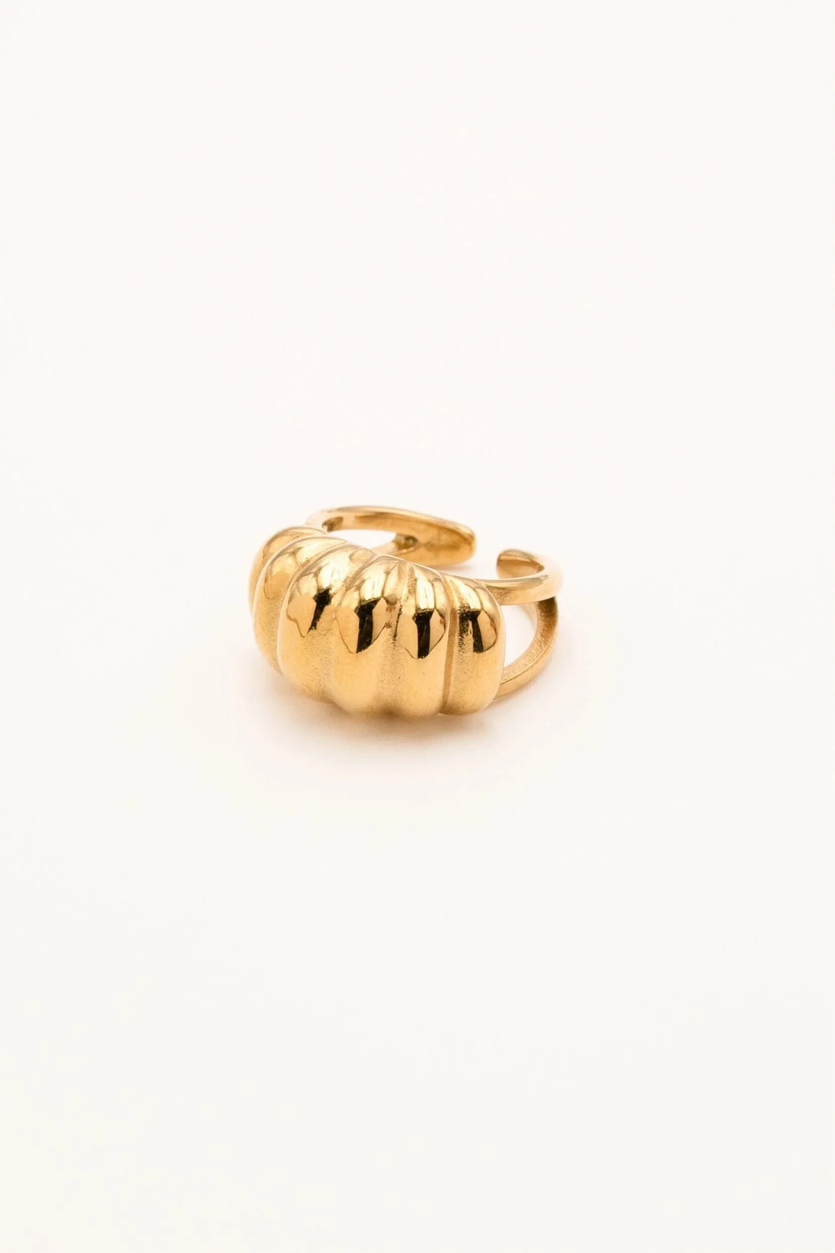 Bague en acier inoxydable composée d’un anneau à la formes bombée et striée, style coquille.