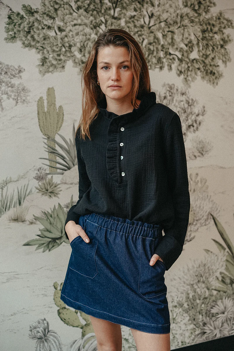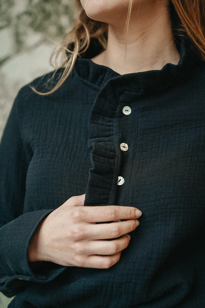 - Description : Coupe droite plutôt ample – Patte de boutonnage sur le devant – Volant le long de l’encolure – Manches longues finies d’un poignet boutonné – Boutons nacrés