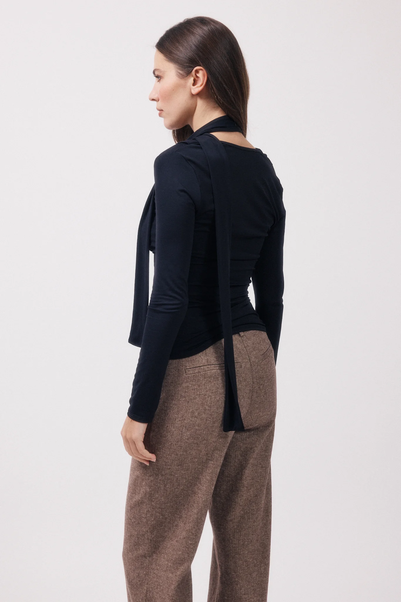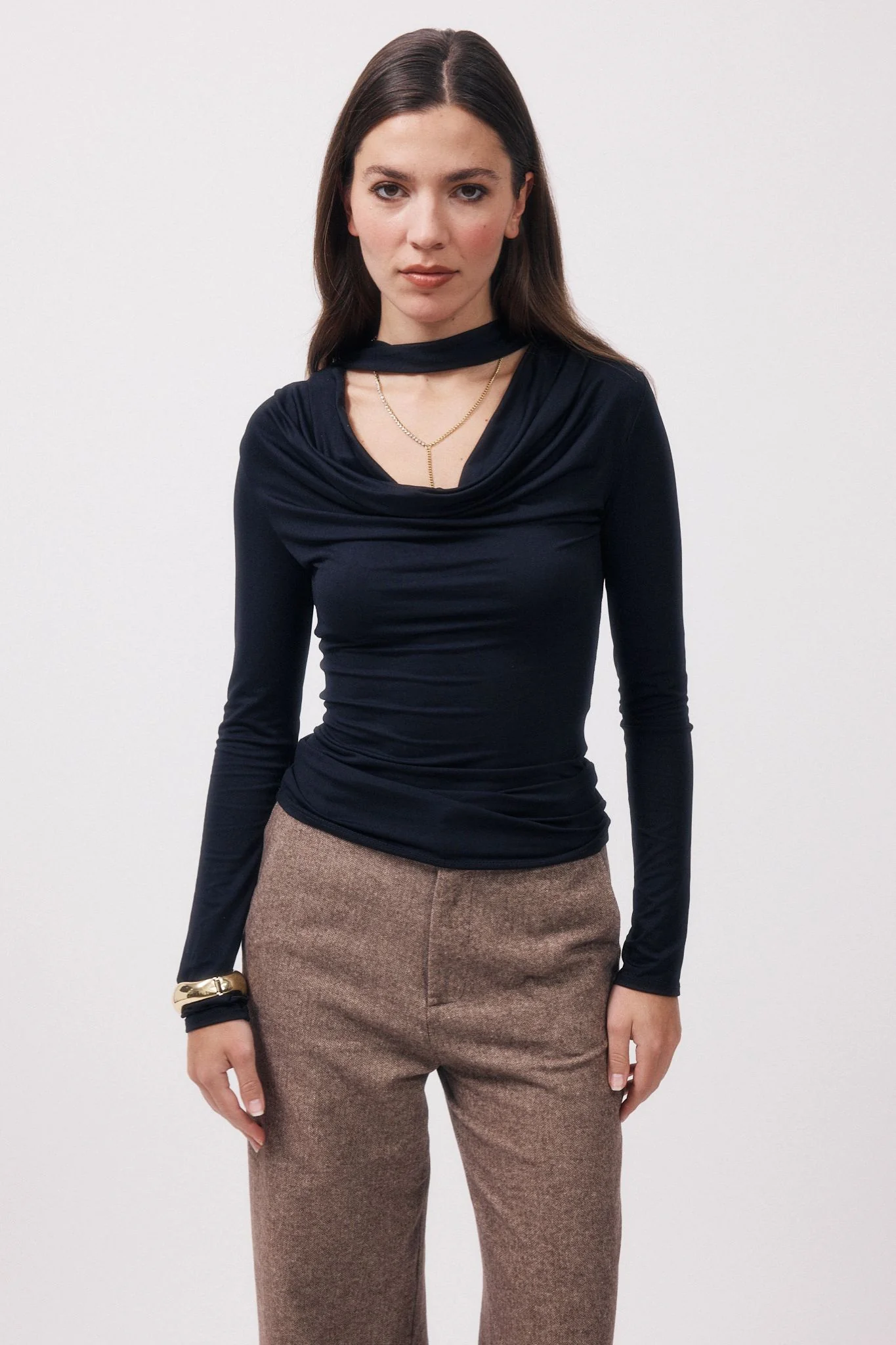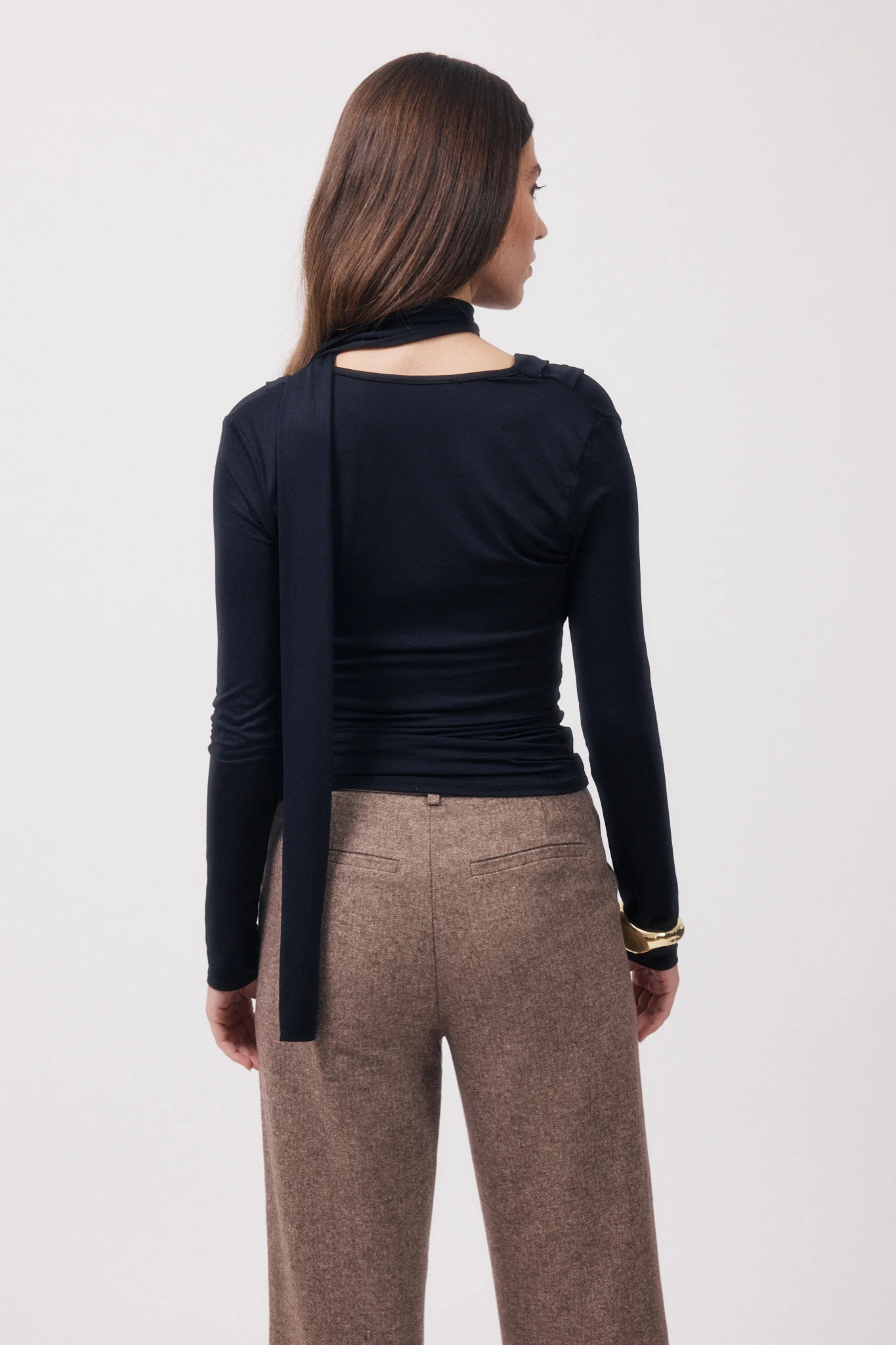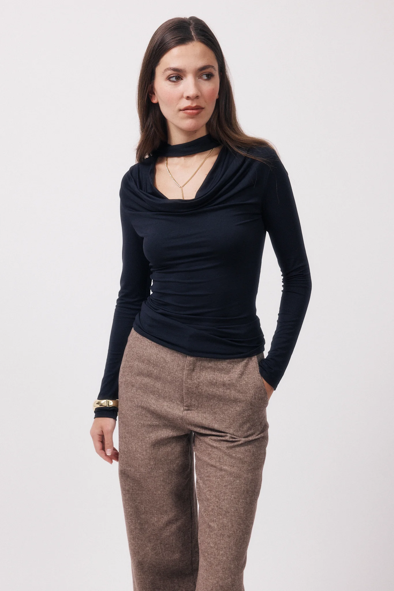 Un top noir au tombé fluide, pensé pour accompagner aussi bien les journées de travail que les soirées plus habillées. Son encolure drapée se prolonge par un foulard intégré qui peut se nouer ou se laisser tomber librement selon l’envie.