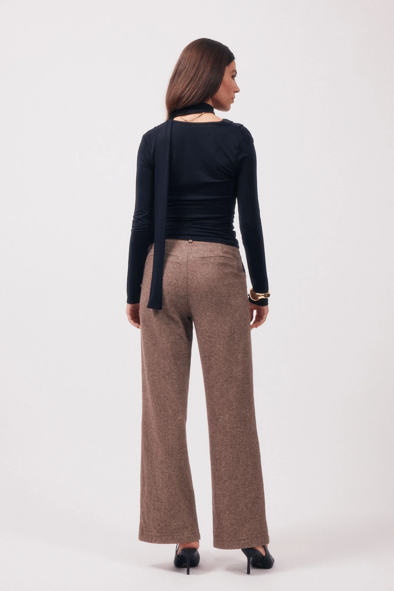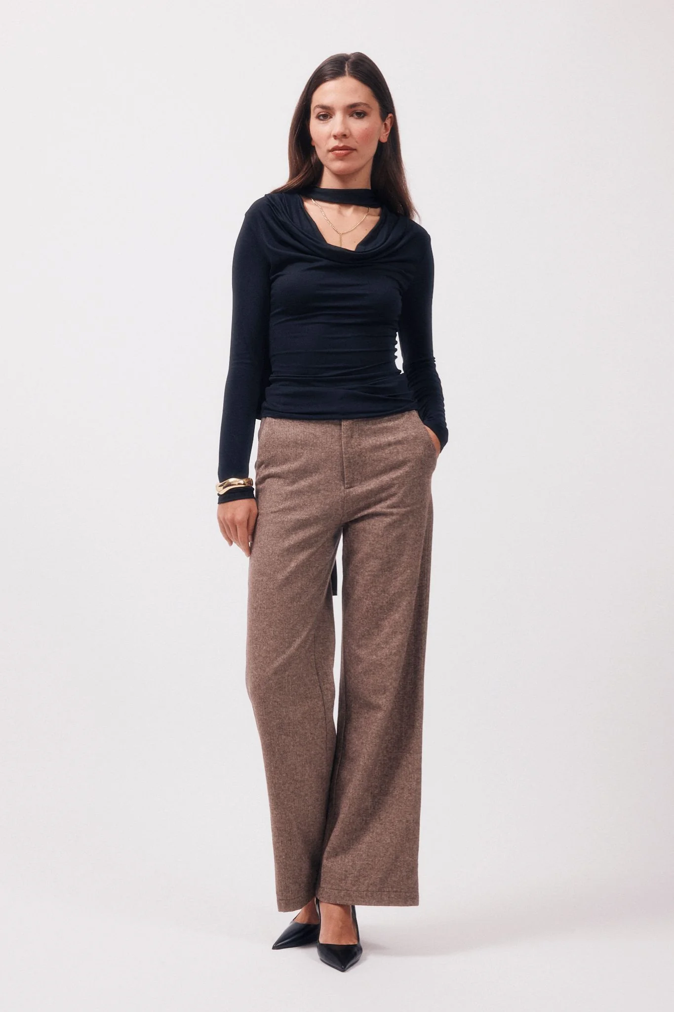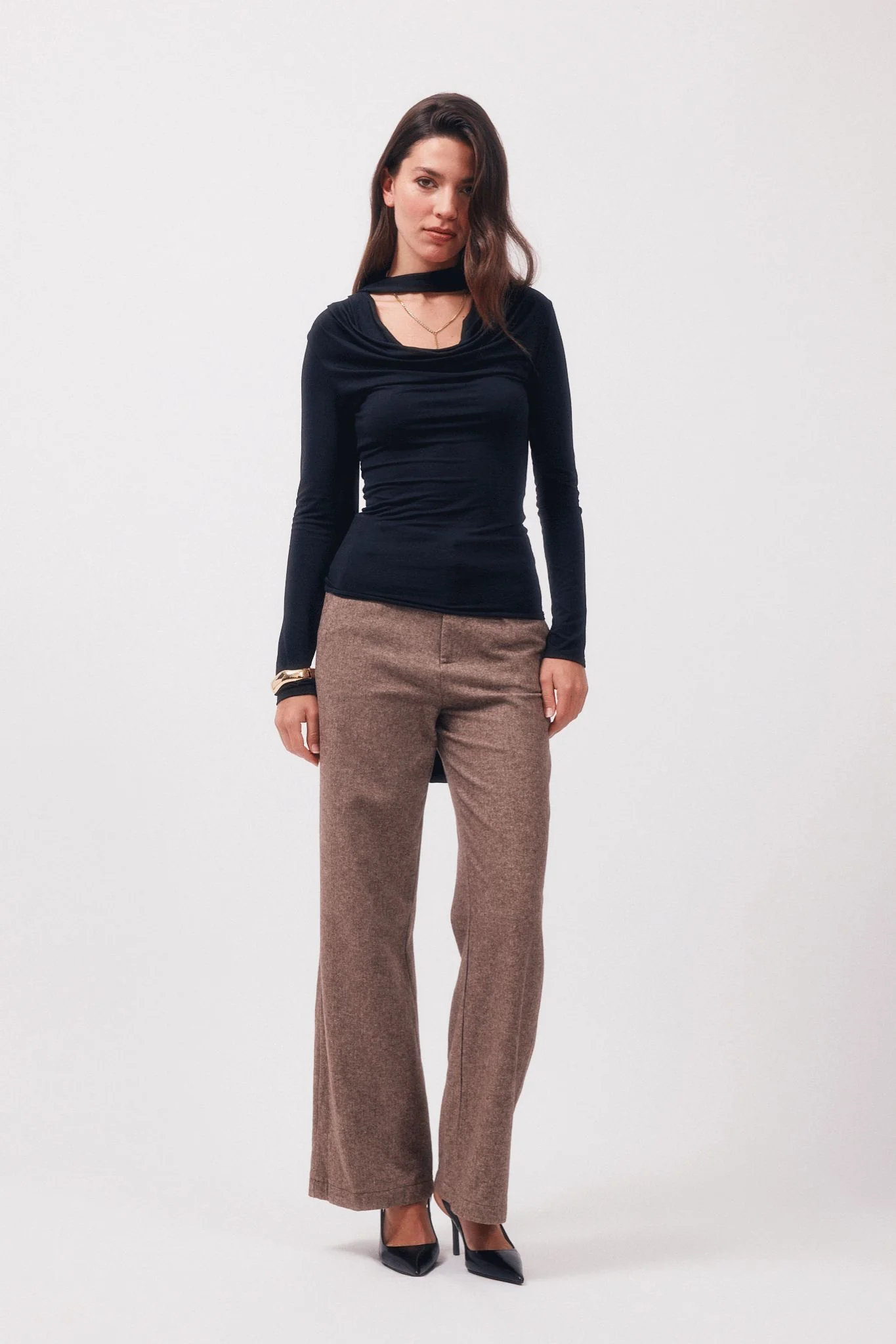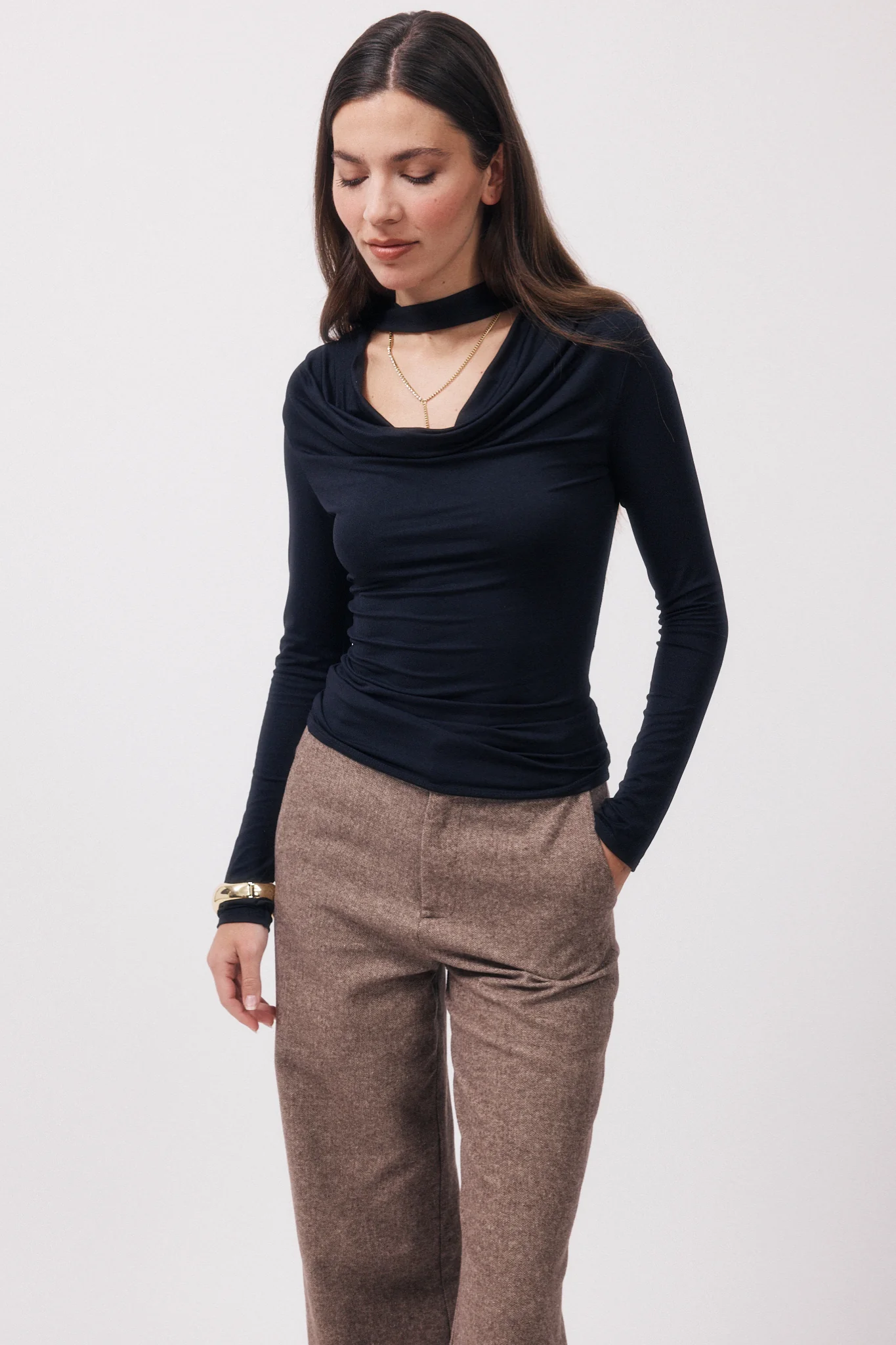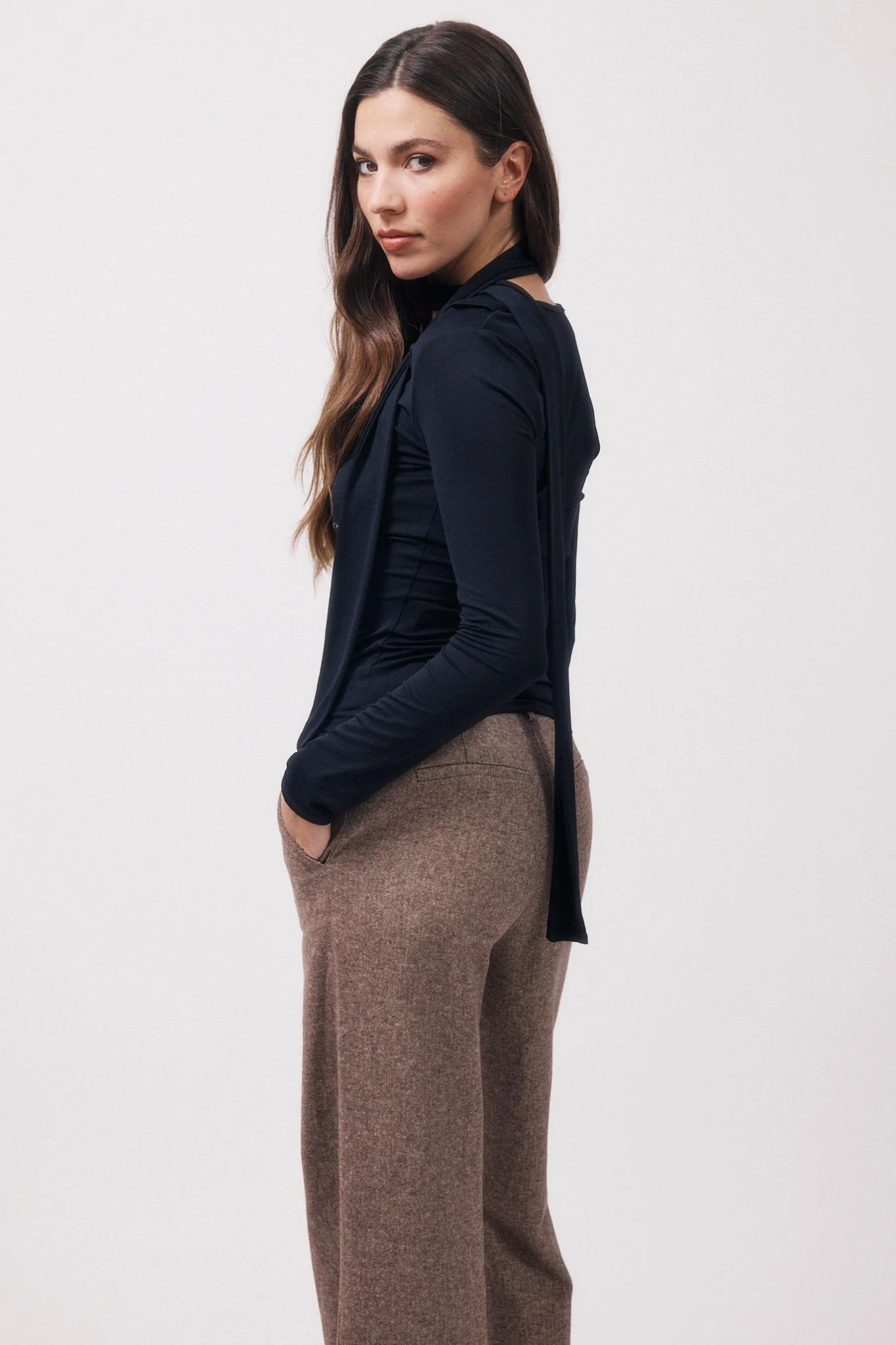 Un top noir au tombé fluide, pensé pour accompagner aussi bien les journées de travail que les soirées plus habillées. Son encolure drapée se prolonge par un foulard intégré qui peut se nouer ou se laisser tomber librement selon l’envie.