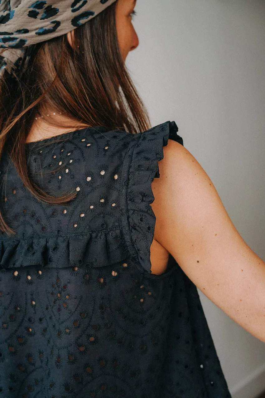 Haut sans manche en broderie anglaise Description : Coupe ajustée en haut, légèrement évasée en bas – Décolleté rond – Epaules volantées – Volant dans le dos Conseil taille : Delphine mesure 1m65 et porte une taille 36 pour son 34 habituel.Il taille légèrement petit. Si vous hésitez entre deux tailles, prenez la plus grande. […]