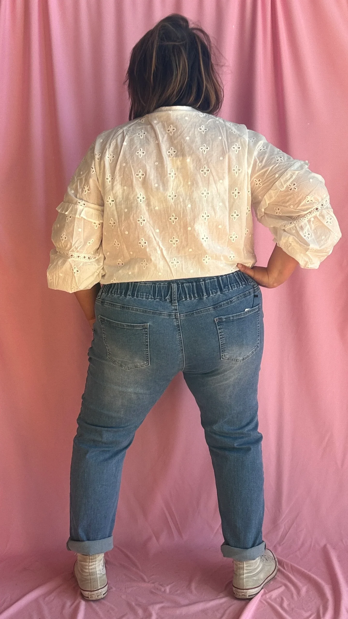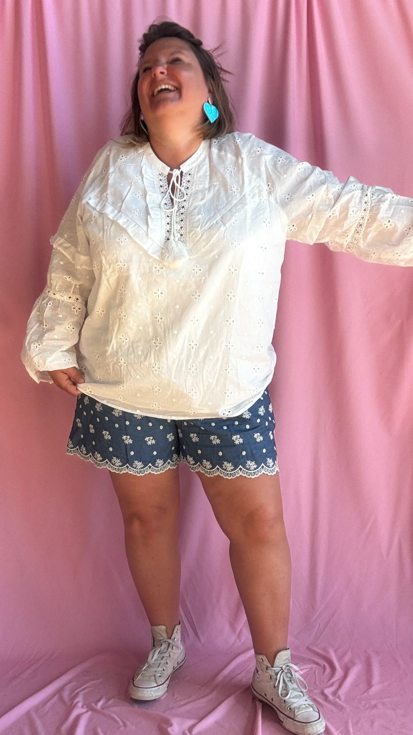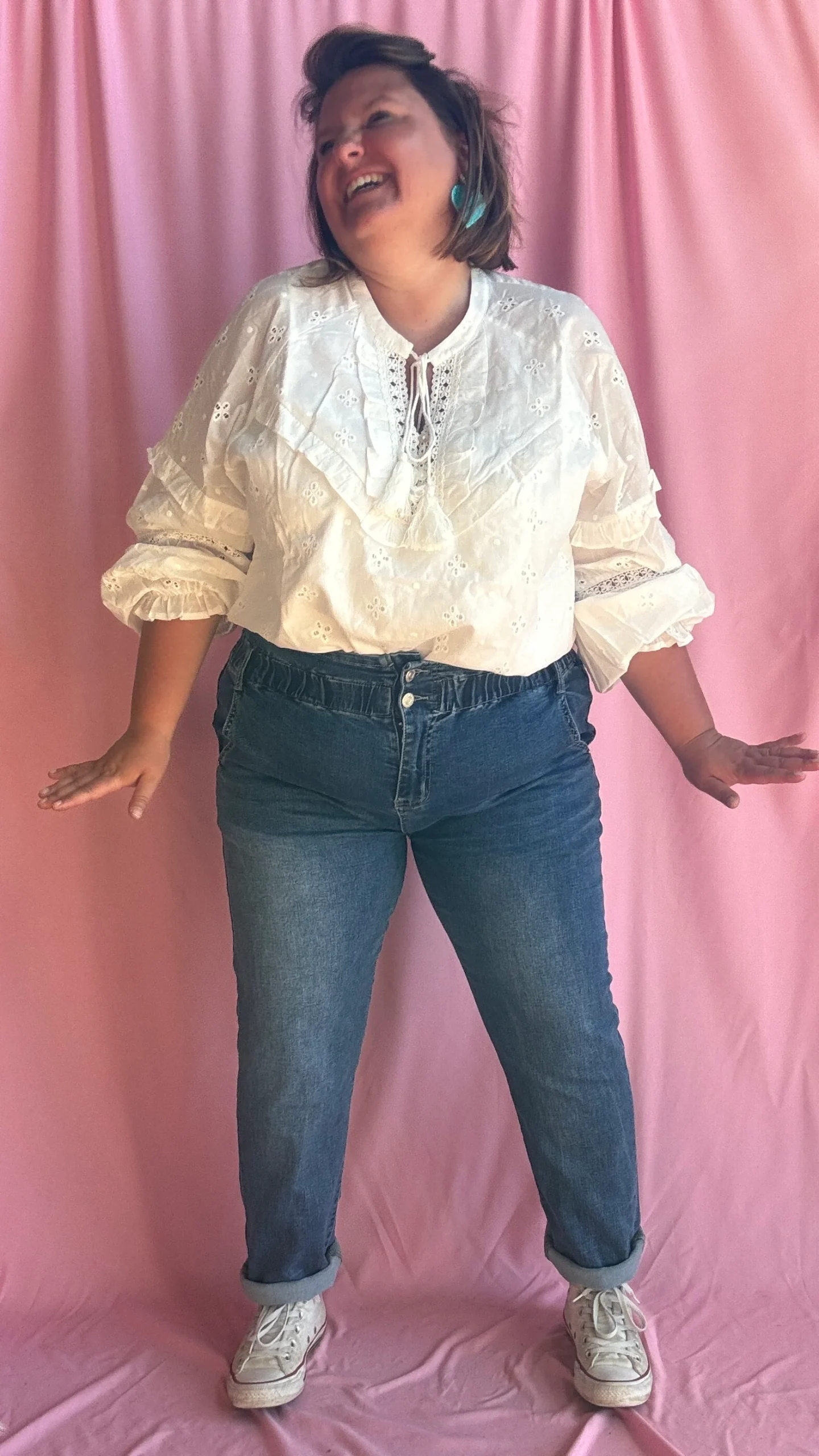 Blouse Angela – grande taille blanche manche longue détail froufrou et dentelle