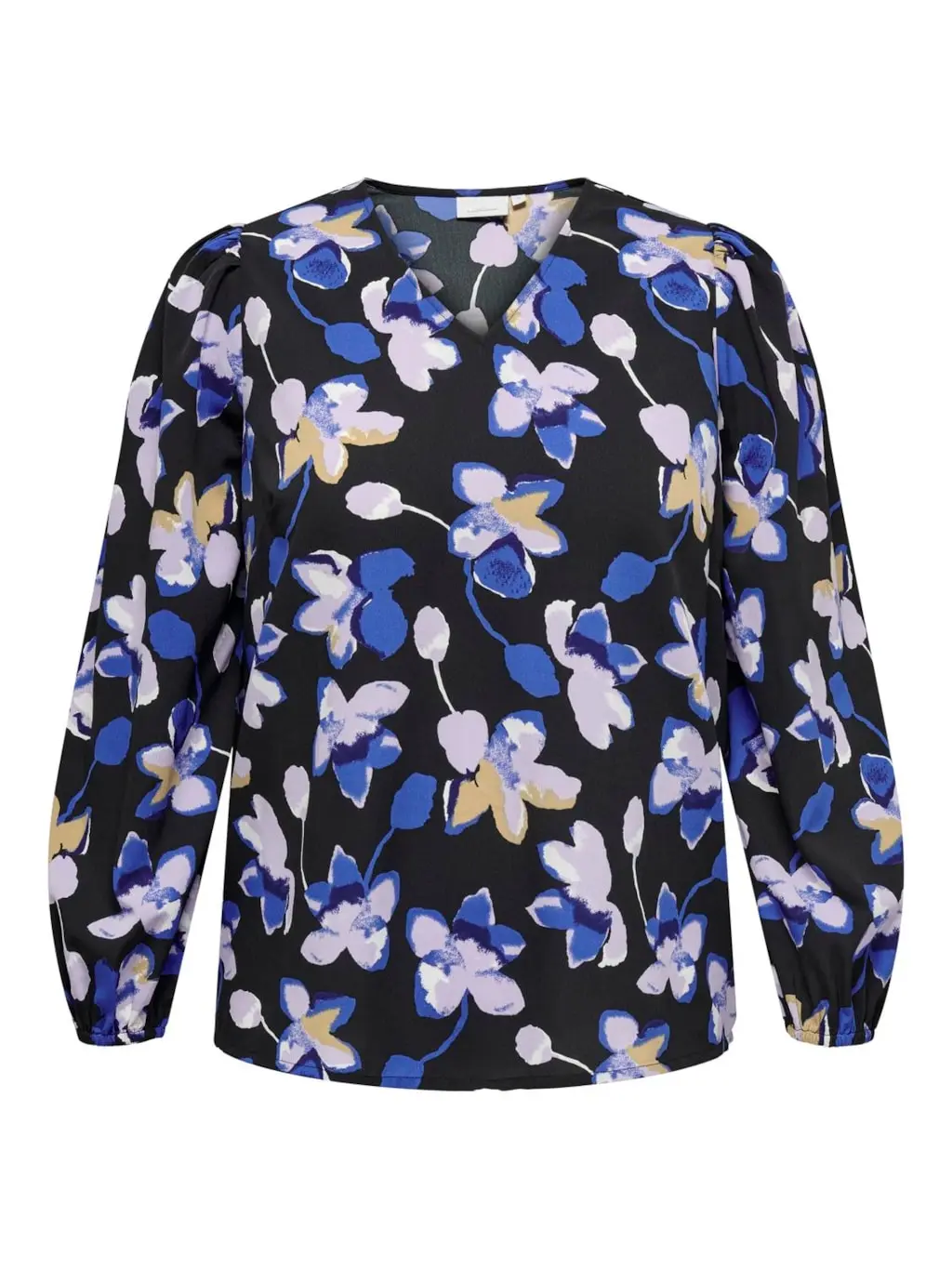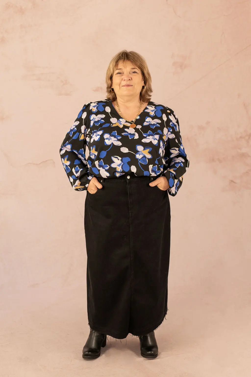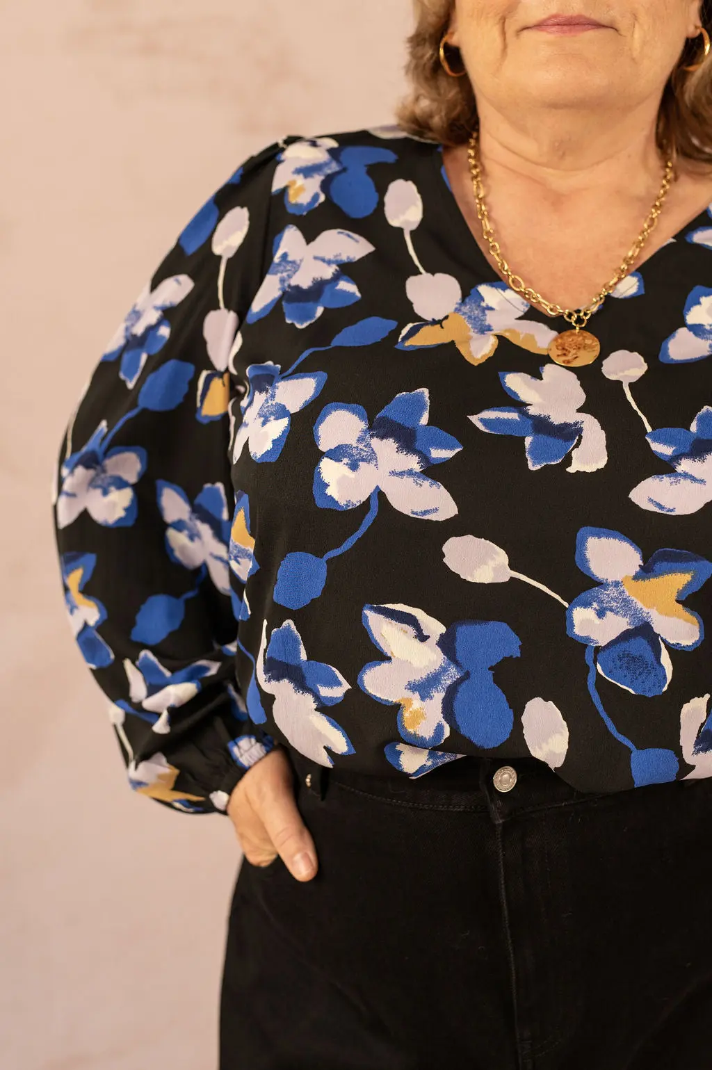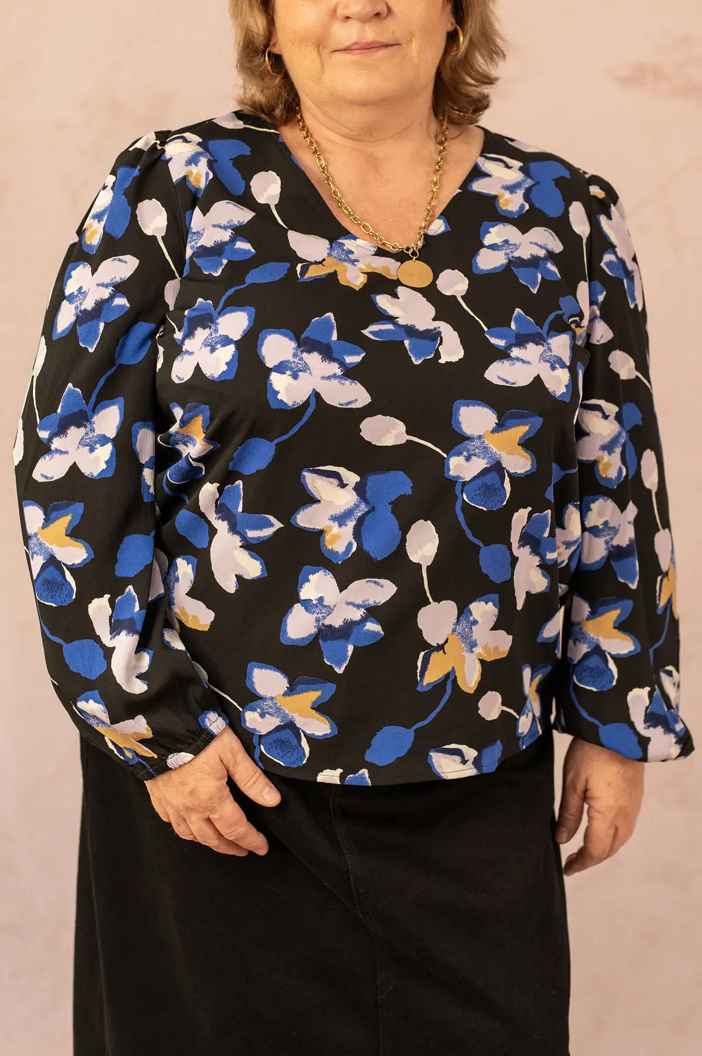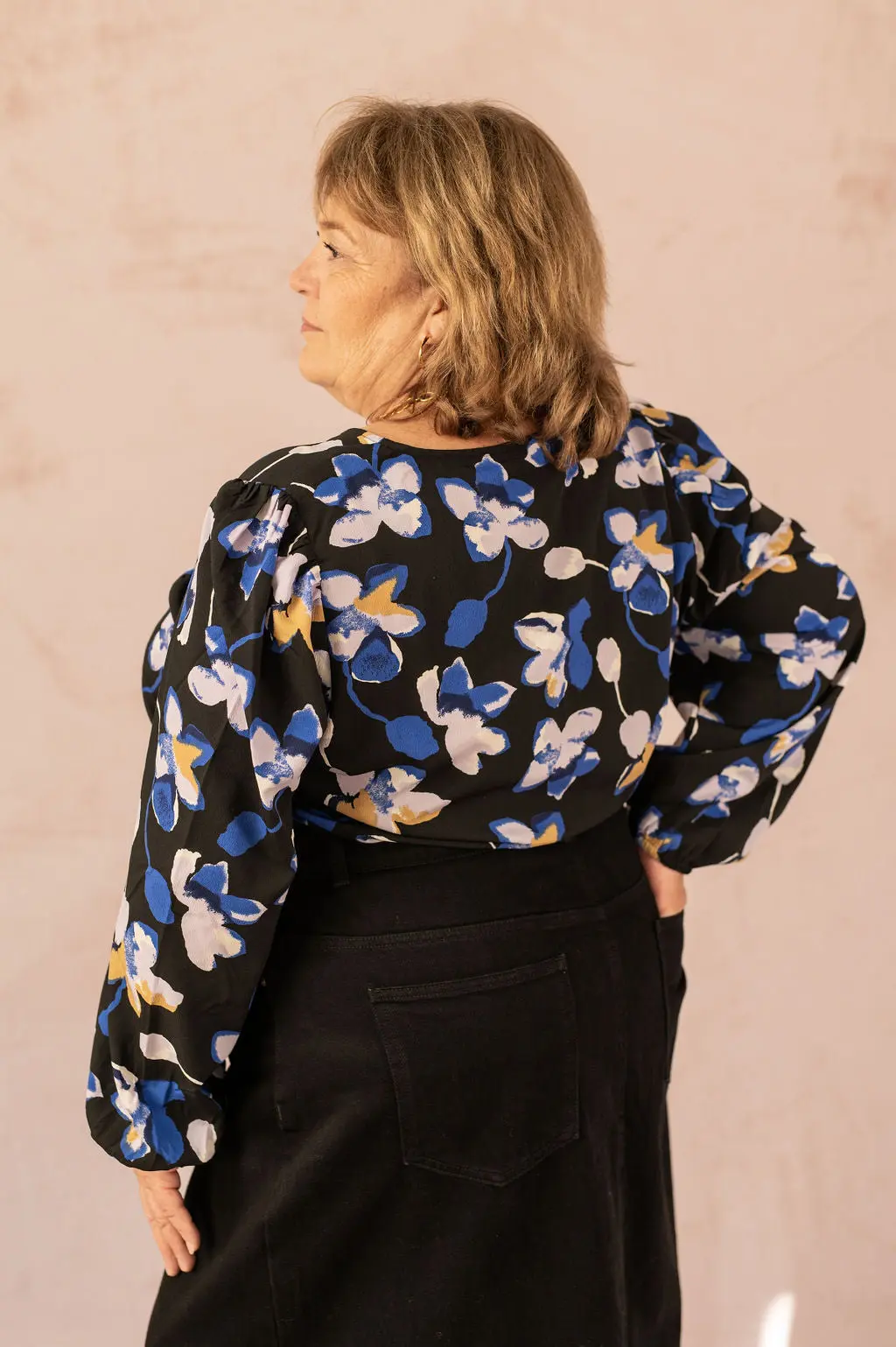 La blouse Aster, avec son imprimé floral éclatant, est l’ajout parfait à votre garde-robe. Ses motifs floraux dans des tons de bleu, parme clair et jaune sur fond noir apportent fraîcheur et modernité. Confectionnée dans un tissu fluide et léger, elle offre une coupe flatteuse qui met en valeur les courbes. Le col en V et les manches bouffantes ajoutent une touche d’élégance discrète, idéale pour un look quotidien ou plus sophistiqué.