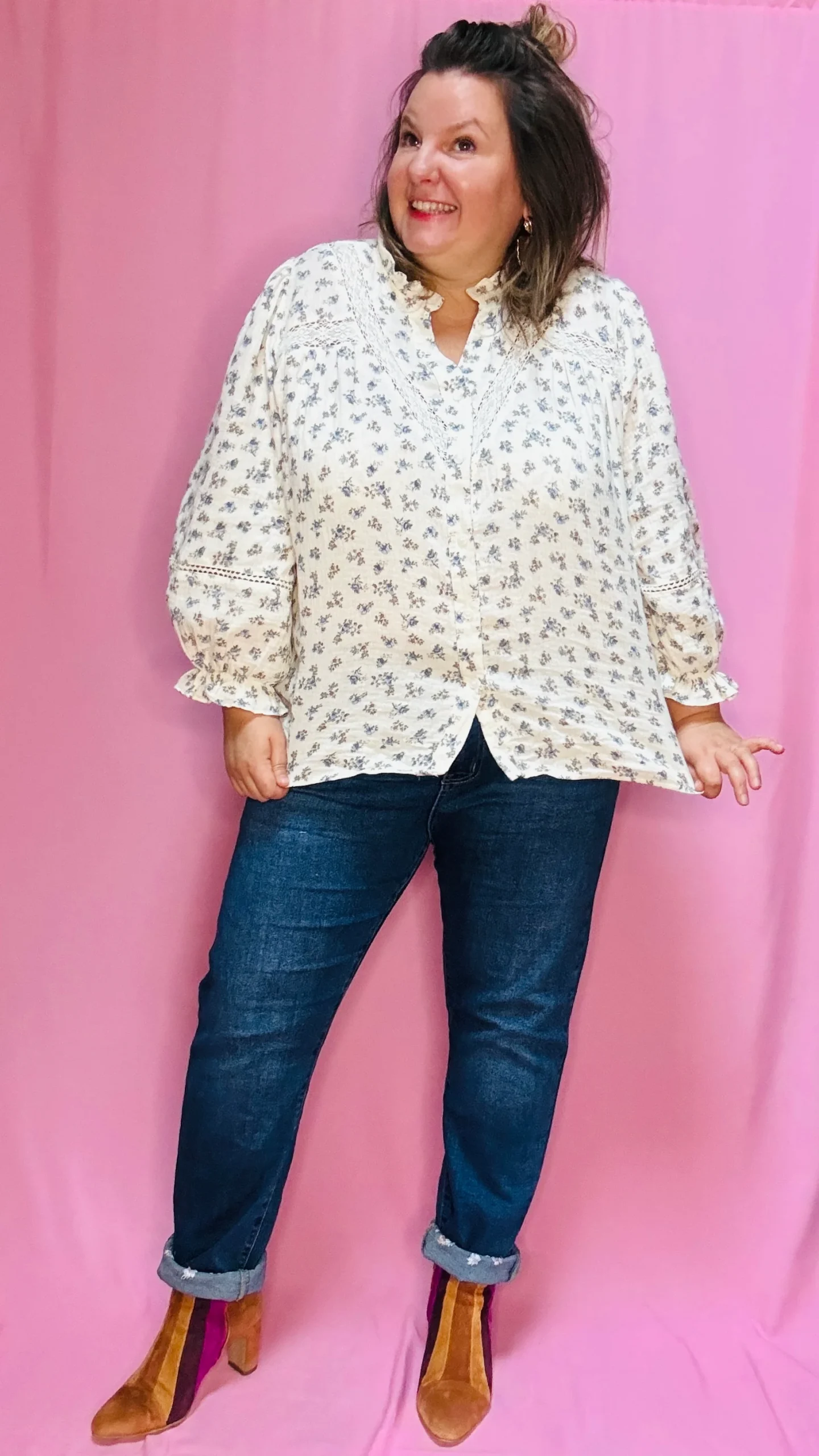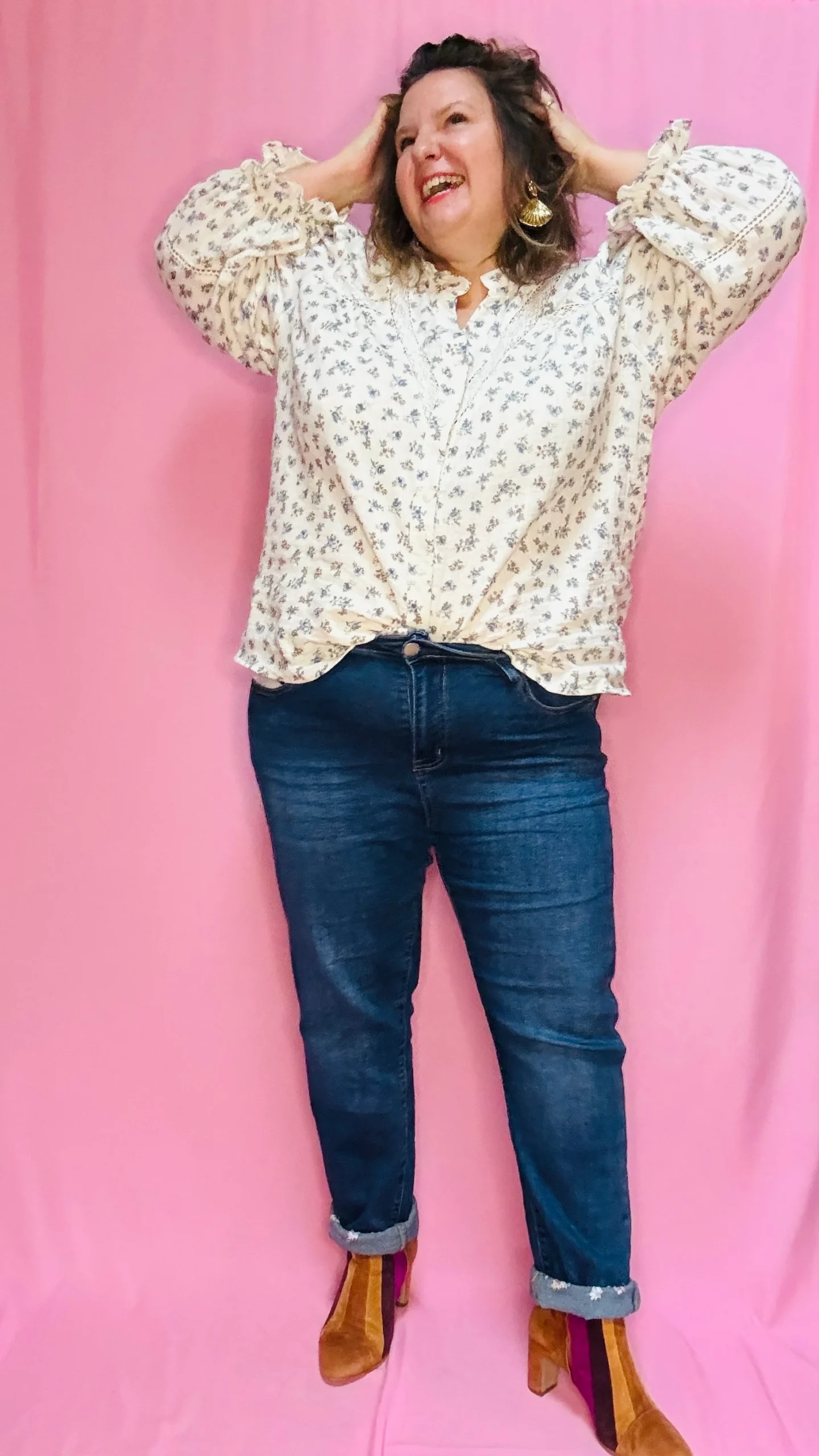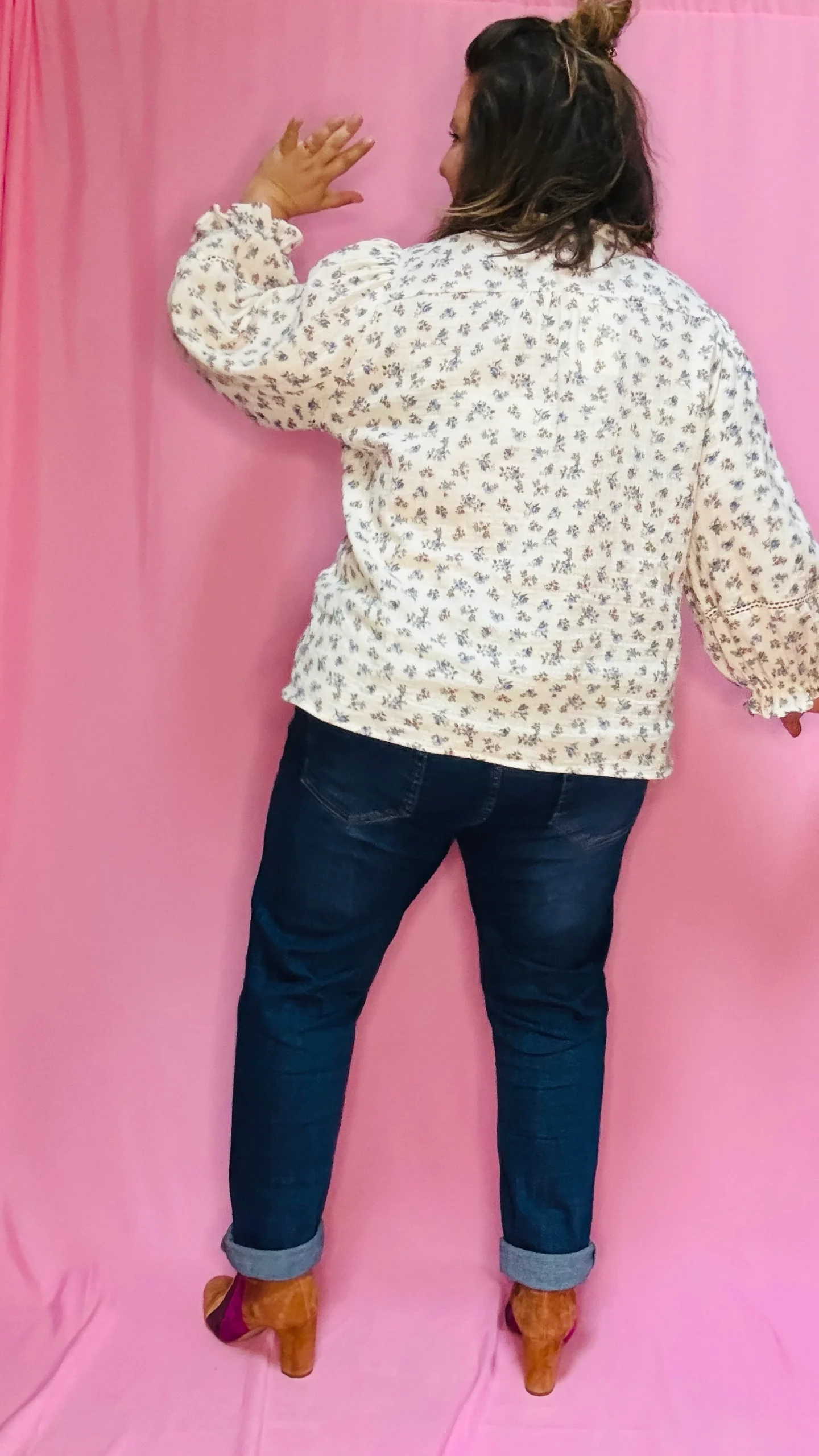 Blouse Berthe- grande taille manche longue liberty beige et bleu