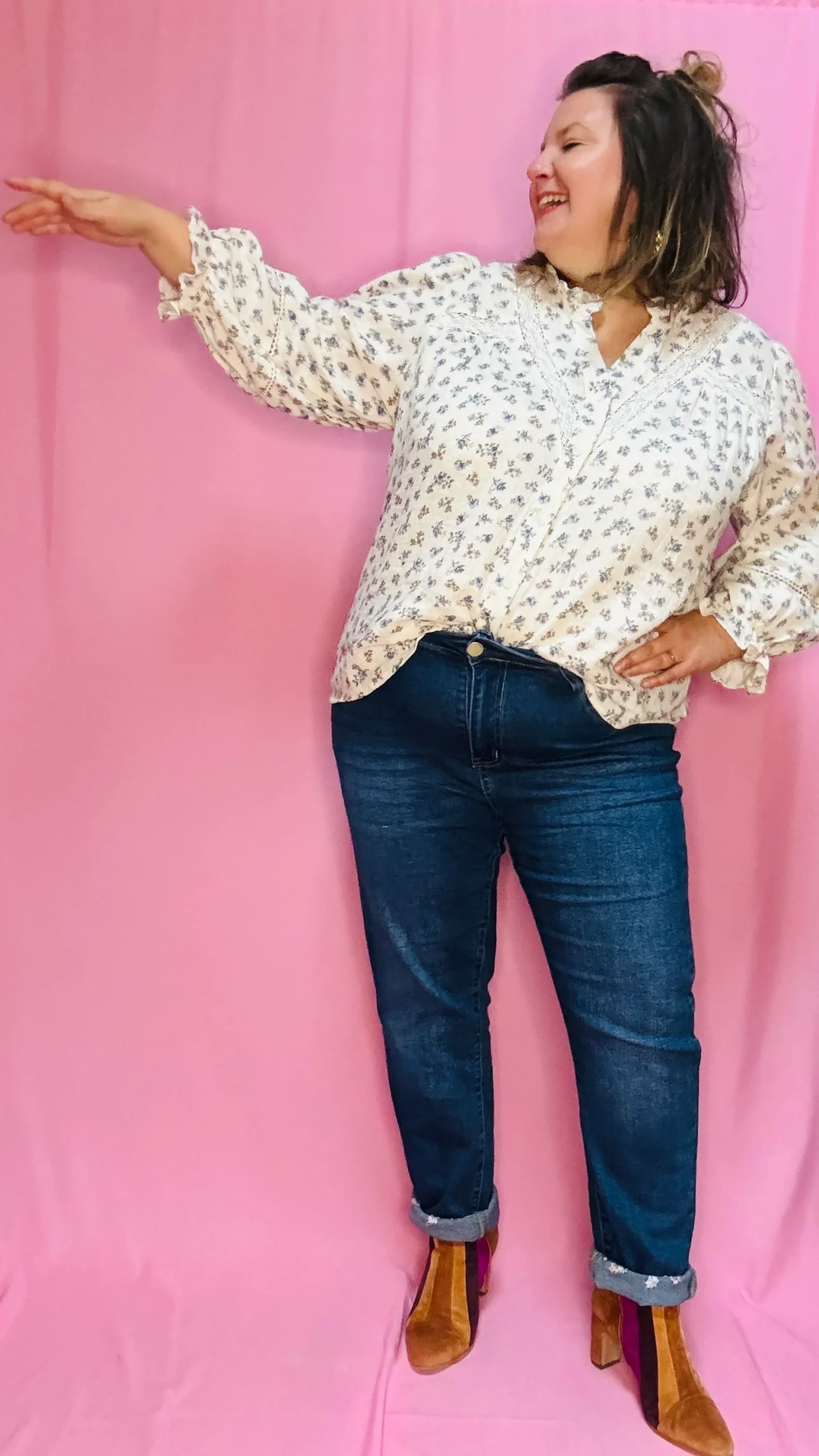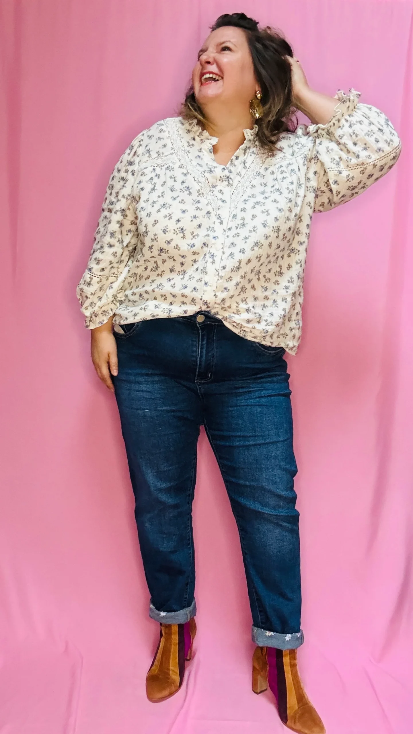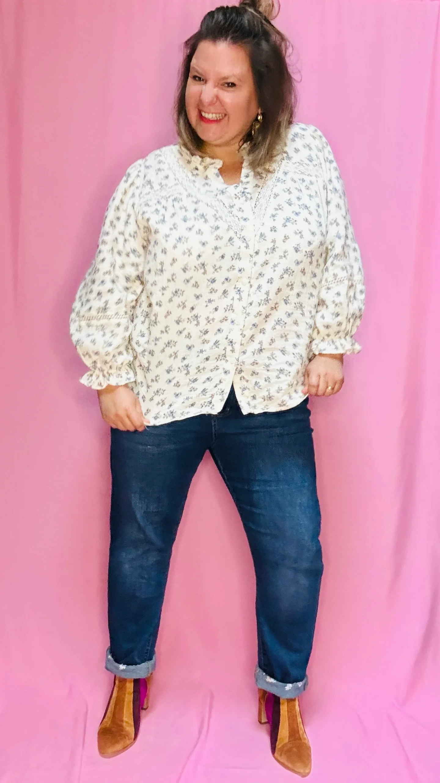 Blouse Berthe- grande taille manche longue liberty beige et bleu