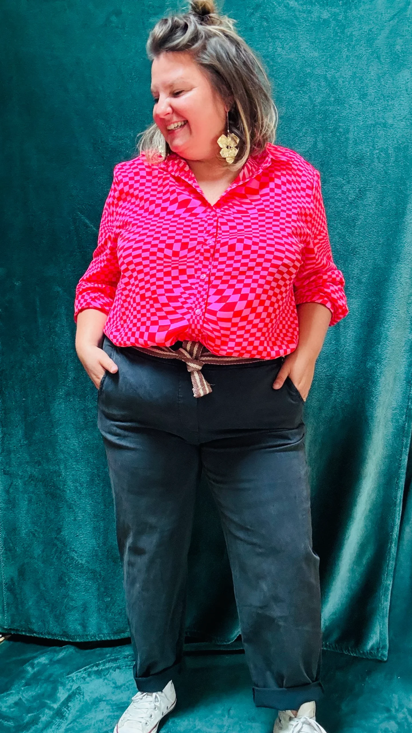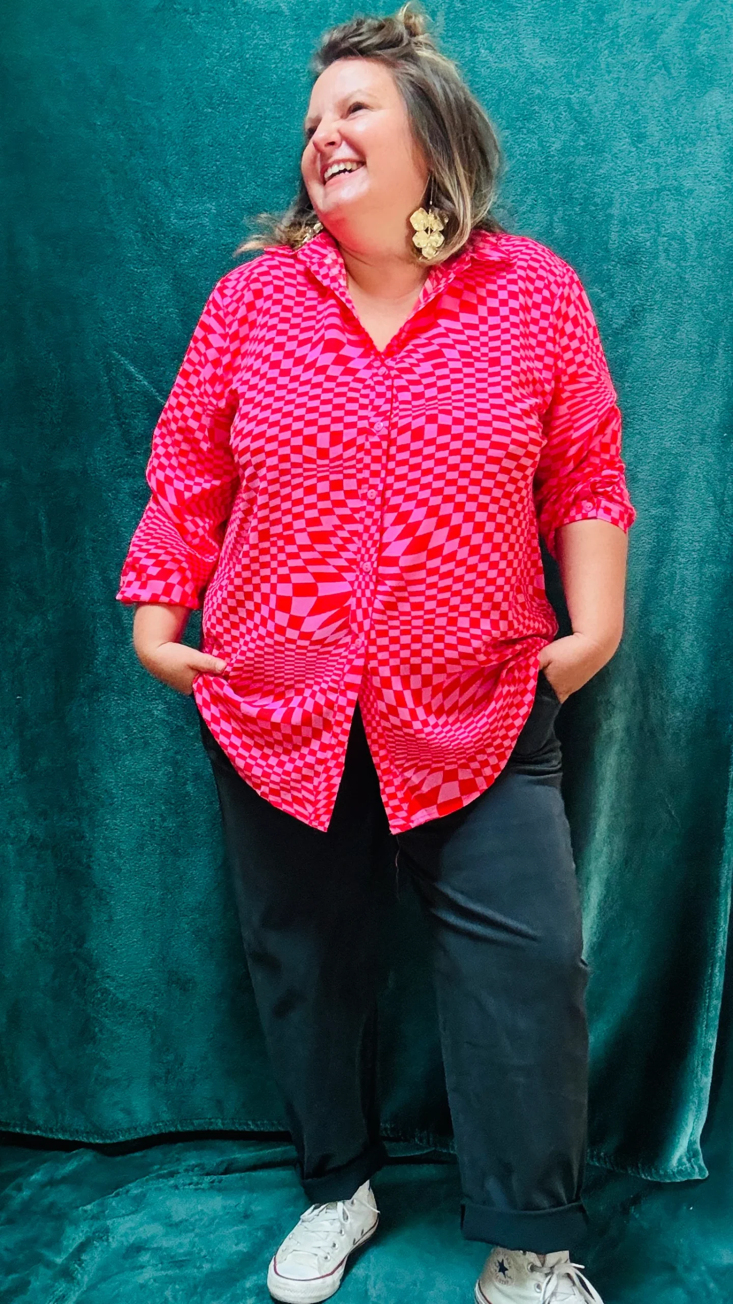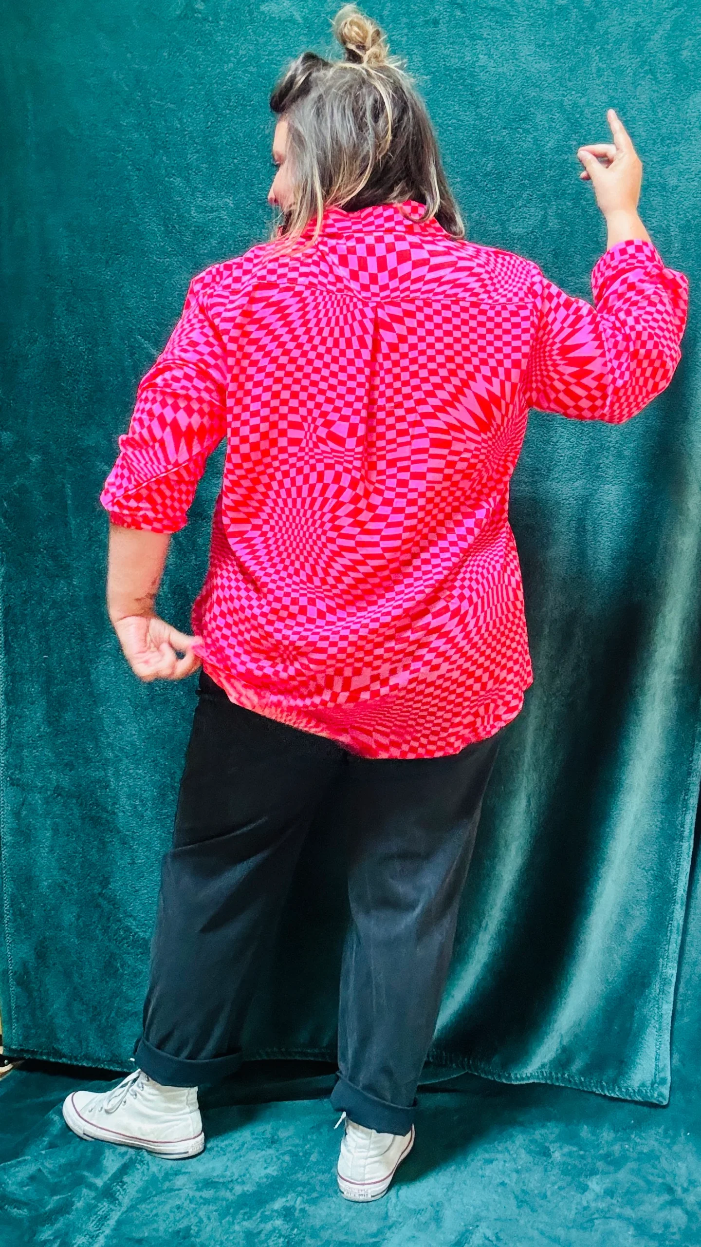 Apportez de la couleur et de l’originalité à votre garde-robe avec cette blouse grande taille aux motifs géométriques et psychédéliques. Disponible en deux combinaisons éclatantes : rose et rouge ou rose et verte, elle est la pièce idéale pour un style créatif et audacieux. Boutonnée sur toute la longueur avec un col chemise classique, elle offre un confort optimal grâce à sa matière en polyester légère et agréable.