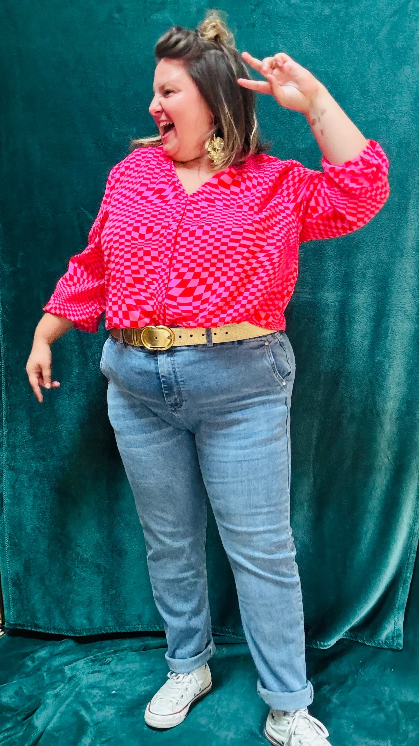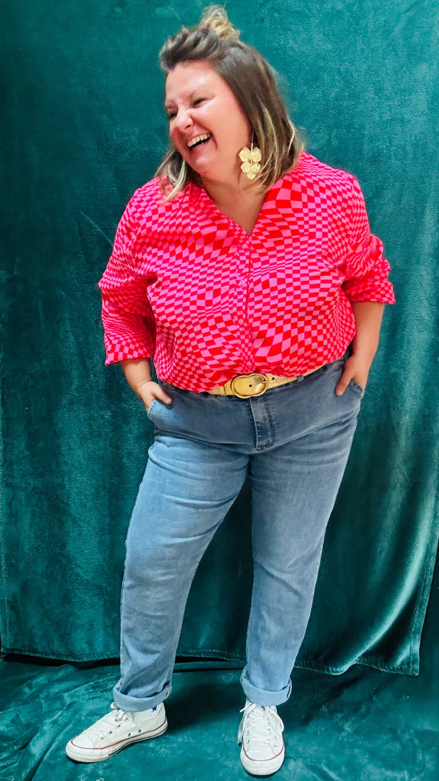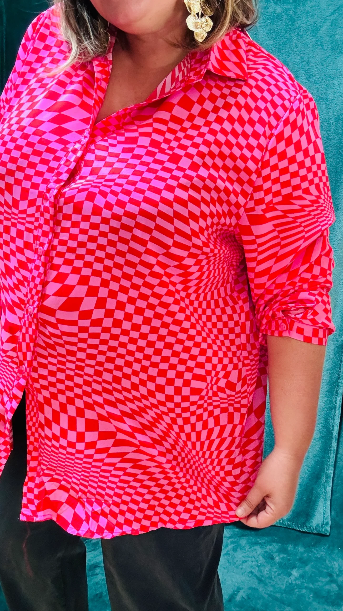 Apportez de la couleur et de l’originalité à votre garde-robe avec cette blouse grande taille aux motifs géométriques et psychédéliques. Disponible en deux combinaisons éclatantes : rose et rouge ou rose et verte, elle est la pièce idéale pour un style créatif et audacieux. Boutonnée sur toute la longueur avec un col chemise classique, elle offre un confort optimal grâce à sa matière en polyester légère et agréable.
