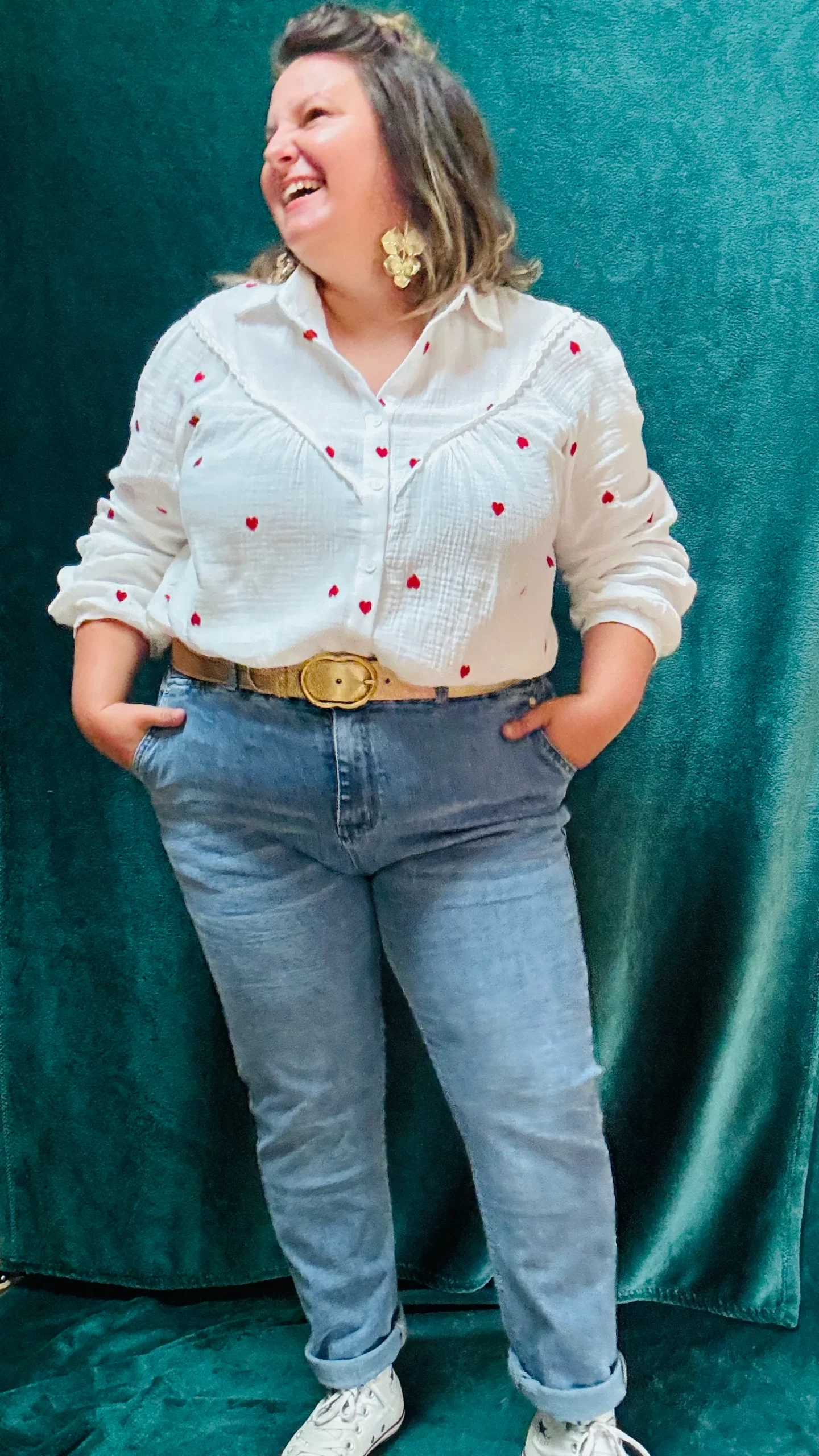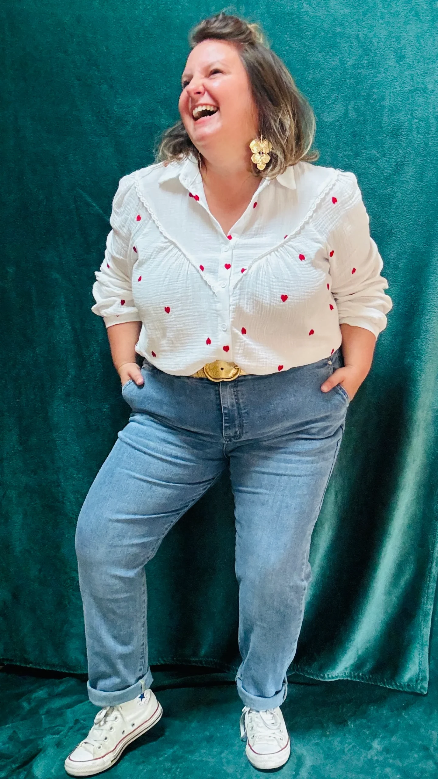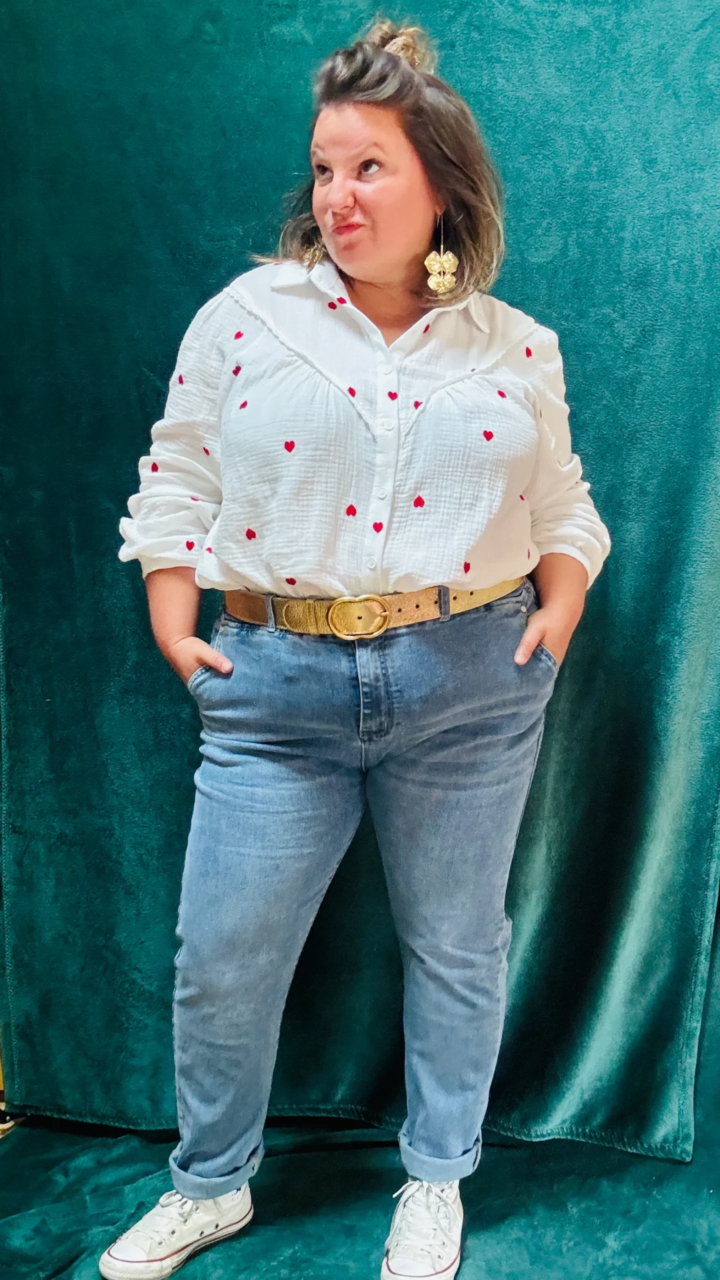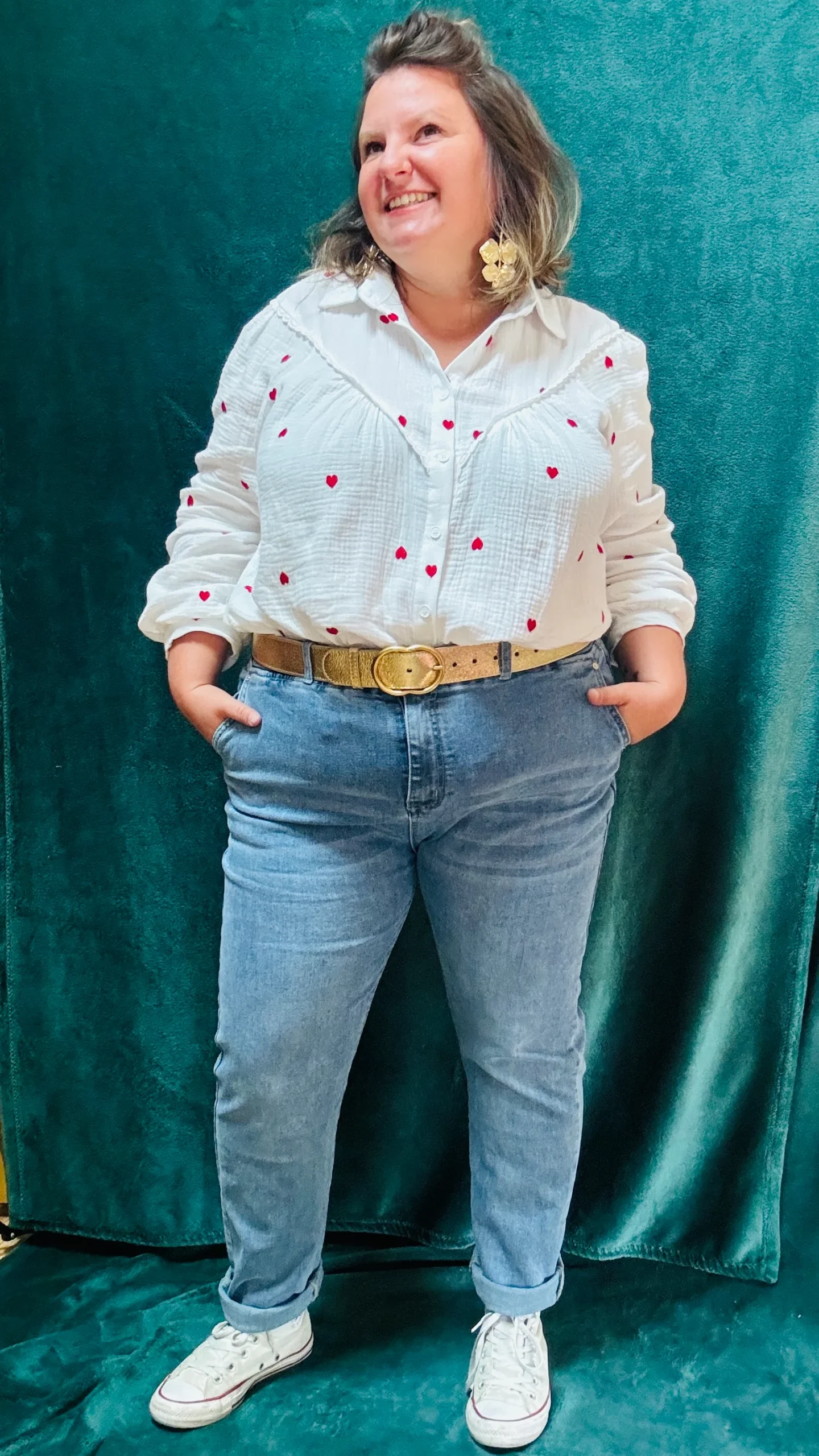 Blouse Valentine- grande taille manche longue gaze de coton blanche motifs coeurs rouges