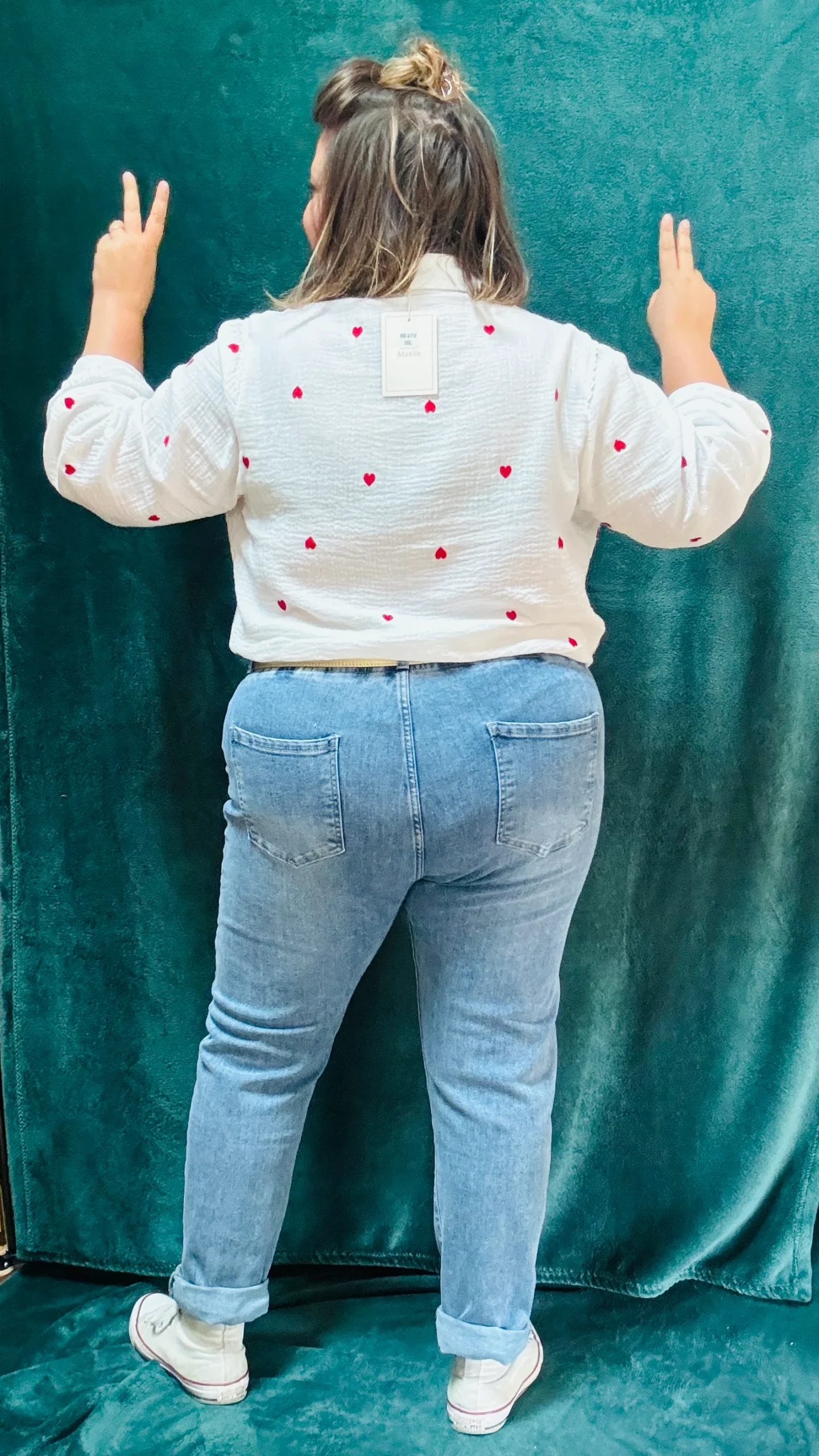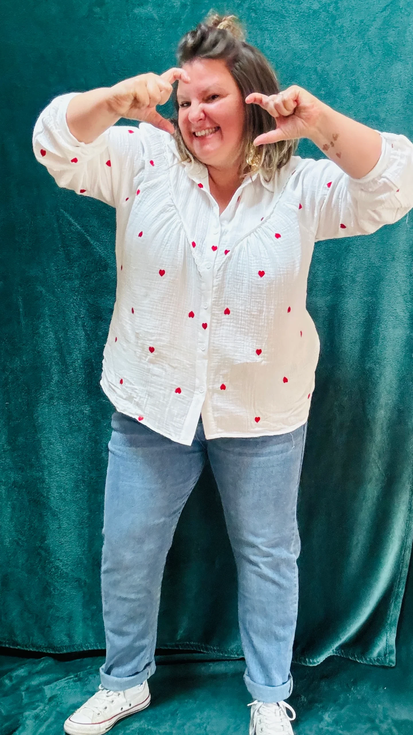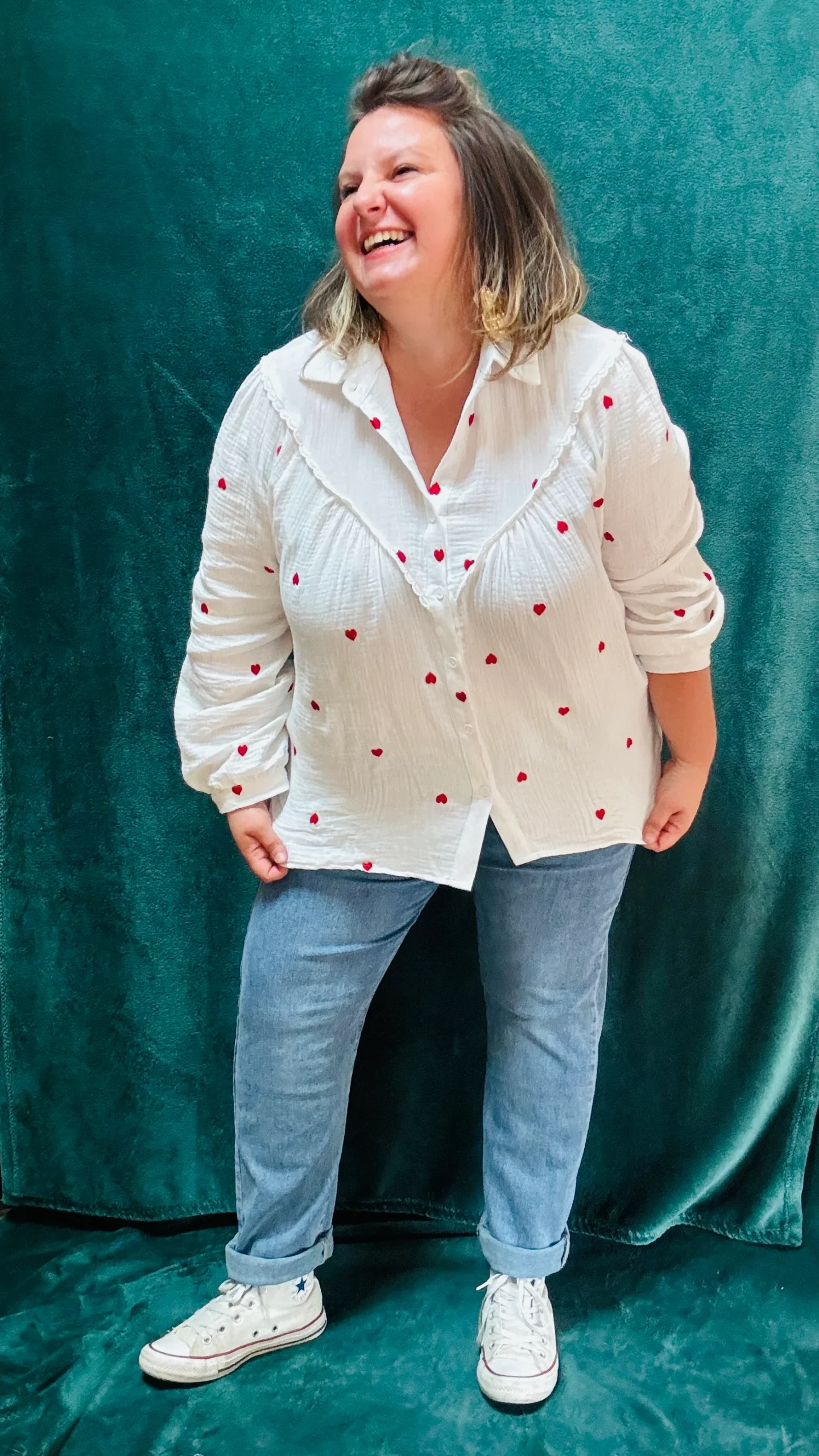 Chemise grande taille en gaze de coton blanche à cœurs rouges : romantique et créative.