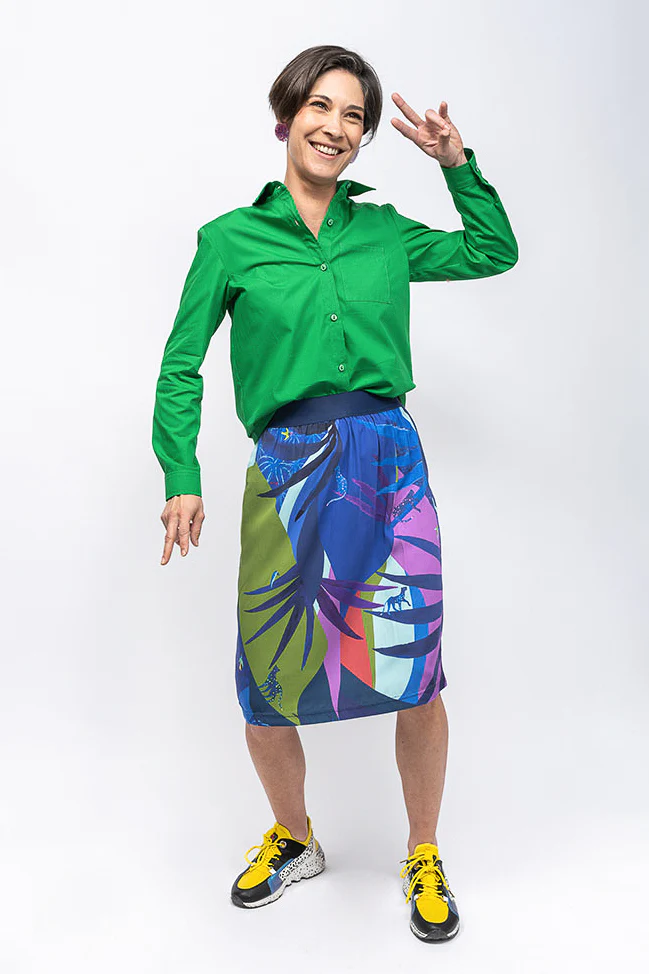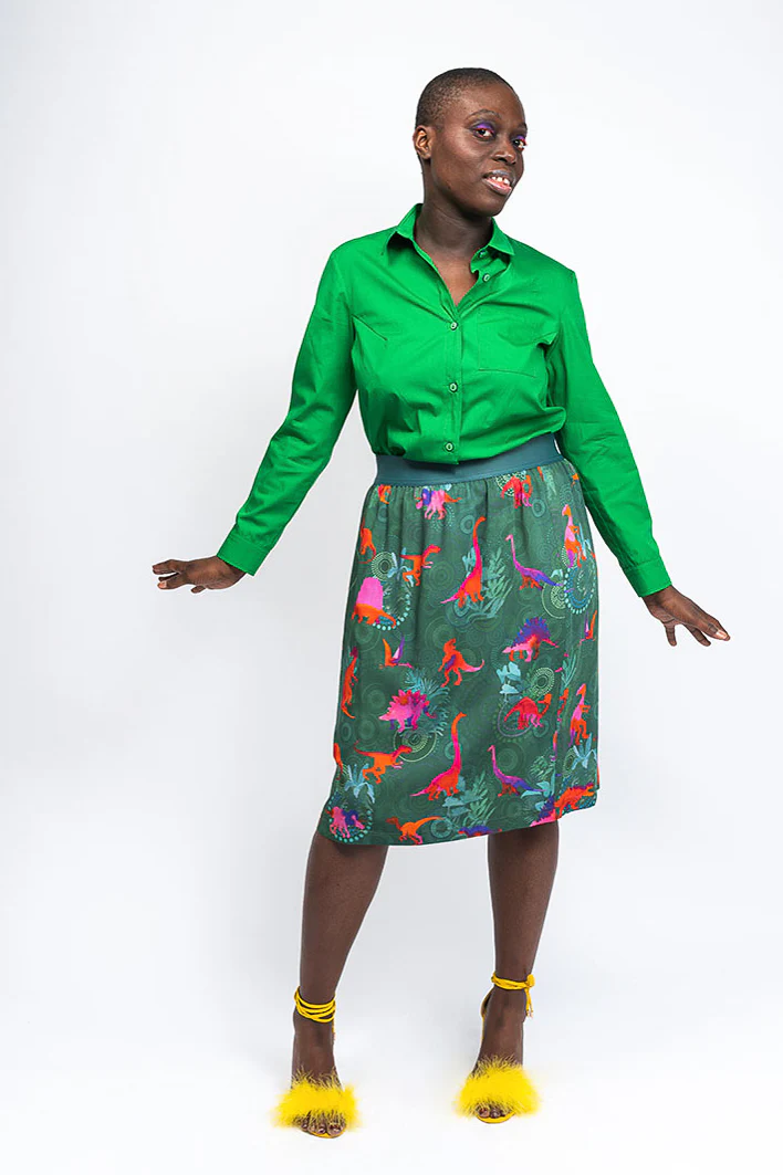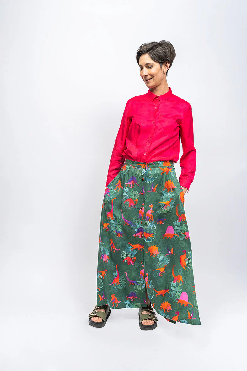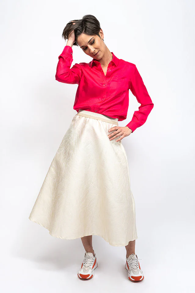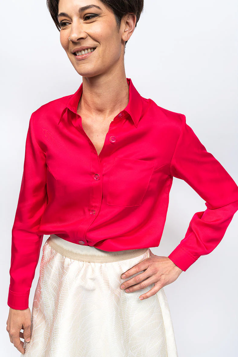 Ces bodies unis sont coupées dans des tissus upcyclés issus de fins de rouleaux, en twill de soie pour la version rose, et en popeline de coton pour la version verte.