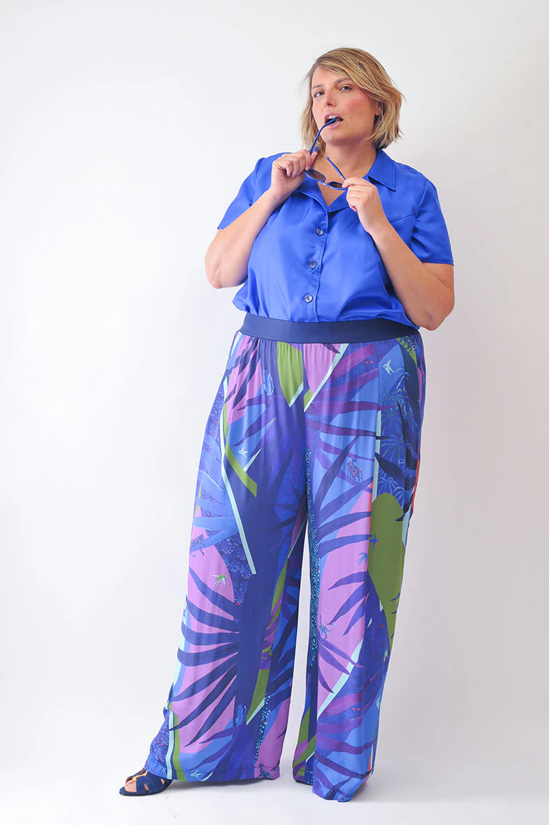 Caroline mesure 1m78 et porte le Body uni « Chemise Hawaïenne » dans une couleur bleu électrique et une taille sur mesure cousue pour elle.