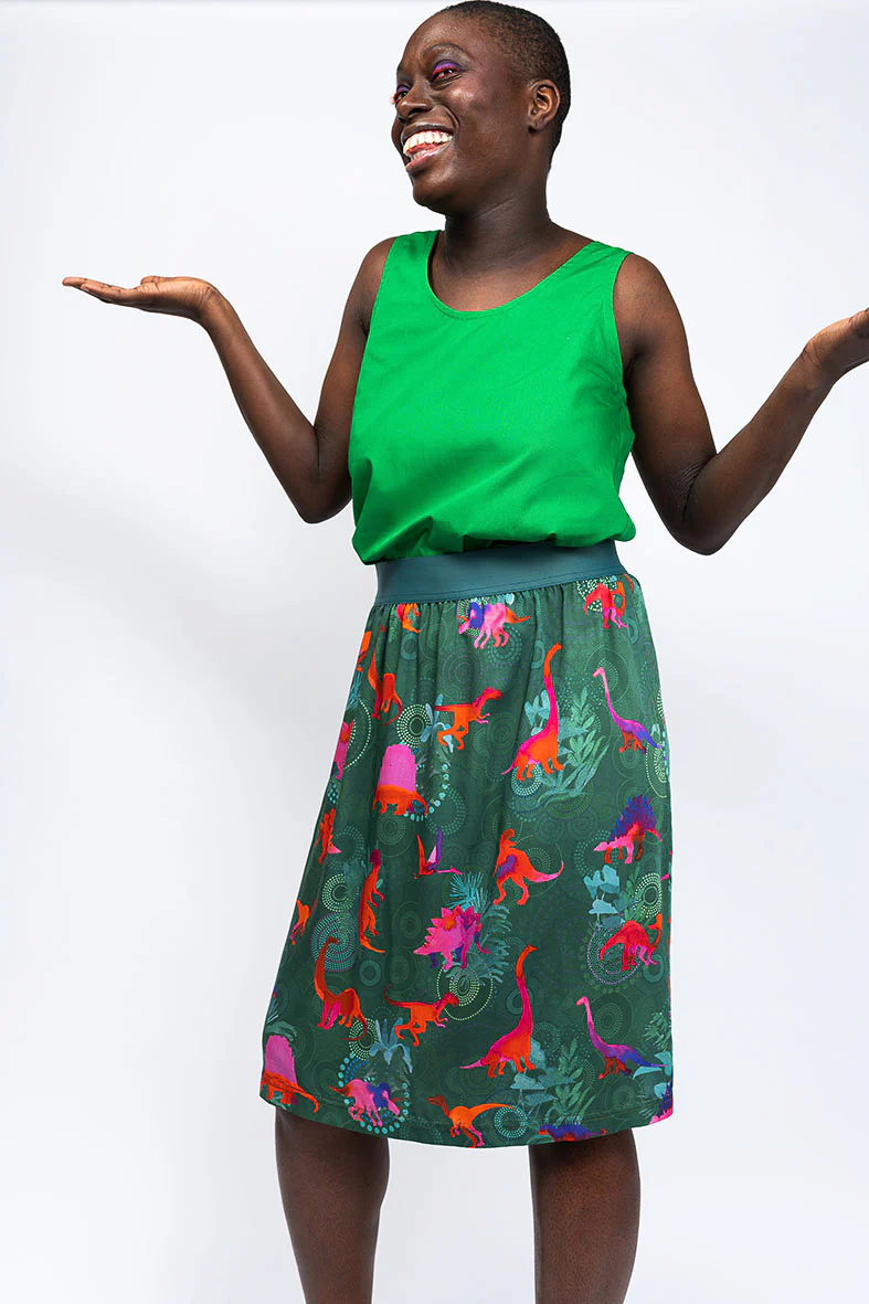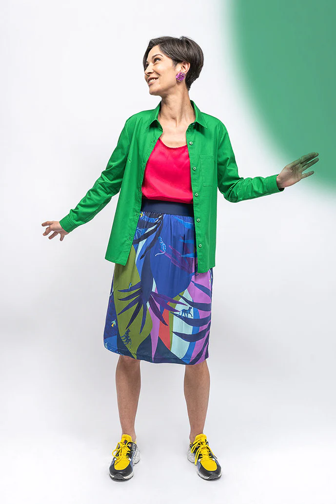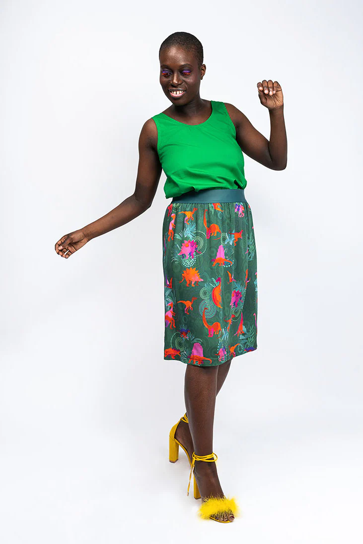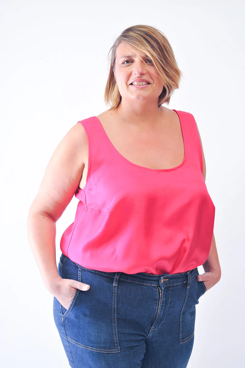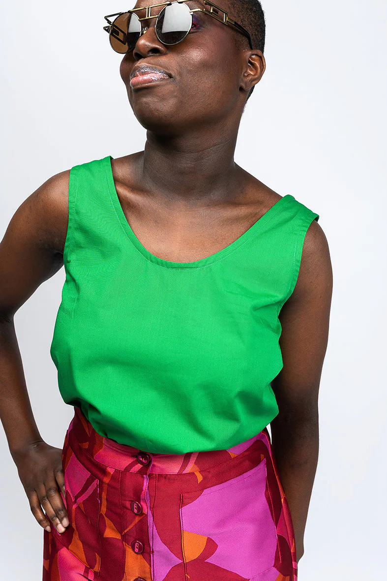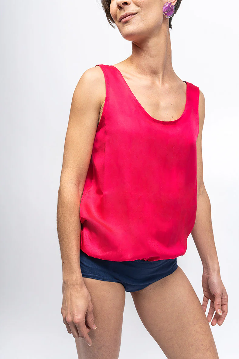 Ces bodies unis sont coupées dans des tissus upcyclés issus de fins de rouleaux, en twill de soie pour la version rose, et en popeline de coton pour la version verte.