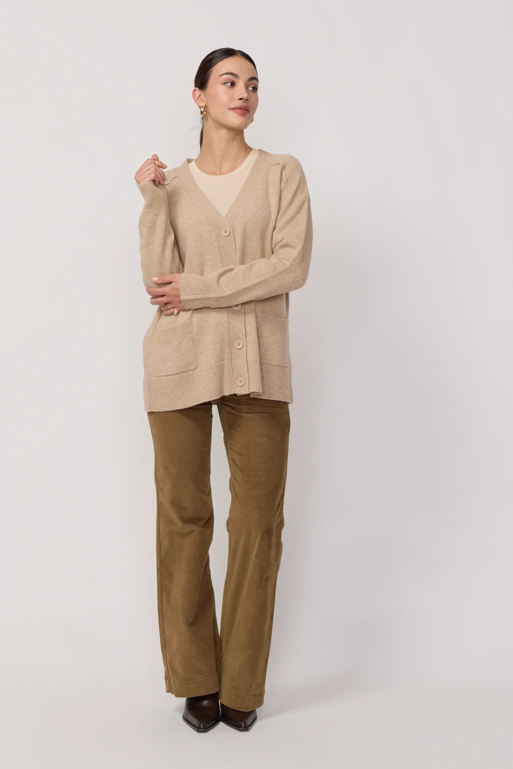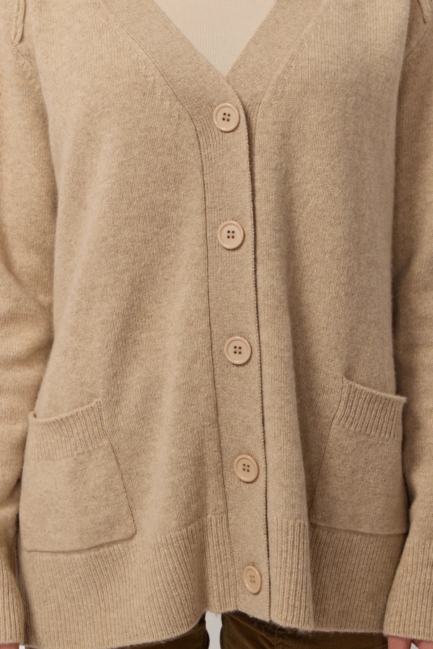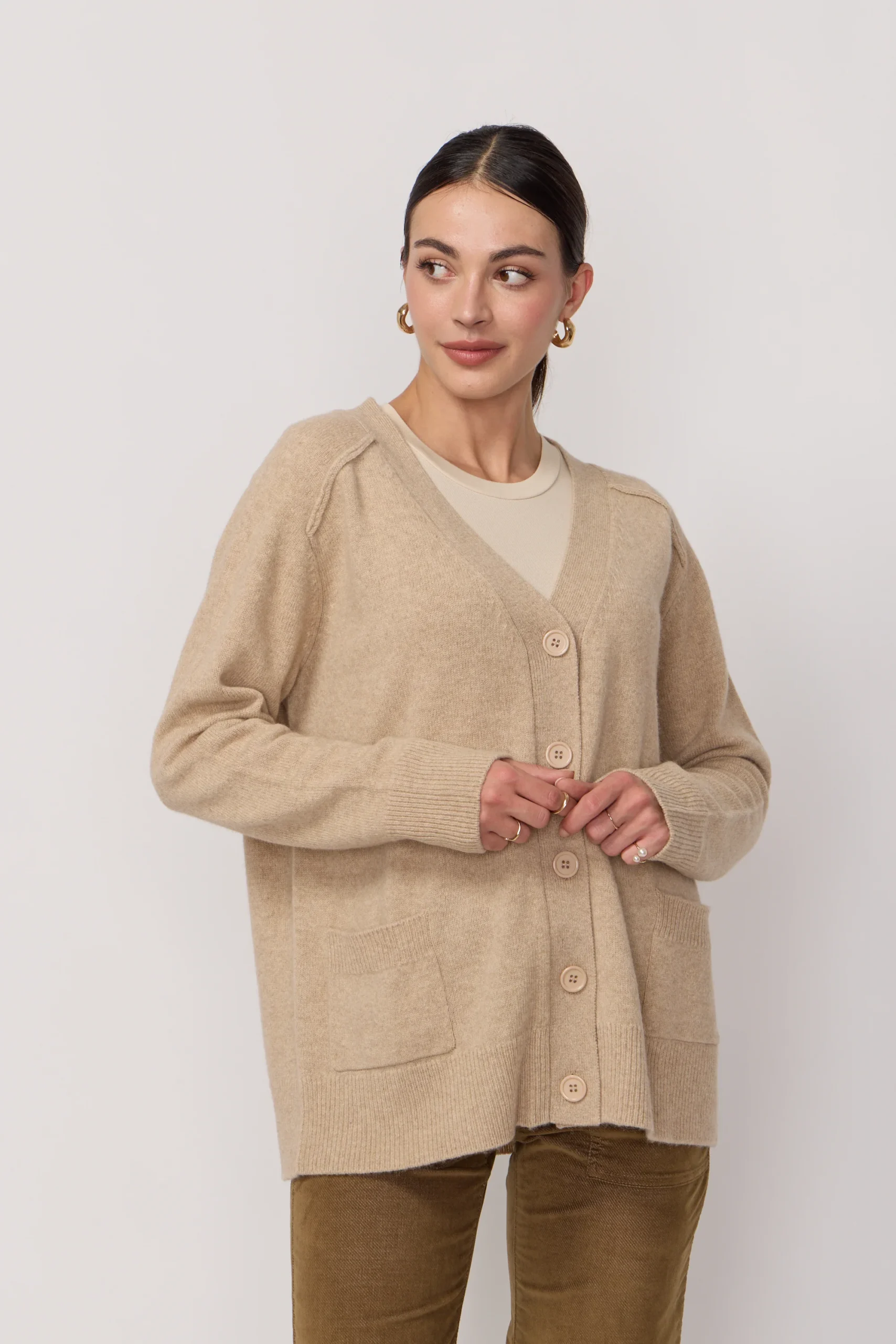 Ce cardigan oversize à coupe droite présente des manches tombantes avec des emmanchures sans coutures pour un confort pour une silhouette décontractée. Le col en V et les détails de couture sur les épaules, ainsi que les bordures côtelées du col, des manches et de l’ourlet donnent une touche de raffinement.