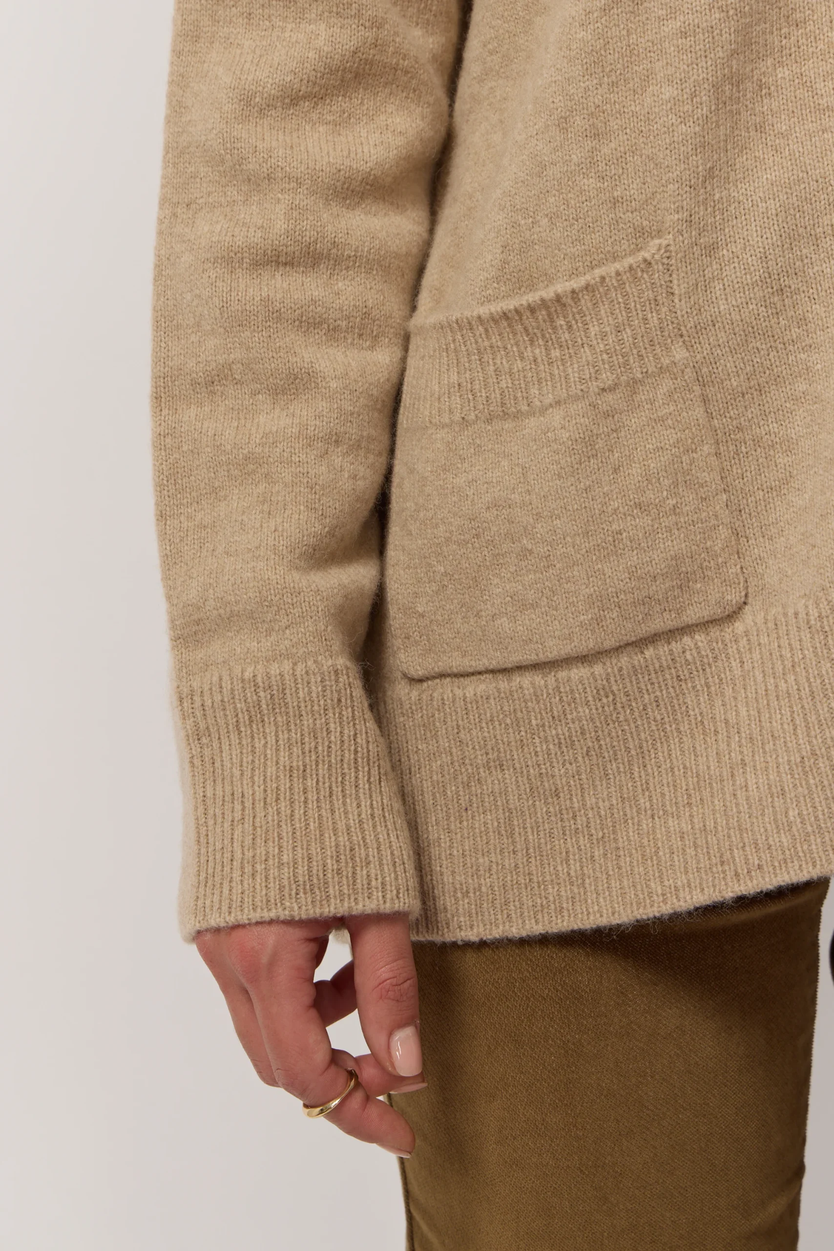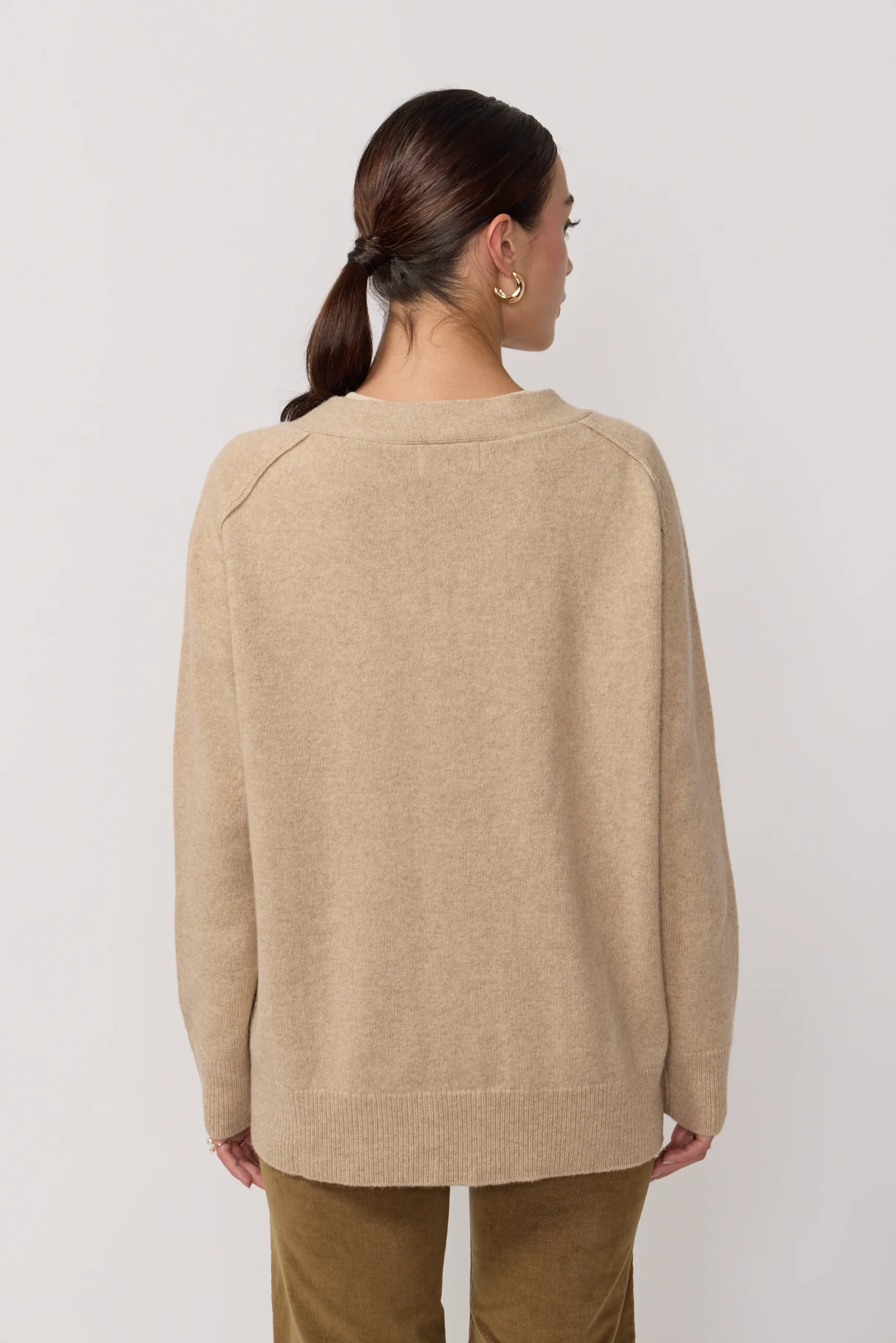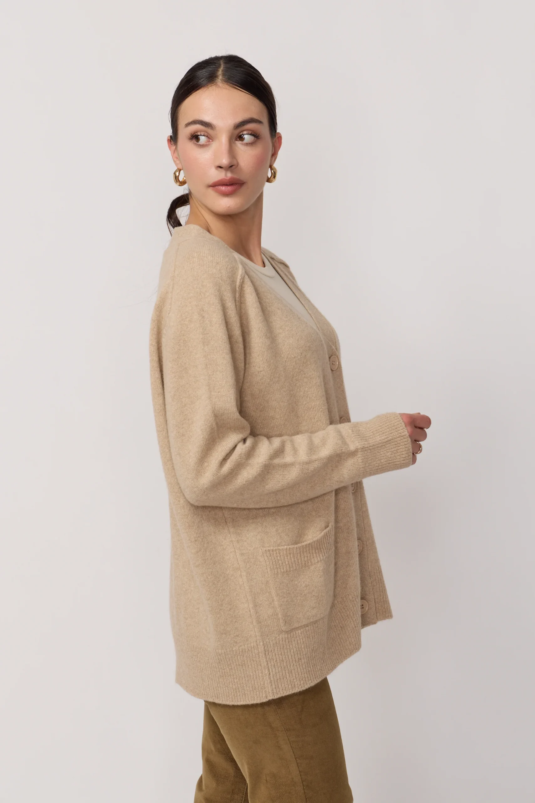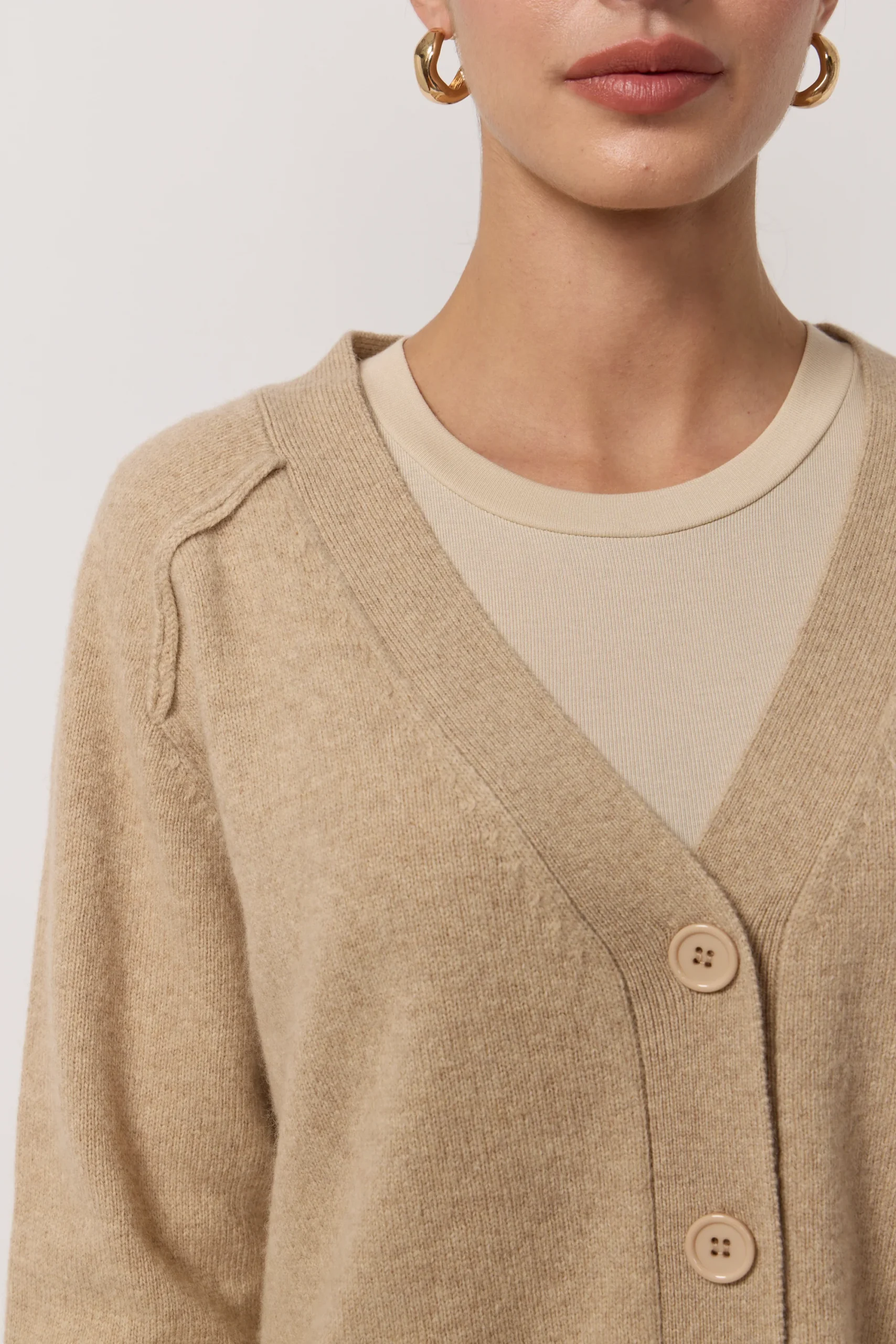 Ce cardigan oversize à coupe droite présente des manches tombantes avec des emmanchures sans coutures pour un confort pour une silhouette décontractée. Le col en V et les détails de couture sur les épaules, ainsi que les bordures côtelées du col, des manches et de l’ourlet donnent une touche de raffinement.