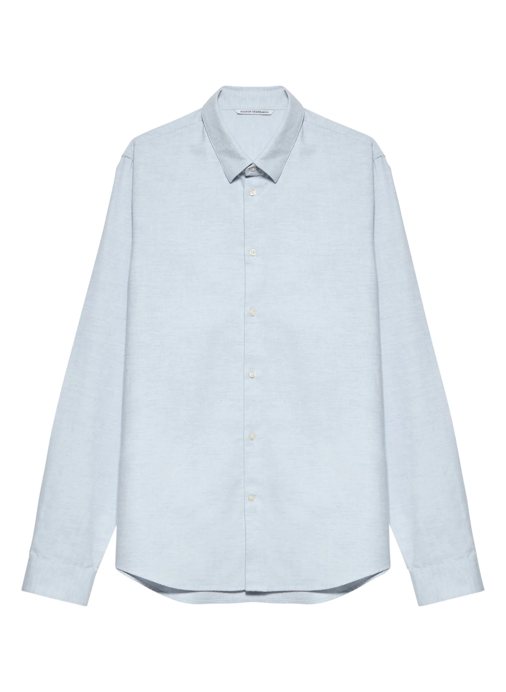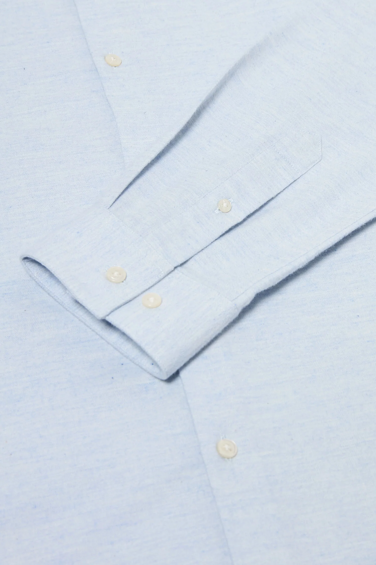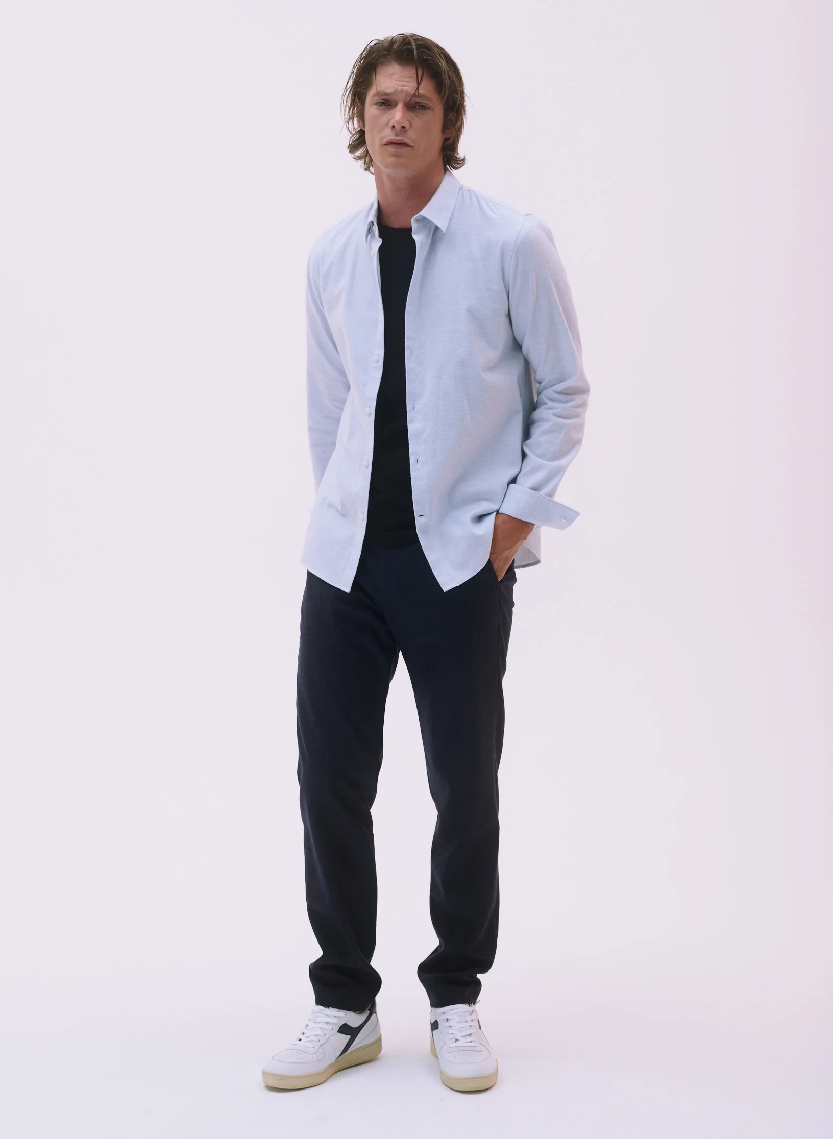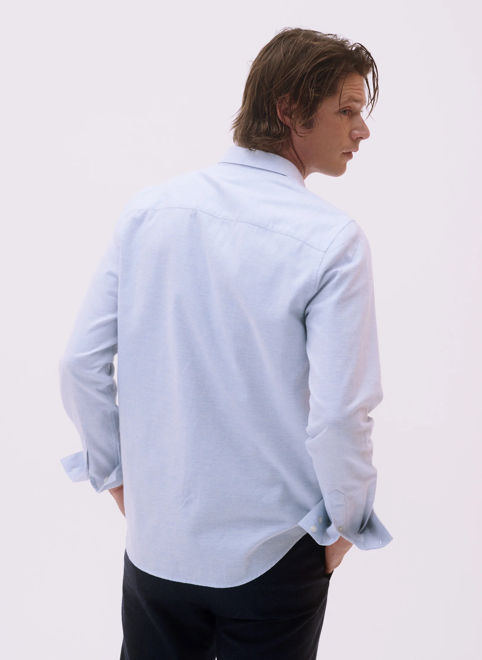 Notre chemise coupe ajustée intemporelle en flanelle. – Coupe ajustée, col rabattu à pied de col, détail de boutons cachés sous le col afin de le fixer – Fermeture par patte de boutonnage pliée – Poignets boutonnés avec patte capucin – Empiècement dos et bas liquette