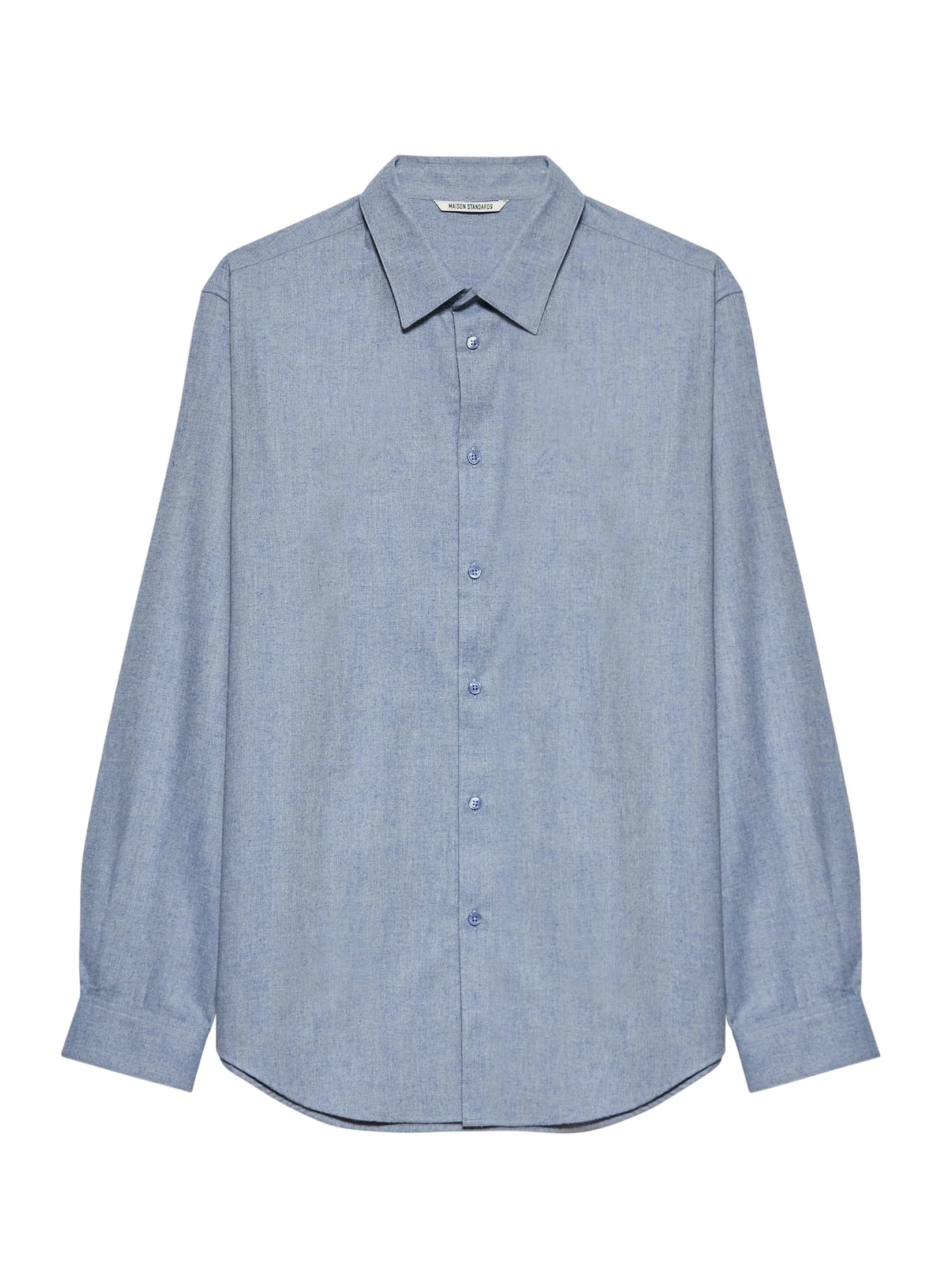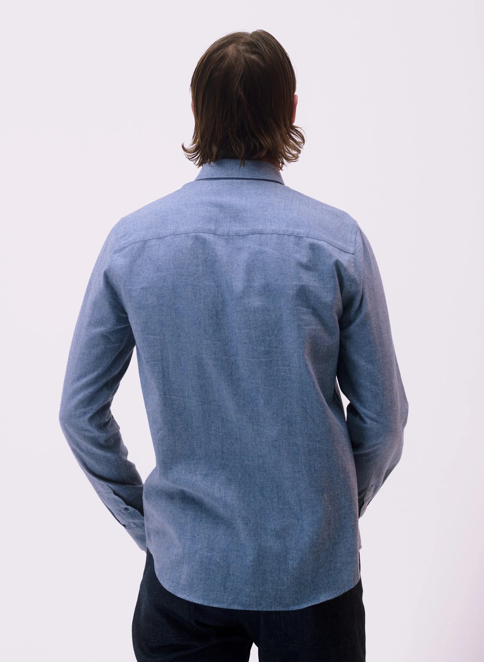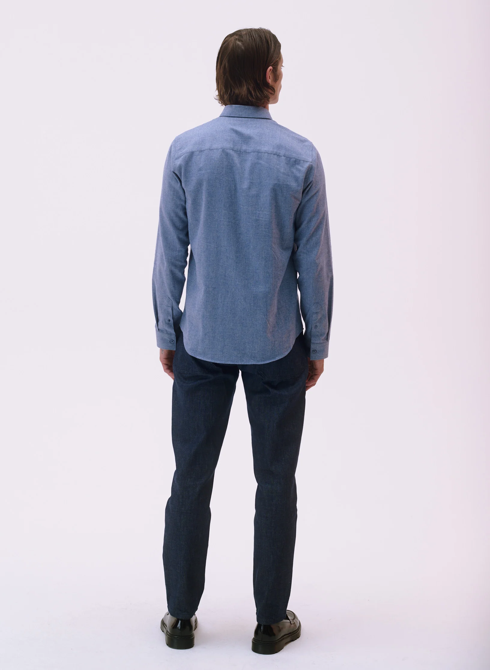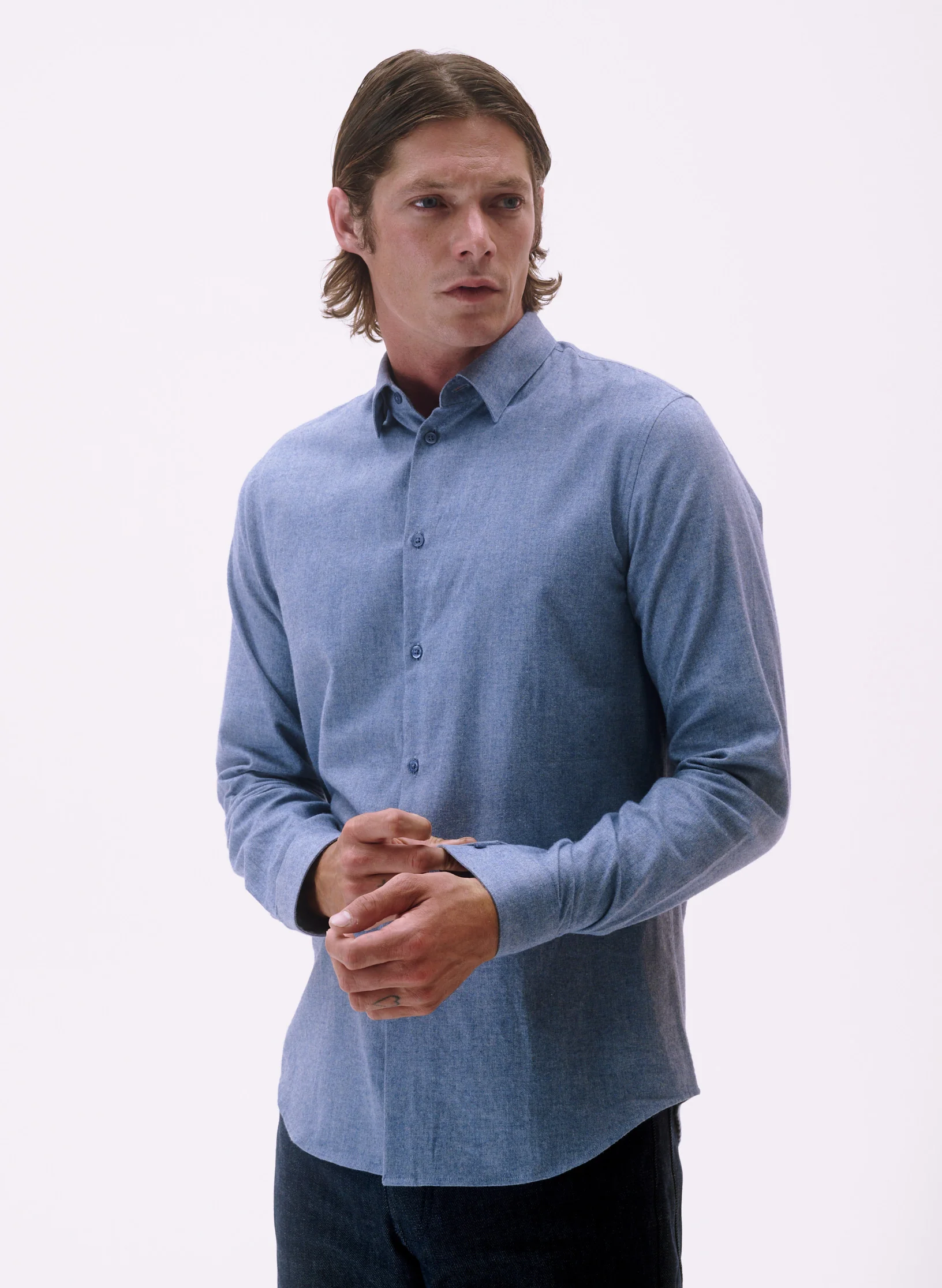Notre chemise coupe ajustée intemporelle en flanelle. – Coupe ajustée, col rabattu à pied de col, détail de boutons cachés sous le col afin de le fixer – Fermeture par patte de boutonnage pliée – Poignets boutonnés avec patte capucin – Empiècement dos et bas liquette