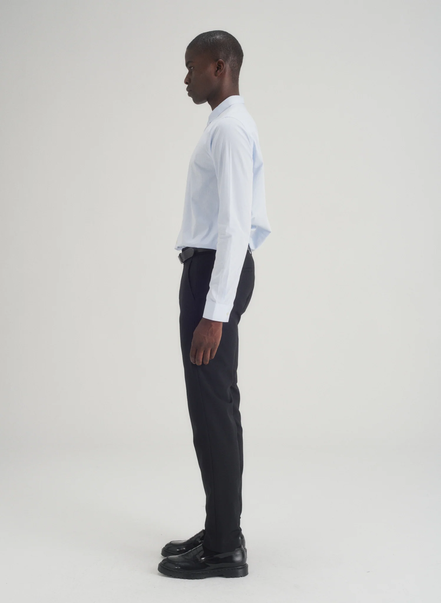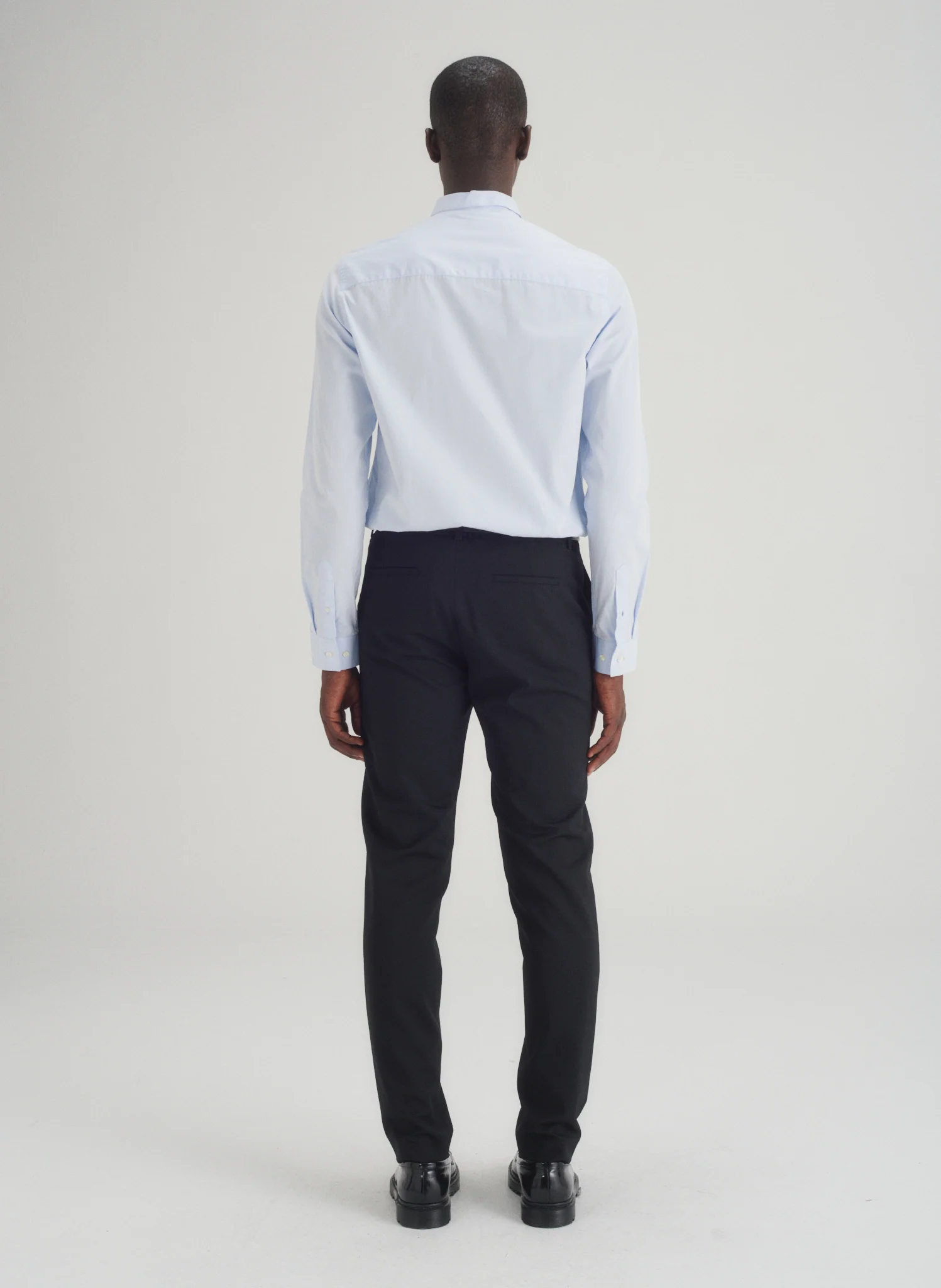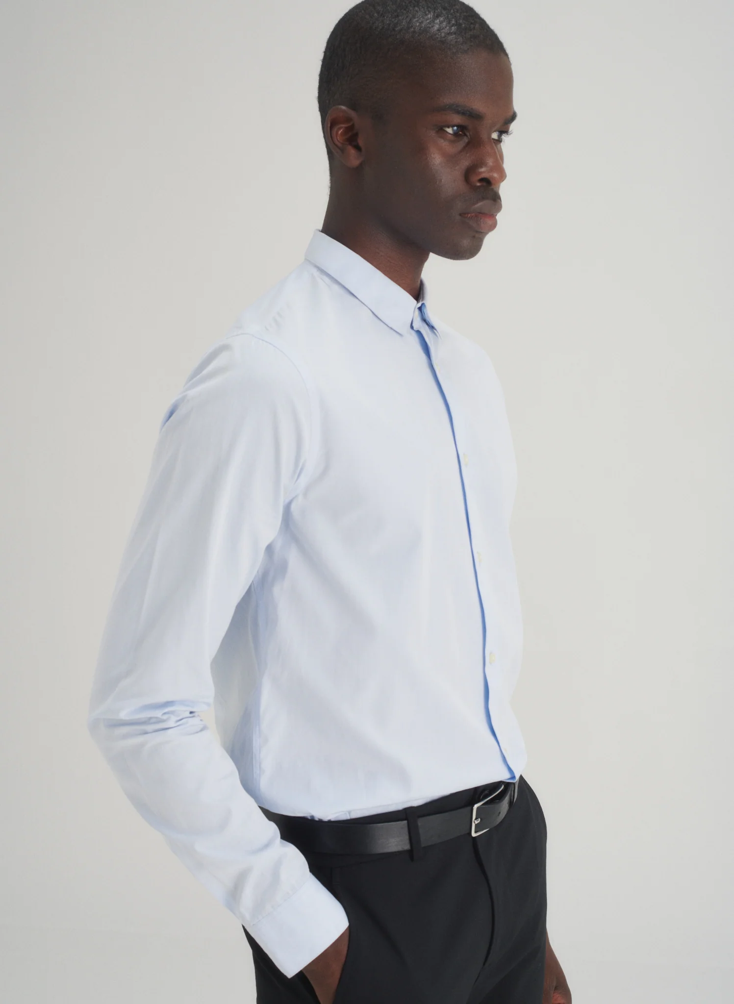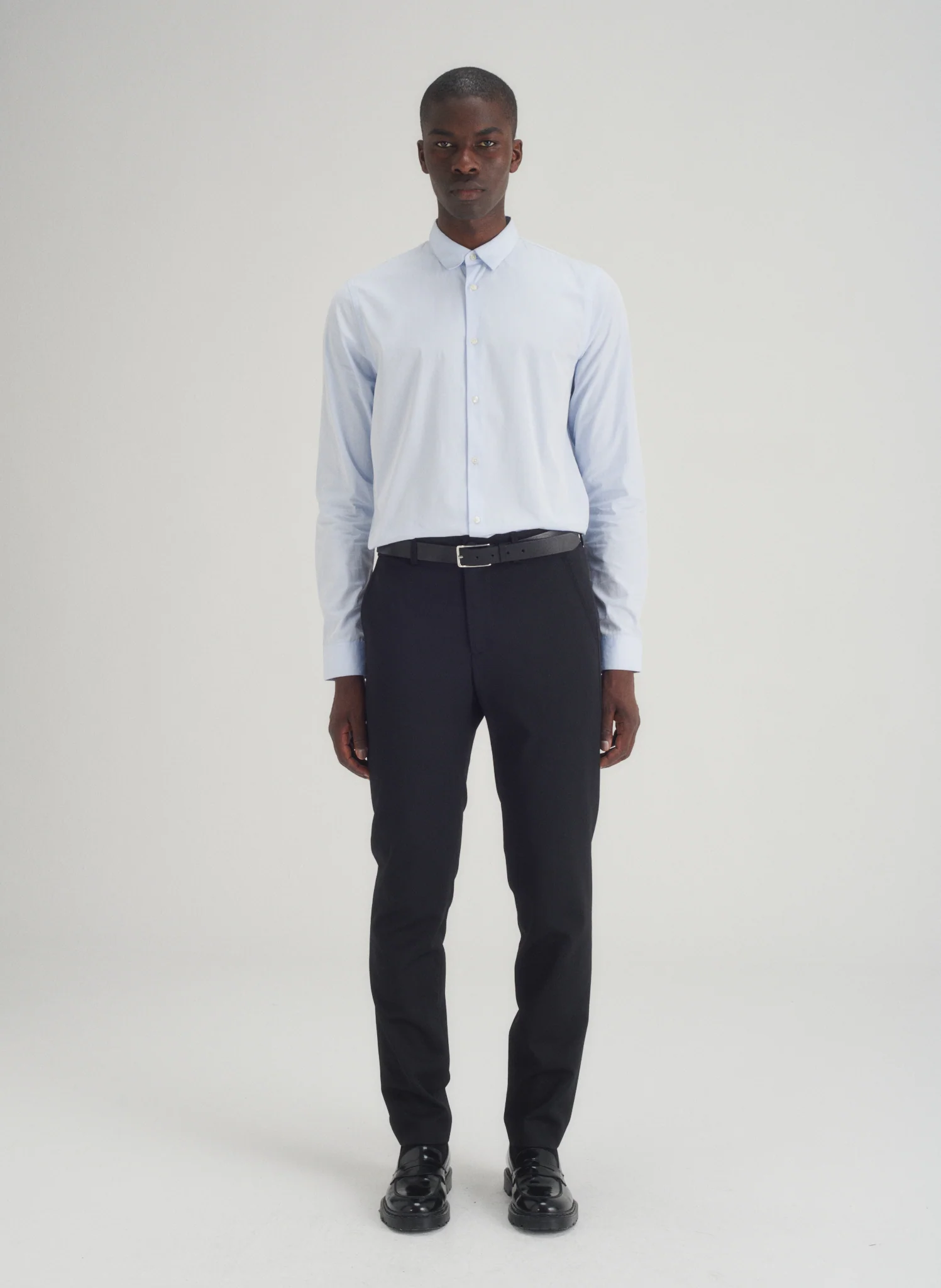 Chemise en popeline petit col. Boutonnée sous le col pour une tenue parfaite du col. Coupe ajustée.