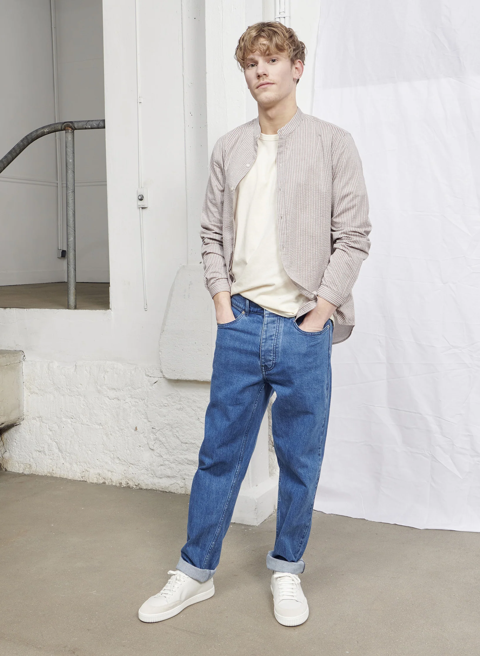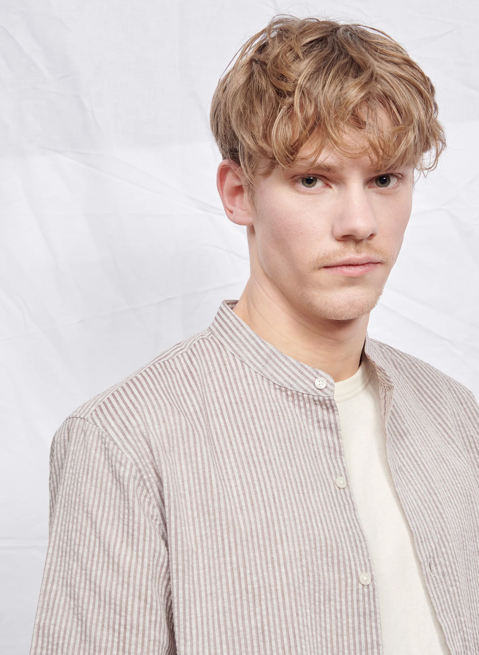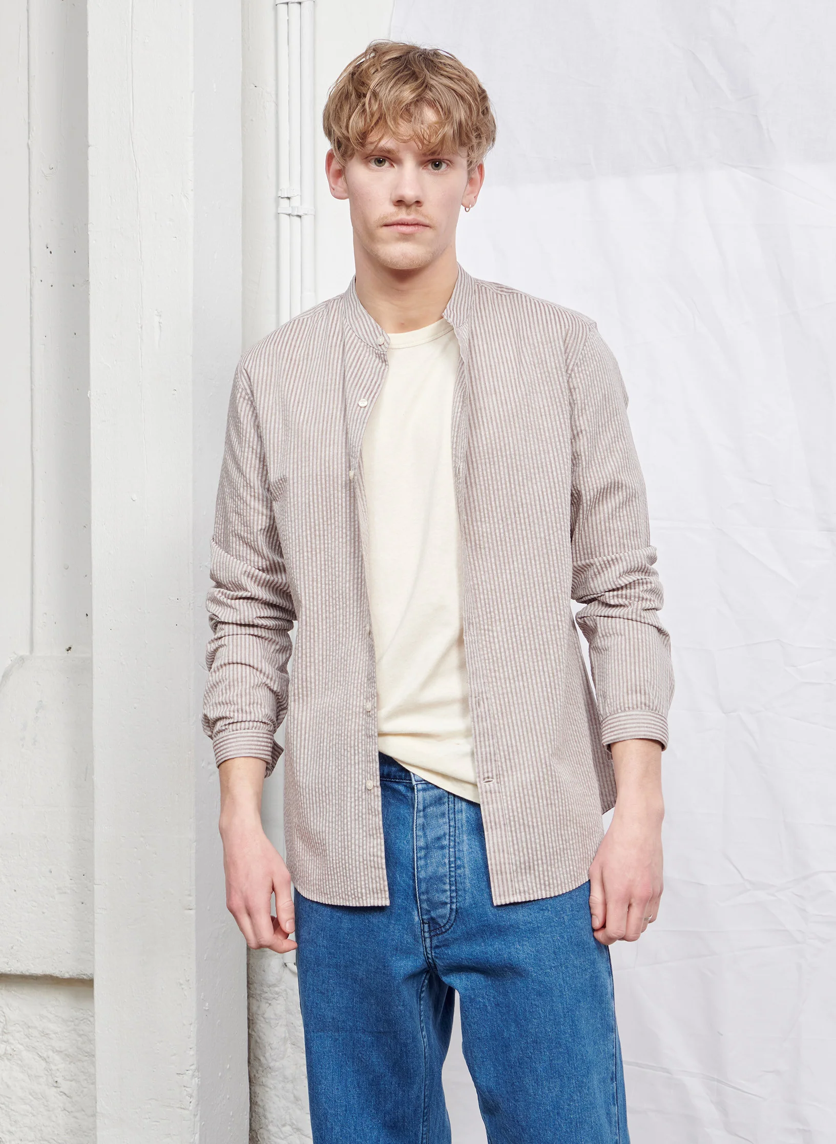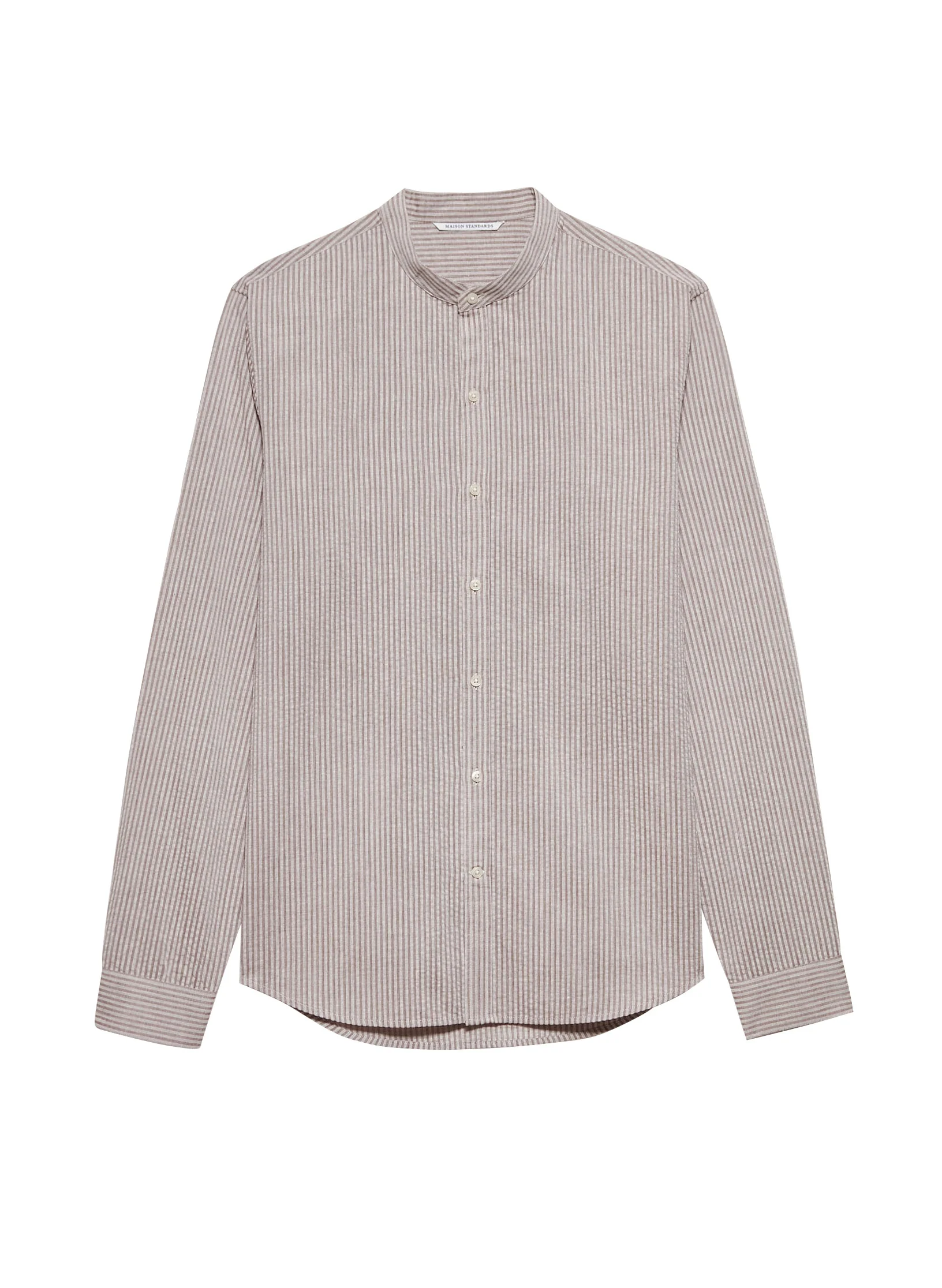Chemise col mao ajustée en tissus seersucker de coton. – Fermeture à patte de boutonnage rapportée – Boutons effet nacre – Poignets boutonnés avec patte capucin – Empiècement dos et bas liquette