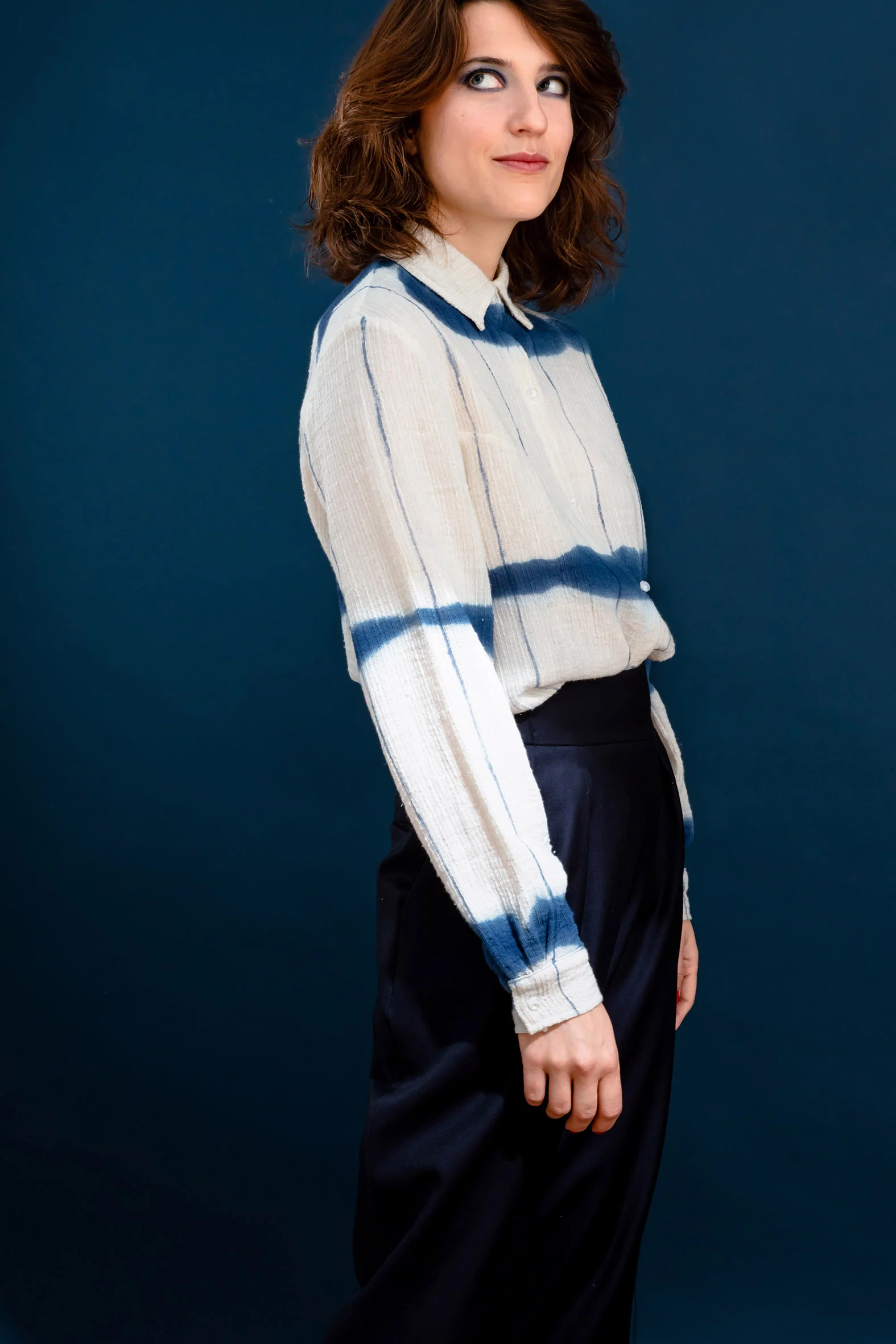 EDIT : DEVANT LE SUCCÉS DE CE MODÈLE (MERCI !!) NOUS N’AVONS PLUS LE TISSU QUI A ÉTÉ PRIS EN PHOTO. NOUS COUSONS MAINTENANT LE MODÈLE DANS CETTE MATIÈRE EN GAZE DE COTON (TOUJOURS COTON, TOUJOURS TISSÉE À ROANNE PAR NOVEL ART, TOUJOURS IRRÉGULIER) : NE REGARDEZ PAS LE MOTIF TIE AND DYE, REGARDEZ BIEN LA MATIÈRE UNIQUEMENT !
