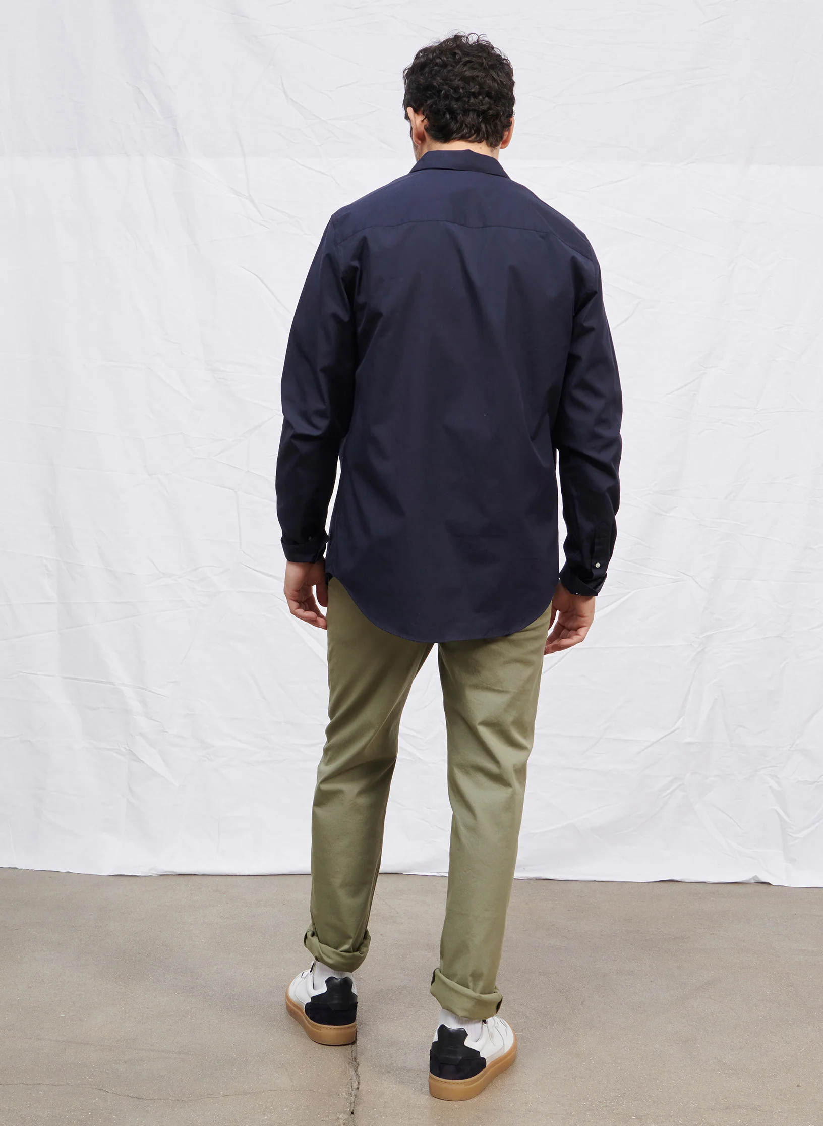 Pantalon chino en coton/élasthanne léger, idéal pour la saison printemps-été. – Fermeture zip métal, agrafe métal et bouton cachés – Ceinture montée avec 5 passants – Jambe longue et fuselée – 2 poches italiennes sur le devant – 2 poches passepoilées au dos