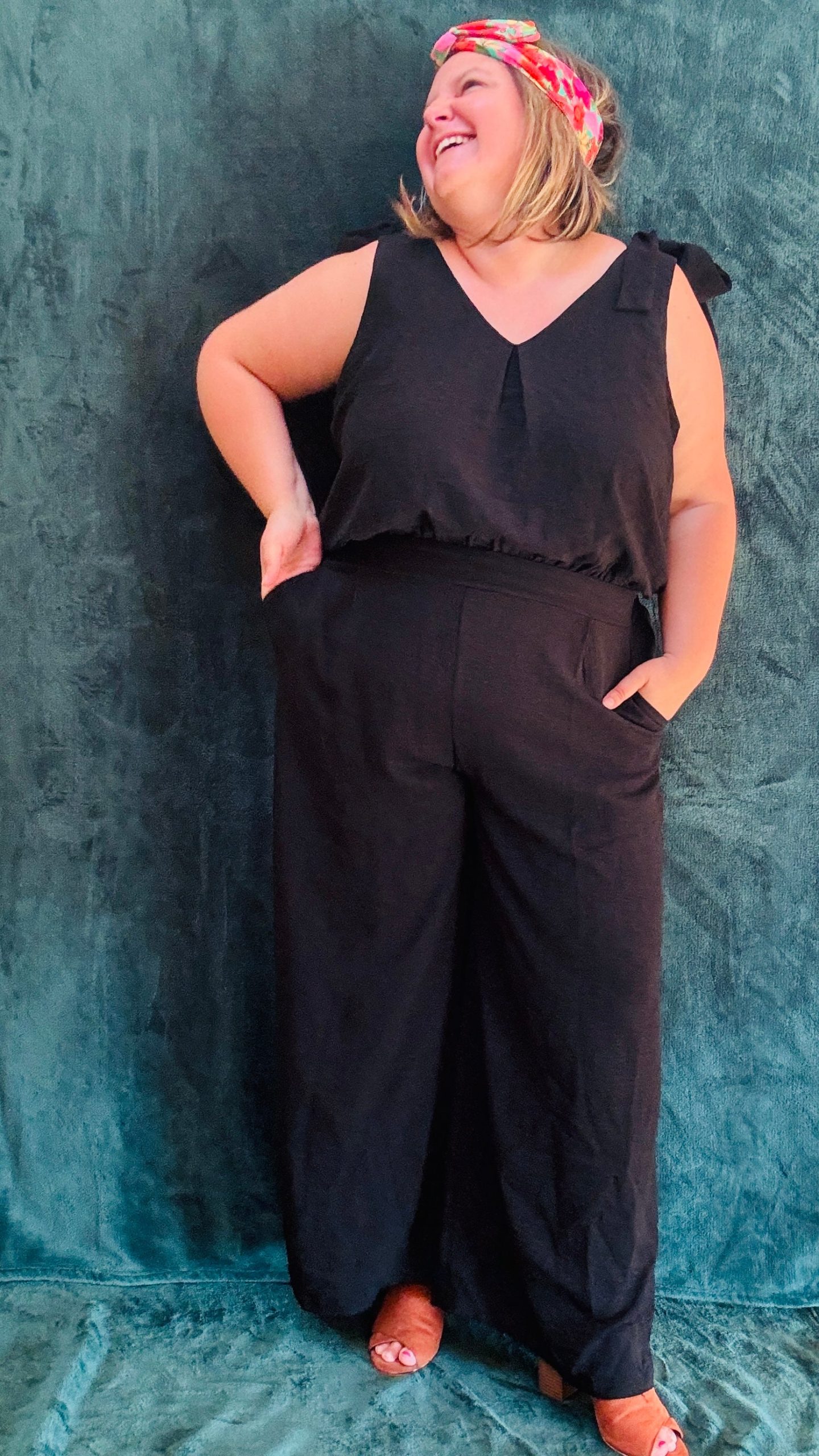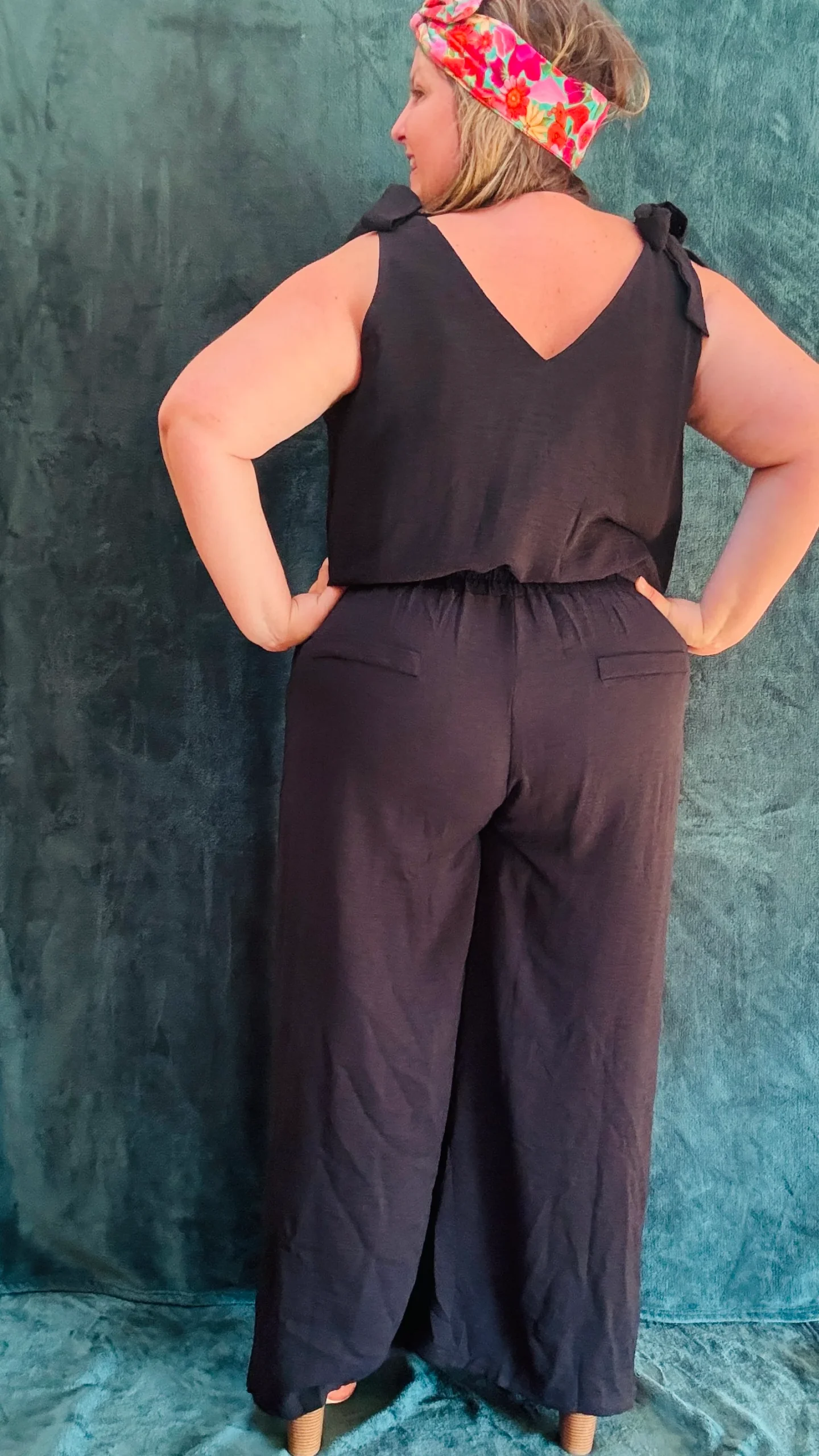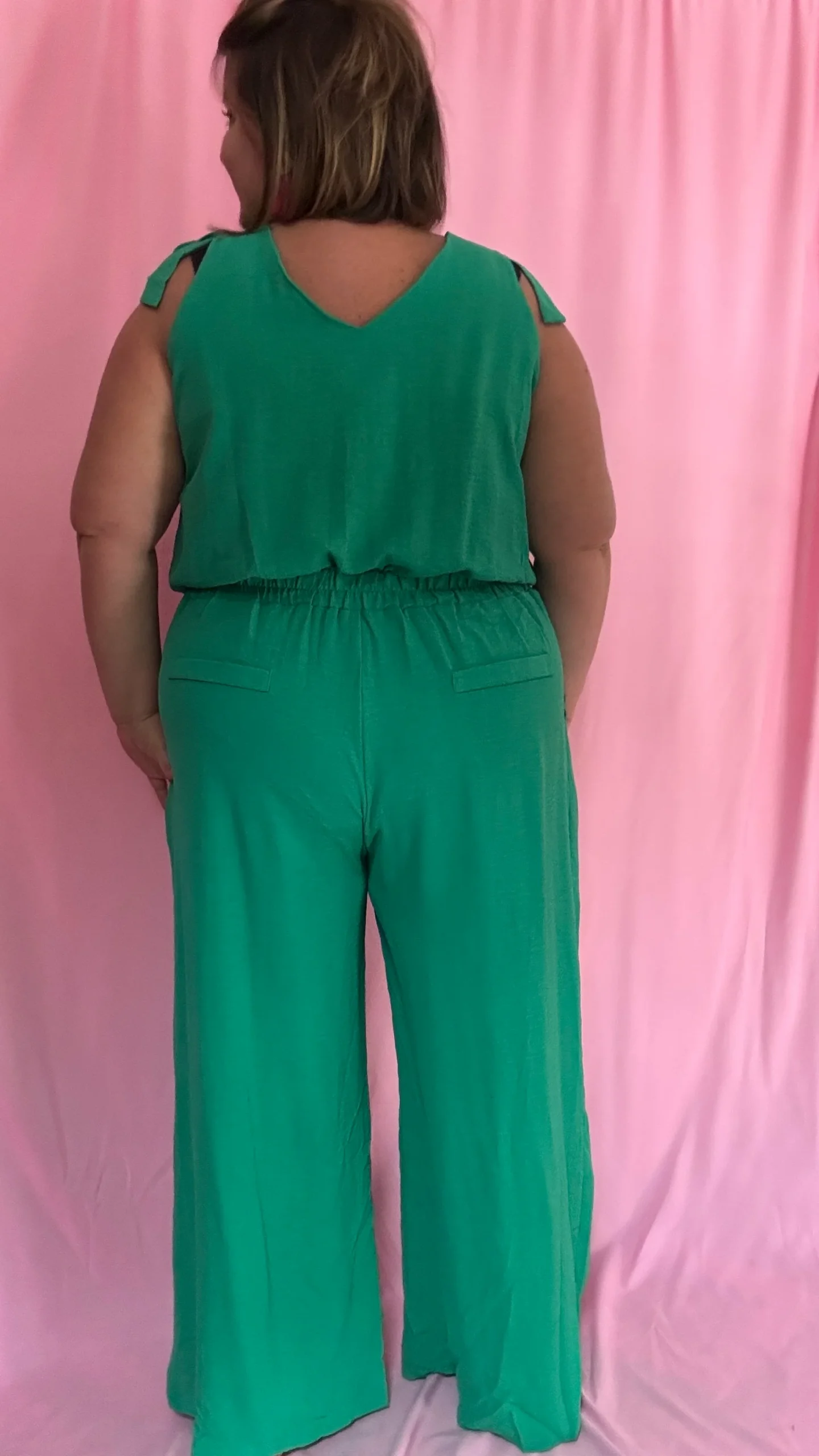 Affirmez votre style avec notre combinaison grande taille sans manche. Les détails noeuds décoratifs sur les épaules apportent du volume et structurent élégamment la silhouette. Le décolleté en V, à la fois sur le devant et dans le dos, ajoute une touche de sophistication. Disponible en noir et en bleu, cette combinaison ceinturée à la taille met en valeur la silhouette tout en offrant un confort optimal. Les poches sur le côté et sur les fesses ajoutent une touche pratique et mettent en avant le fessier.
