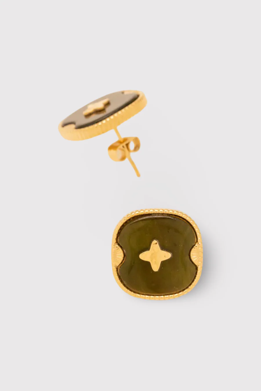 Boucles d’oreilles puces en acier inoxydable composées d’une étoile martelée posée sur un acétate teinté carré arrondie, sertie d’un anneau aux 2 griffes en forme coquillée. Étant des pierres naturelles, leurs couleurs et leur taille peuvent varier d’une pierre à l’autre.
