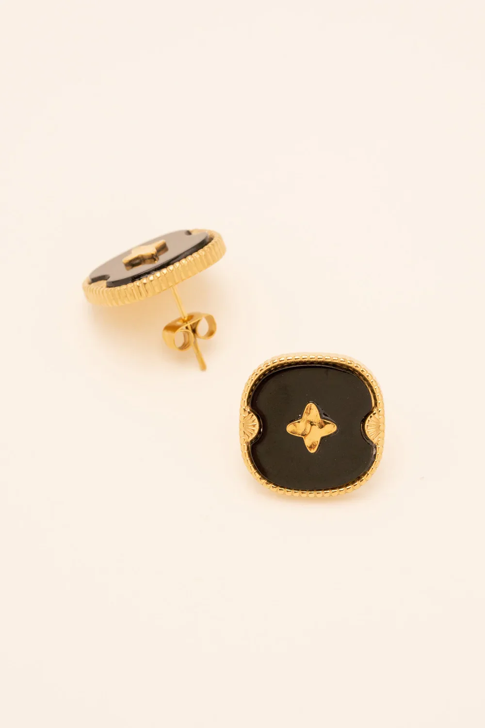 Boucles d’oreilles puces en acier inoxydable composées d’une étoile martelée posée sur un acétate teinté carré arrondie, sertie d’un anneau aux 2 griffes en forme coquillée. Étant des pierres naturelles, leurs couleurs et leur taille peuvent varier d’une pierre à l’autre.