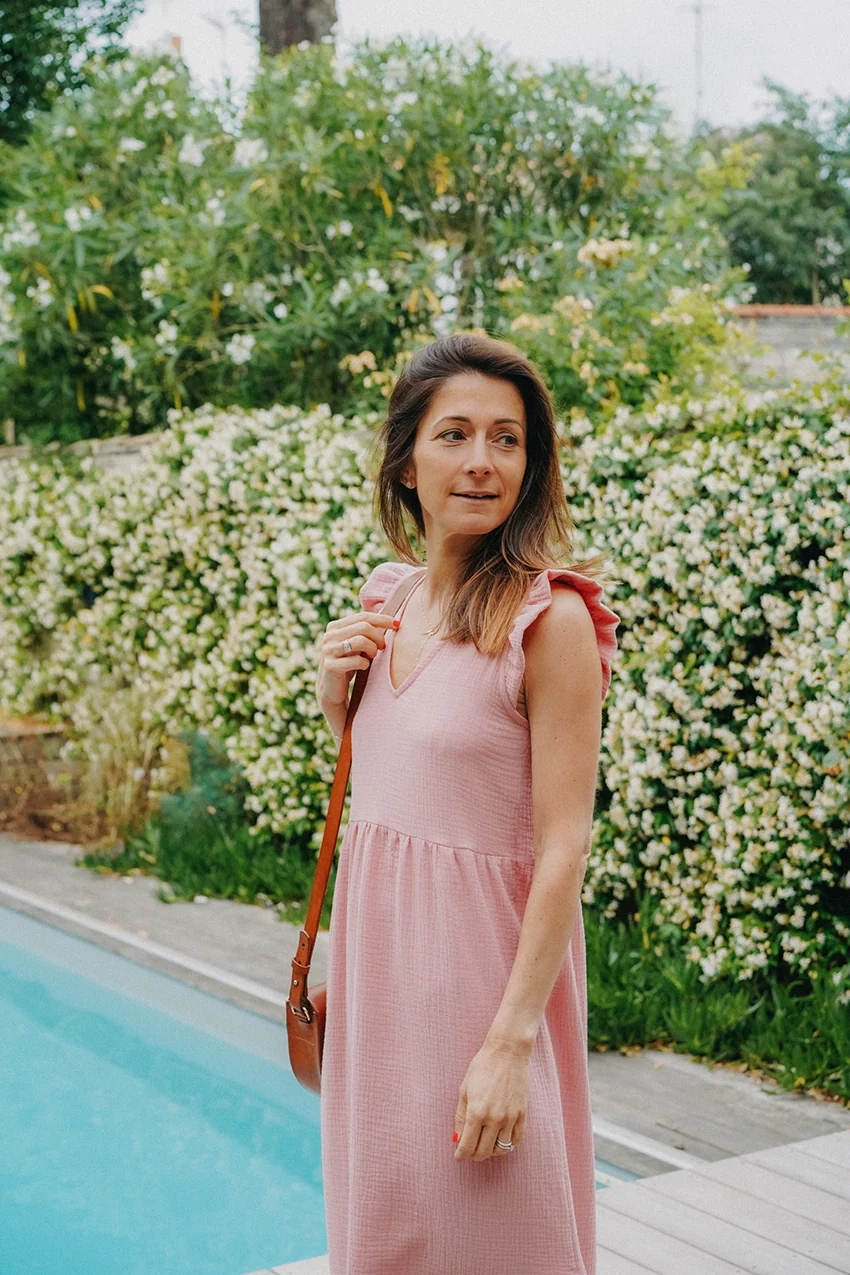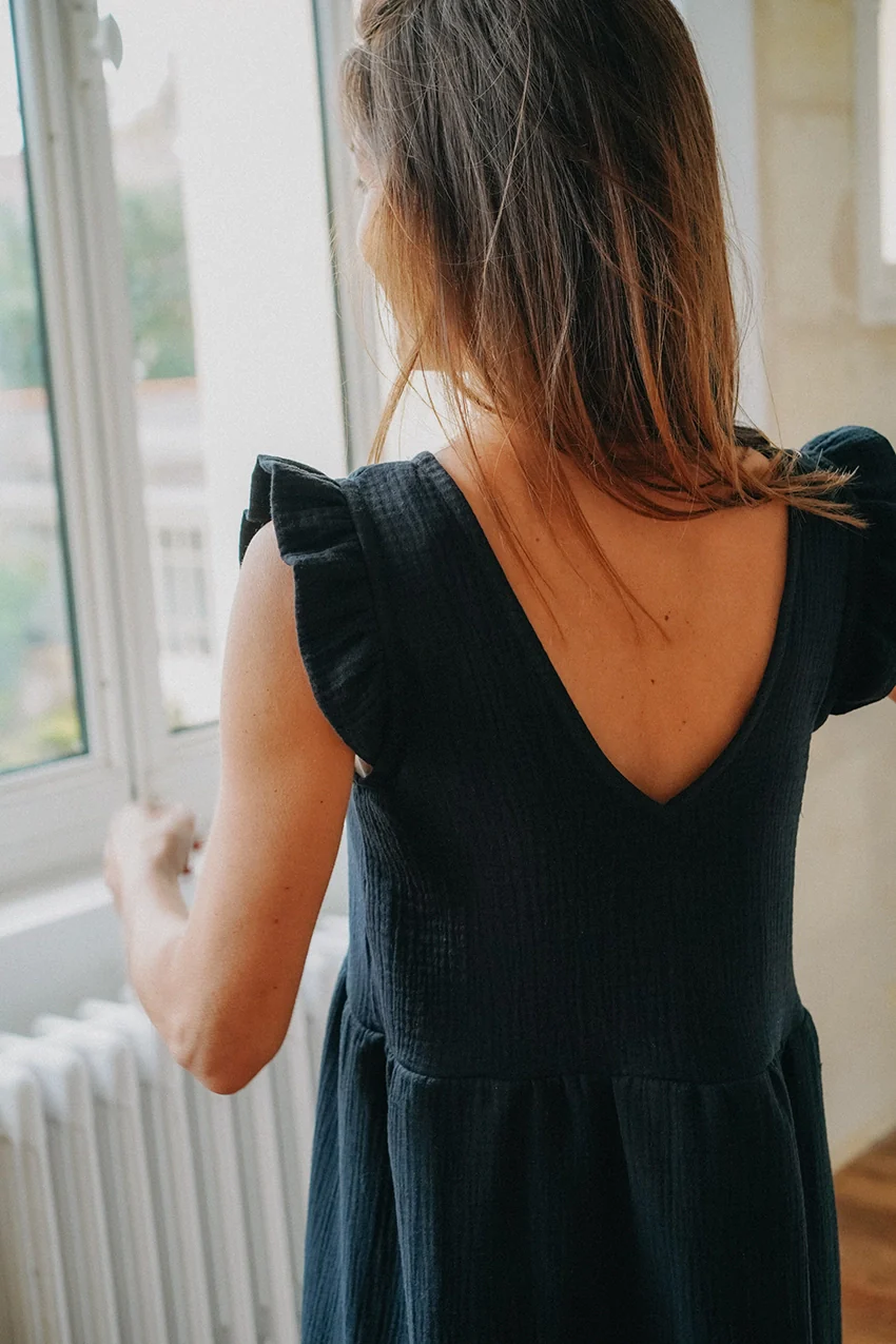 Robe longue et légère en double gaze de coton Description : Robe longue sans manches avec un décolleté en V – Coupe droite légèrement ajustée à la taille – Le patron a été modifié pour être moins serré au niveau de la poitrine – Dos échancré ( qui ne laisse pas apparaître le soutien gorge) […]