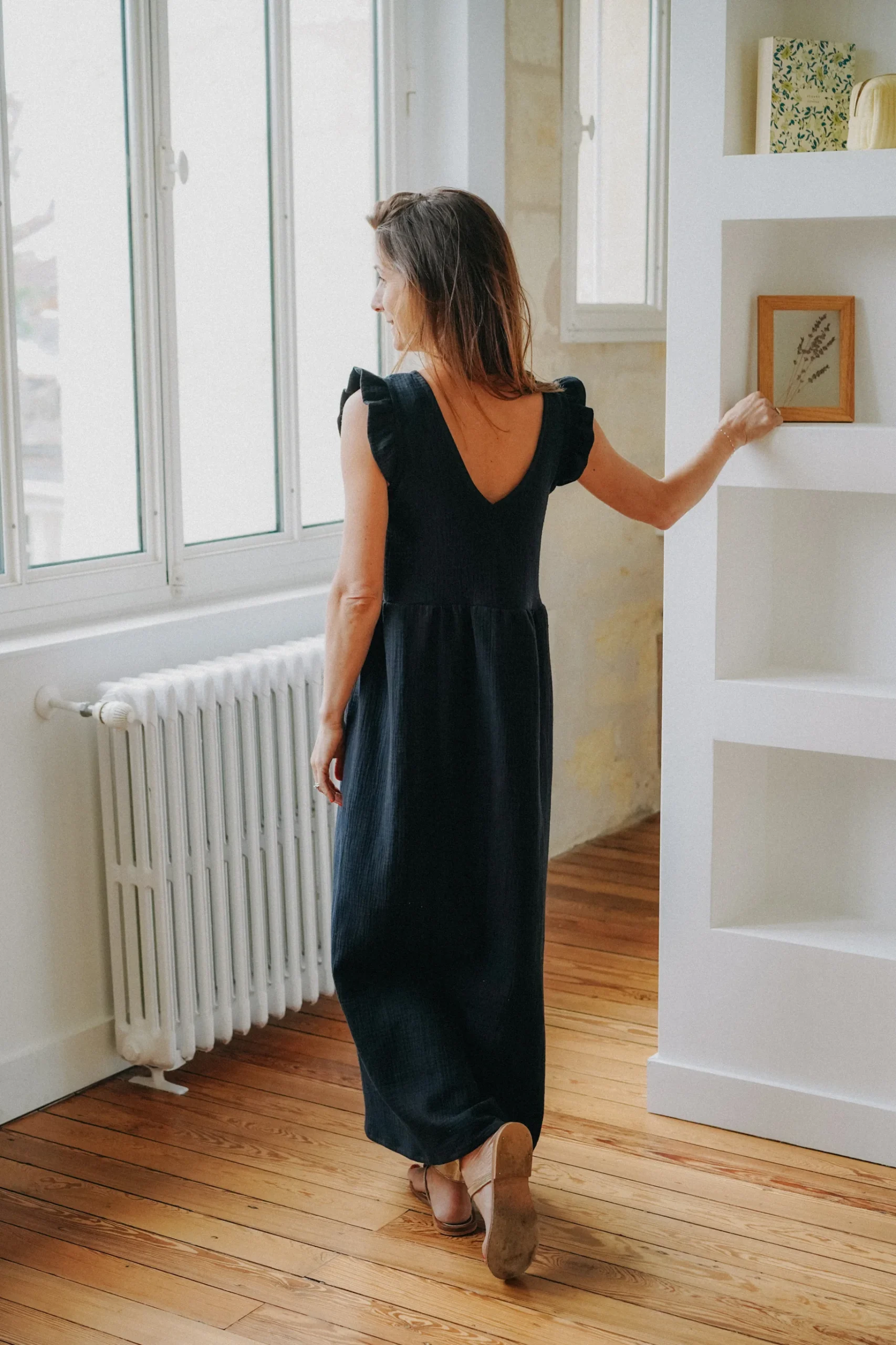 Description : Robe longue sans manches avec un décolleté en V – Coupe droite légèrement ajustée à la taille – Le patron a été modifié pour être moins serré au niveau de la poitrine – Dos échancré ( qui ne laisse pas apparaître le soutien gorge) – Epaules volantées