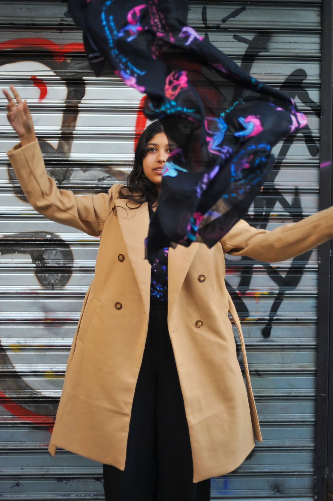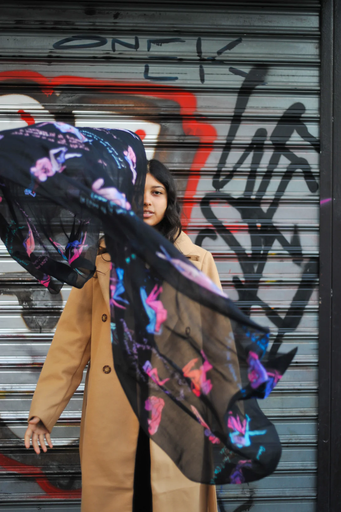 Le foulard à motifs colorés Belle du seigneur est imprimé au Portugal, sur une étamine de coton et soie.