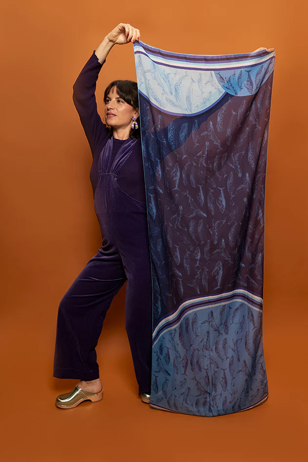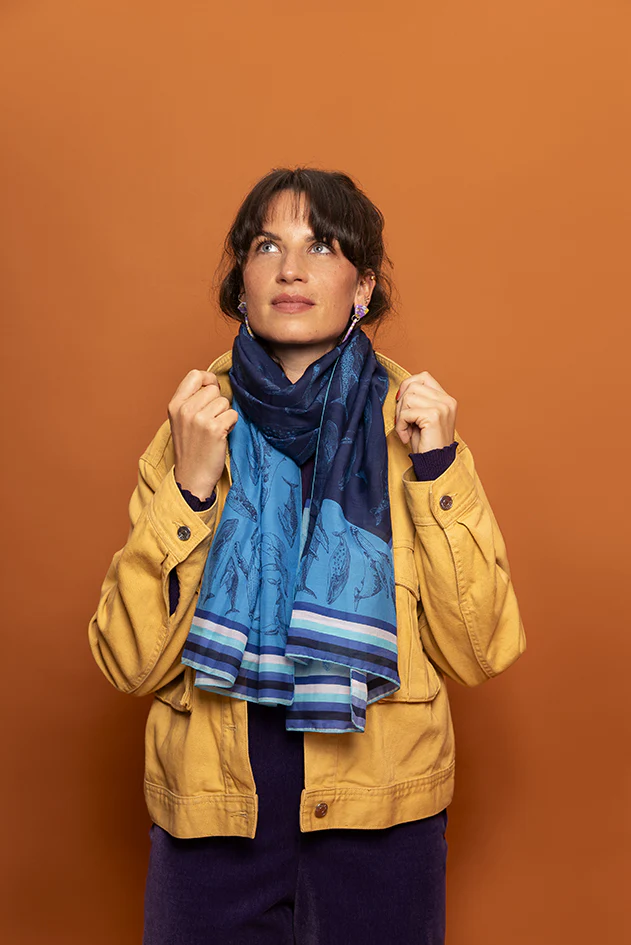 Le foulard à motifs colorés Moby Dick est imprimé au Portugal, sur une étamine de coton et soie.