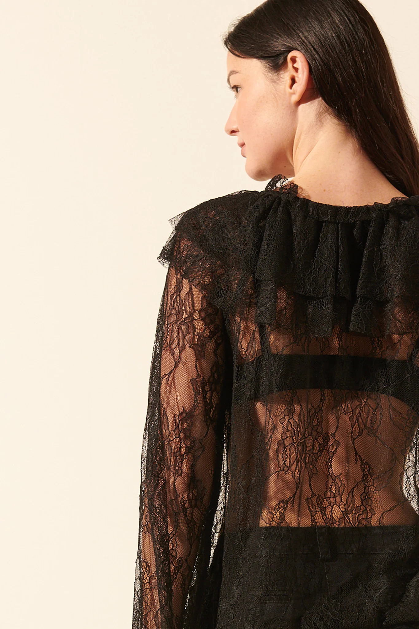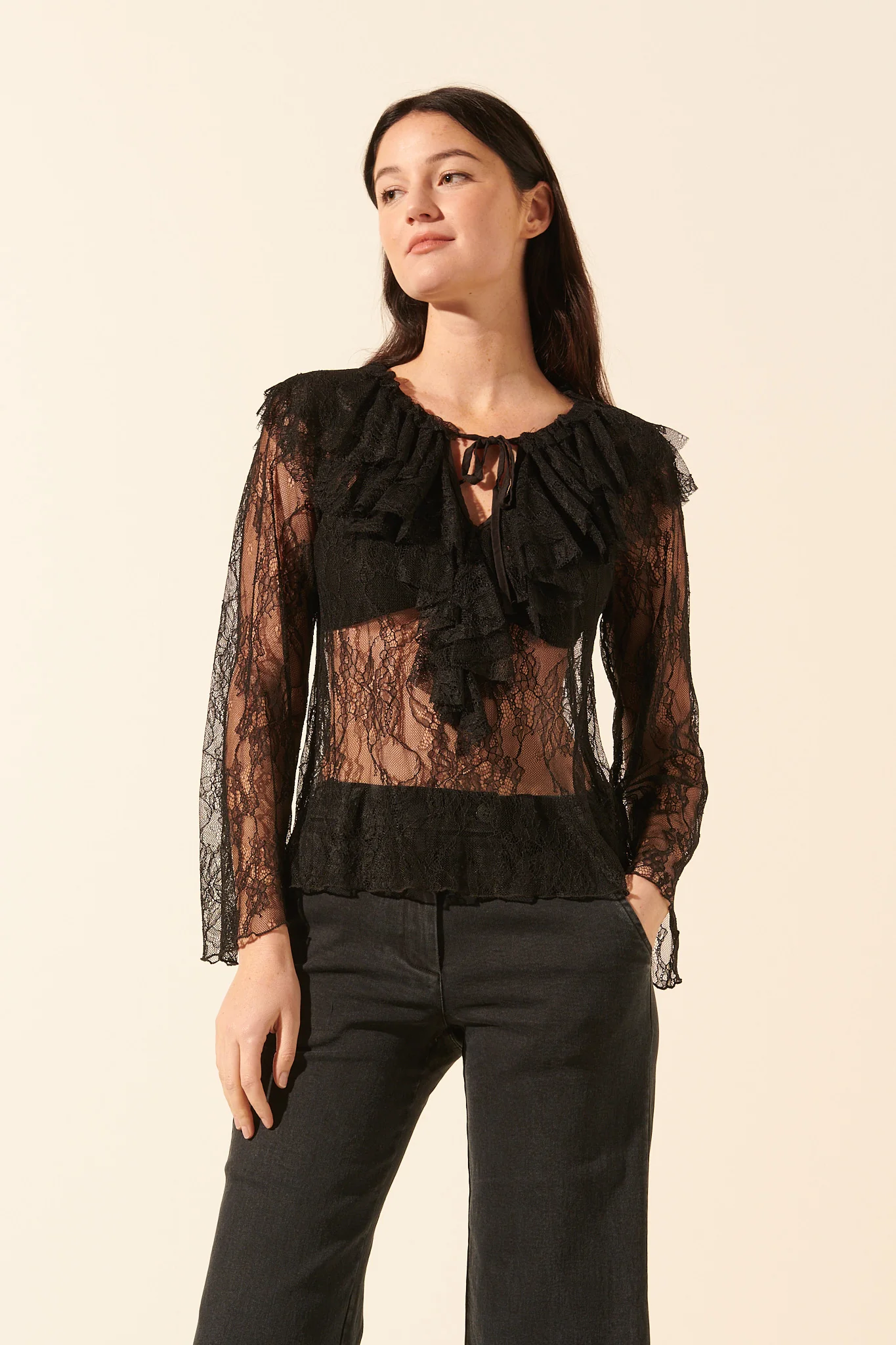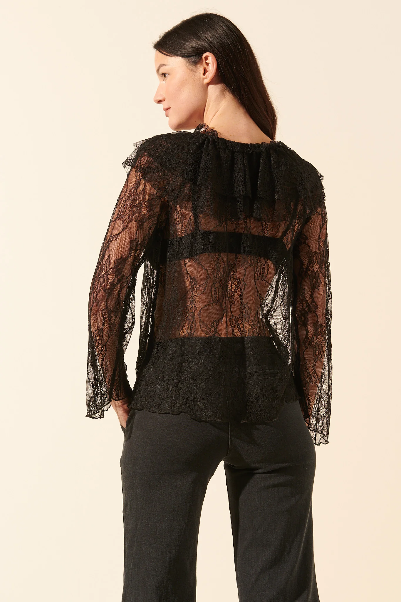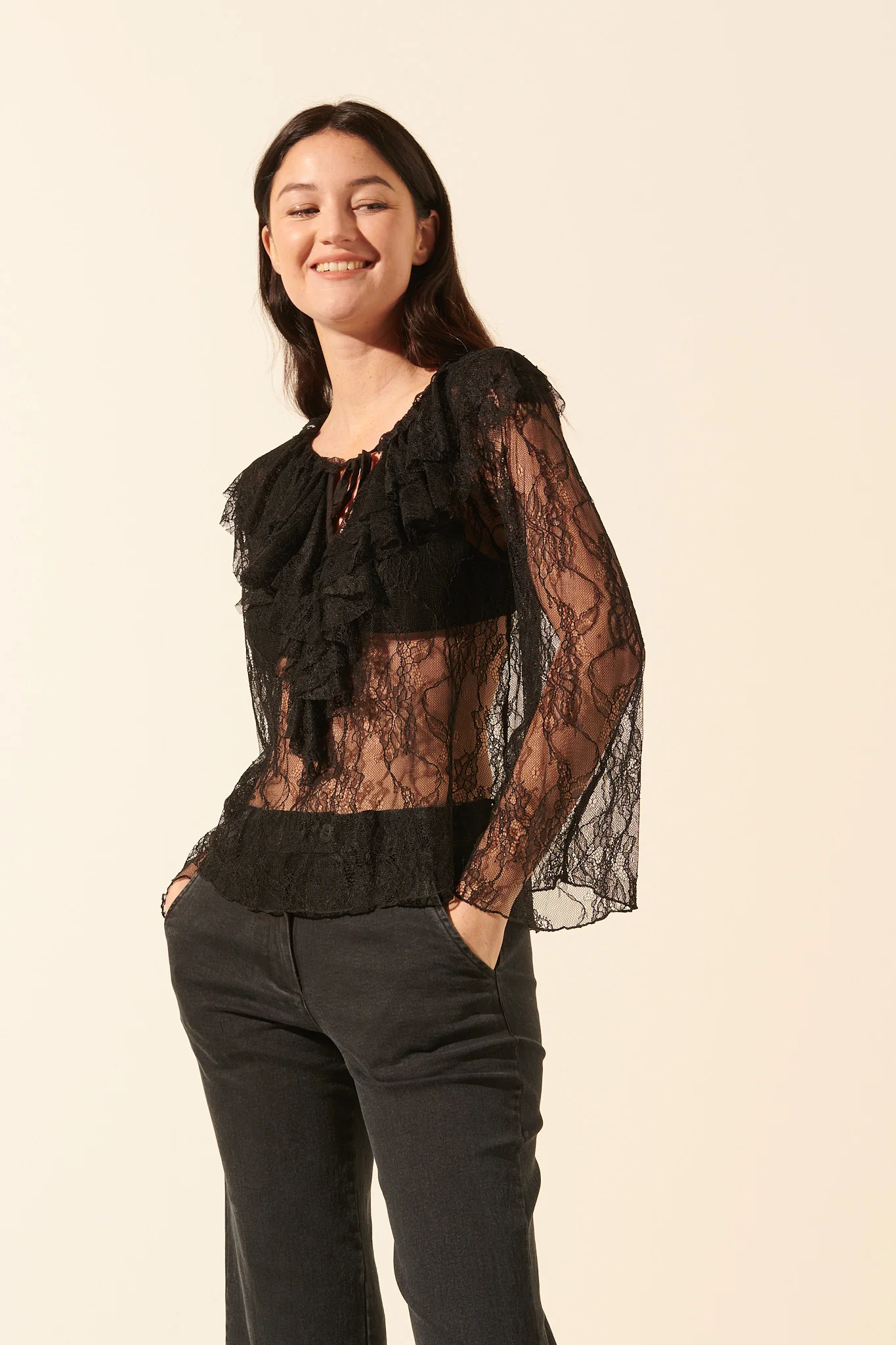 Romantique et rock&roll, le top Froufrou joue avec la transparence ! Ses manches longues évasées et ses détails volantés nous font complètement craquer. On aime son style affirmé. Correspondance des tailles : S/M : 36-38 M/L : 38-40 Top en dentelle Made in Italy