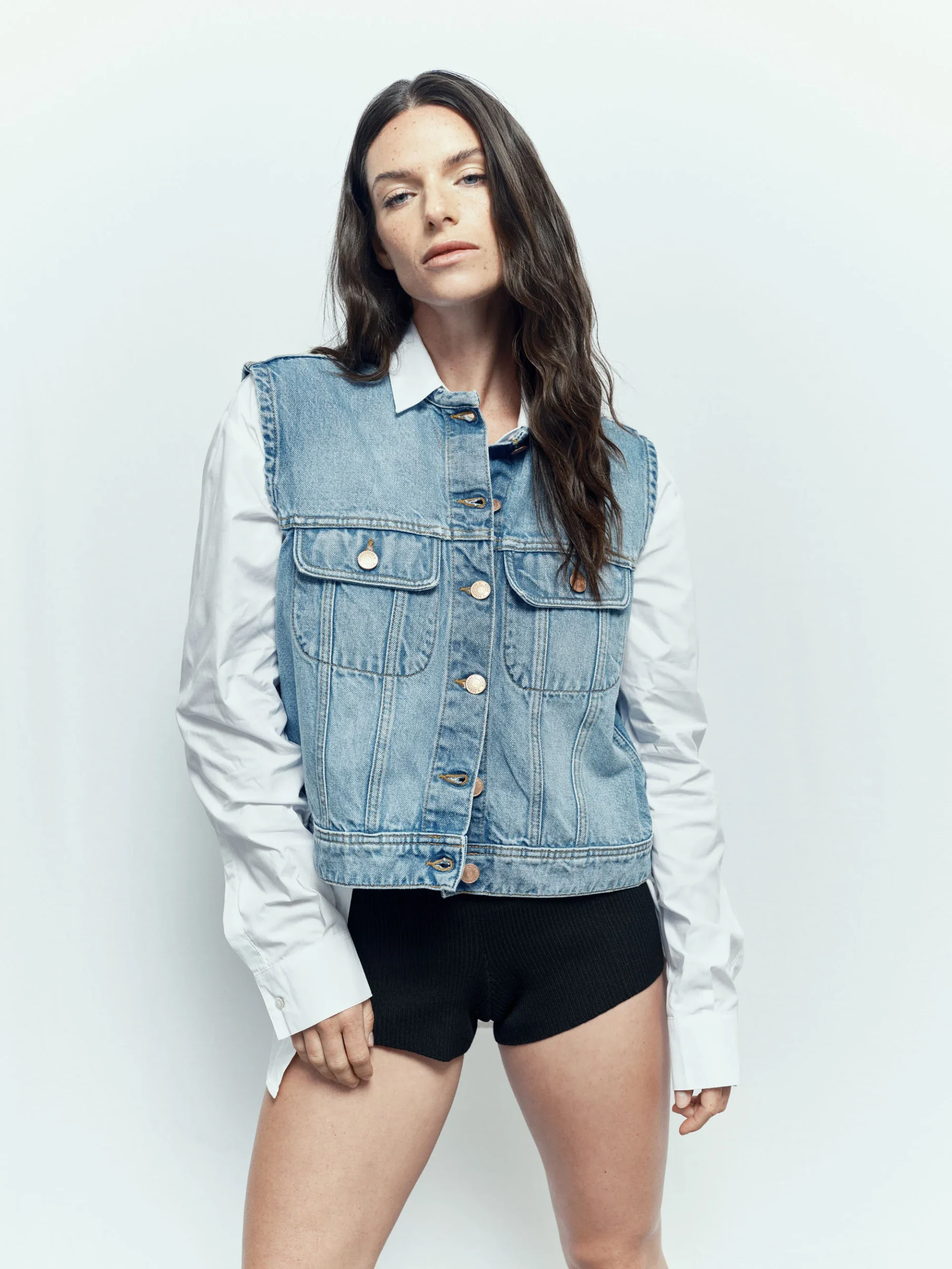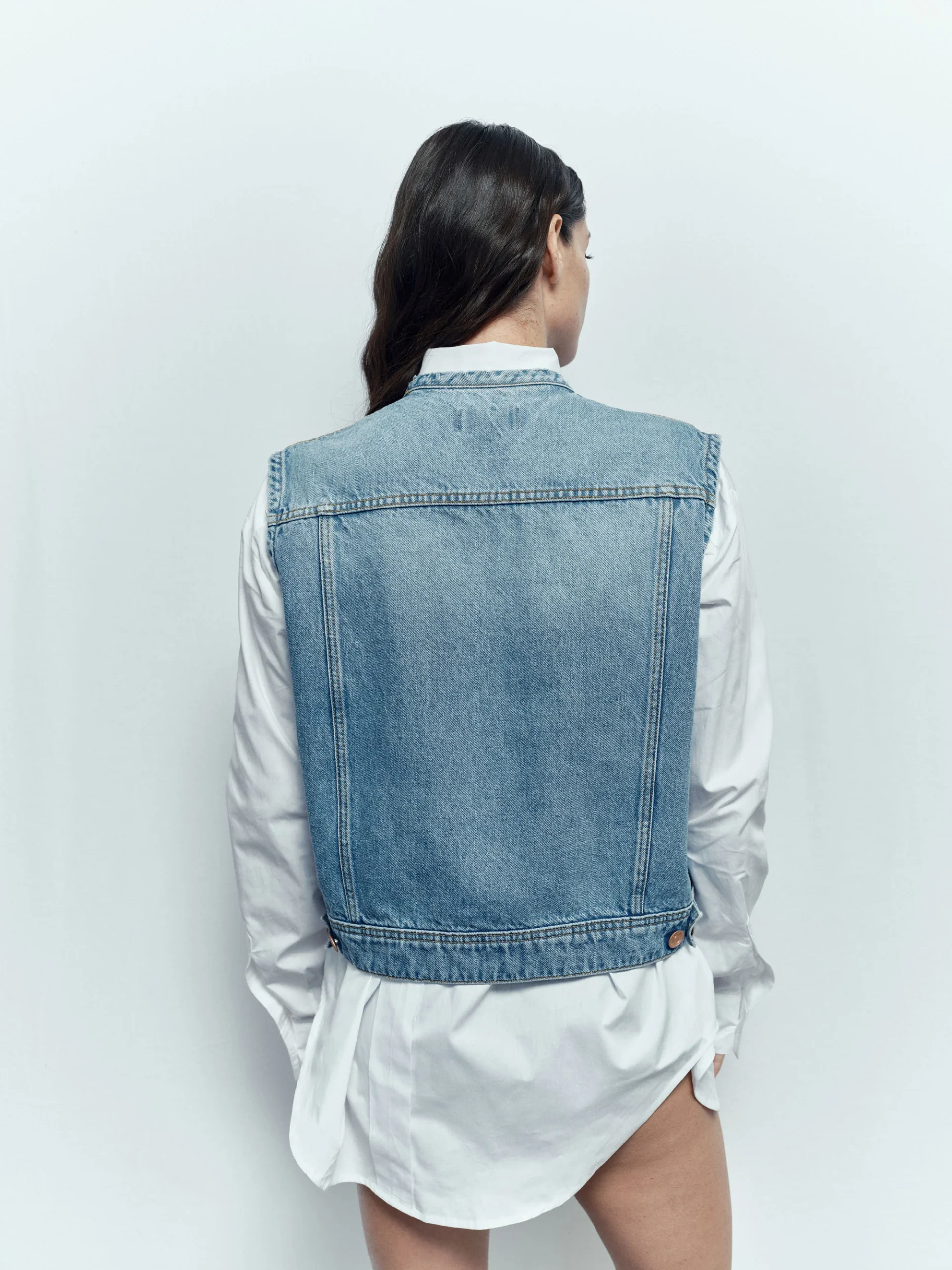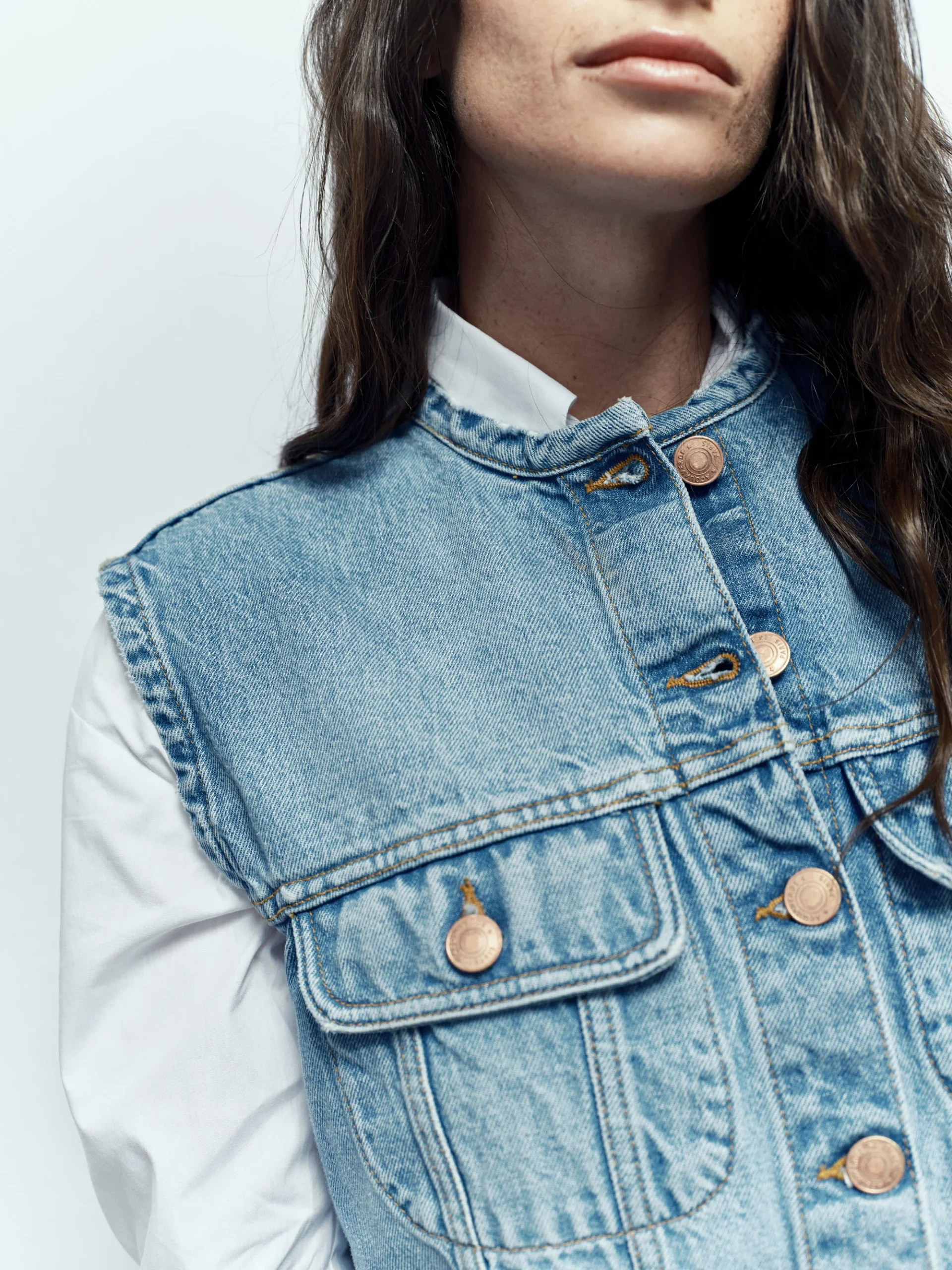 Notre gilet Boréal est une pièce incontournable, confectionnée en denim délavé et agrémentée de fils à coutures contrastées. Les poches avant semi-cachées ajoutent une touche discrète et pratique, tandis que les doubles pinces sur le devant apportent structure et style à la silhouette. Idéale pour le printemps et l’été, cette veste sans manches se porte facilement tout au long de l’année, offrant polyvalence et confort.