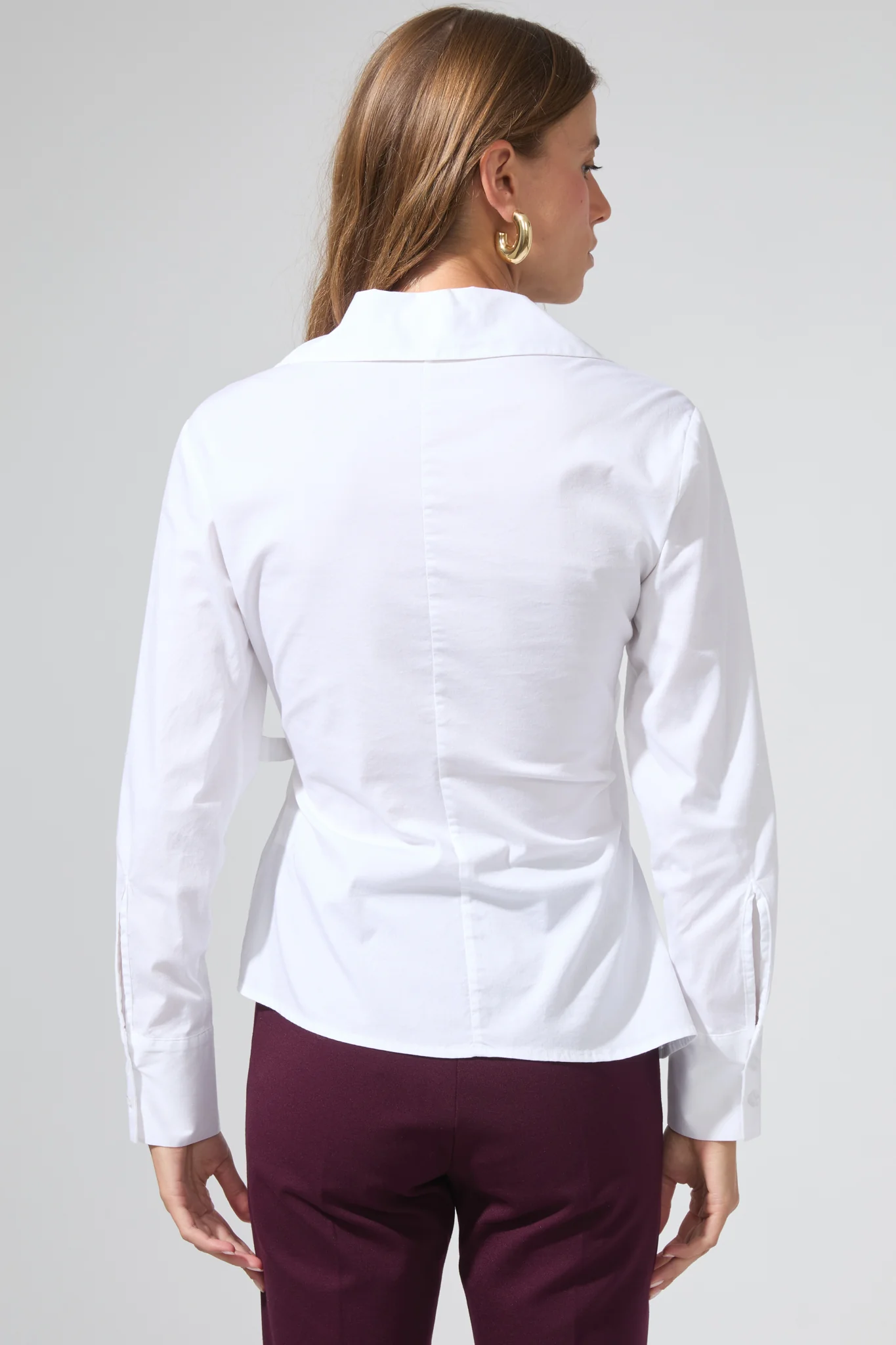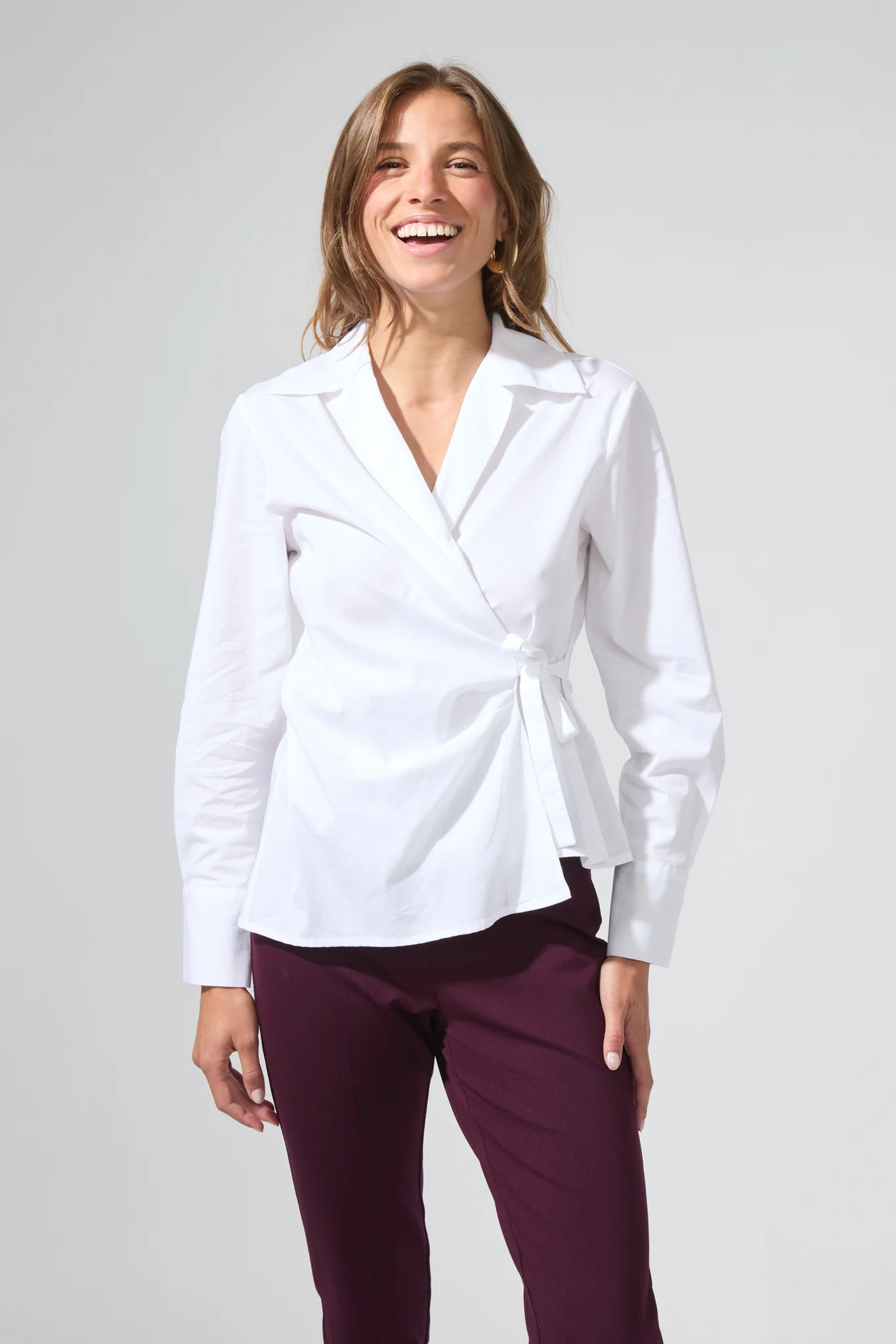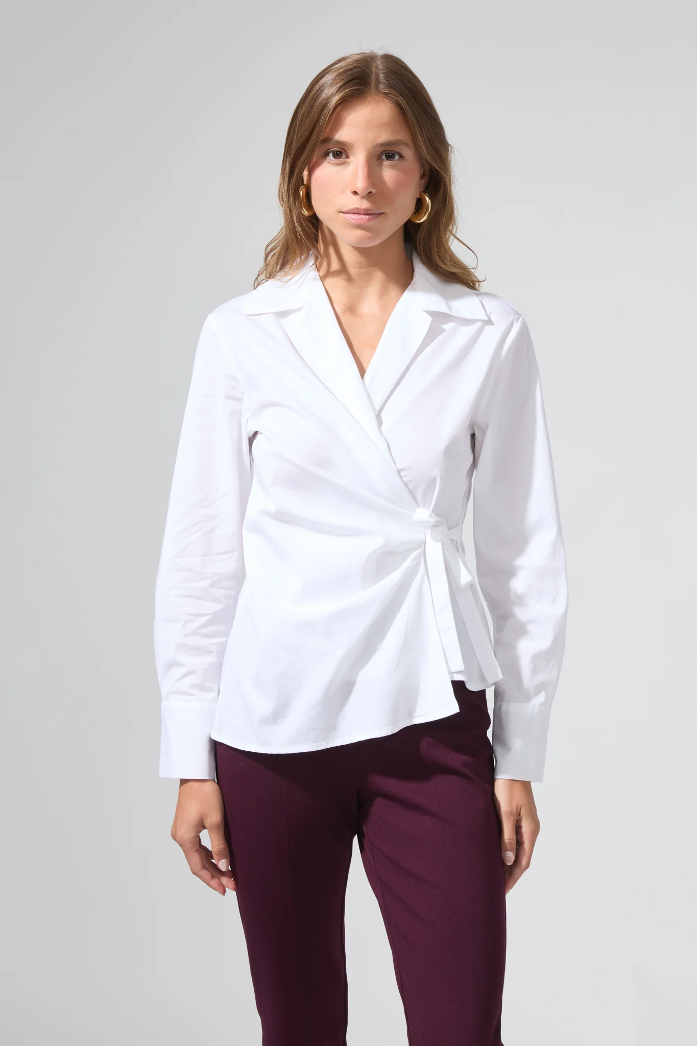 Chemise à la coupe régulière, col en V, manches longues et noeud à nouer au niveau de la taille. Un indispensable à avoir pour la rentrée !