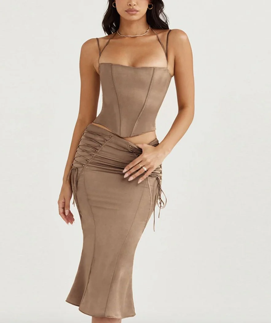 Ses fronces au niveau de la jupe et ses lacets serre-taille donnent un style original à ce bel ensemble. Le tout est confectionné en tissu Satin et Spandex pour flatter les courbes et sublimer votre silhouette de printemps. Portez l’ensemble avec une jolie veste noire pour un look plein de charme et de classe incarnée !