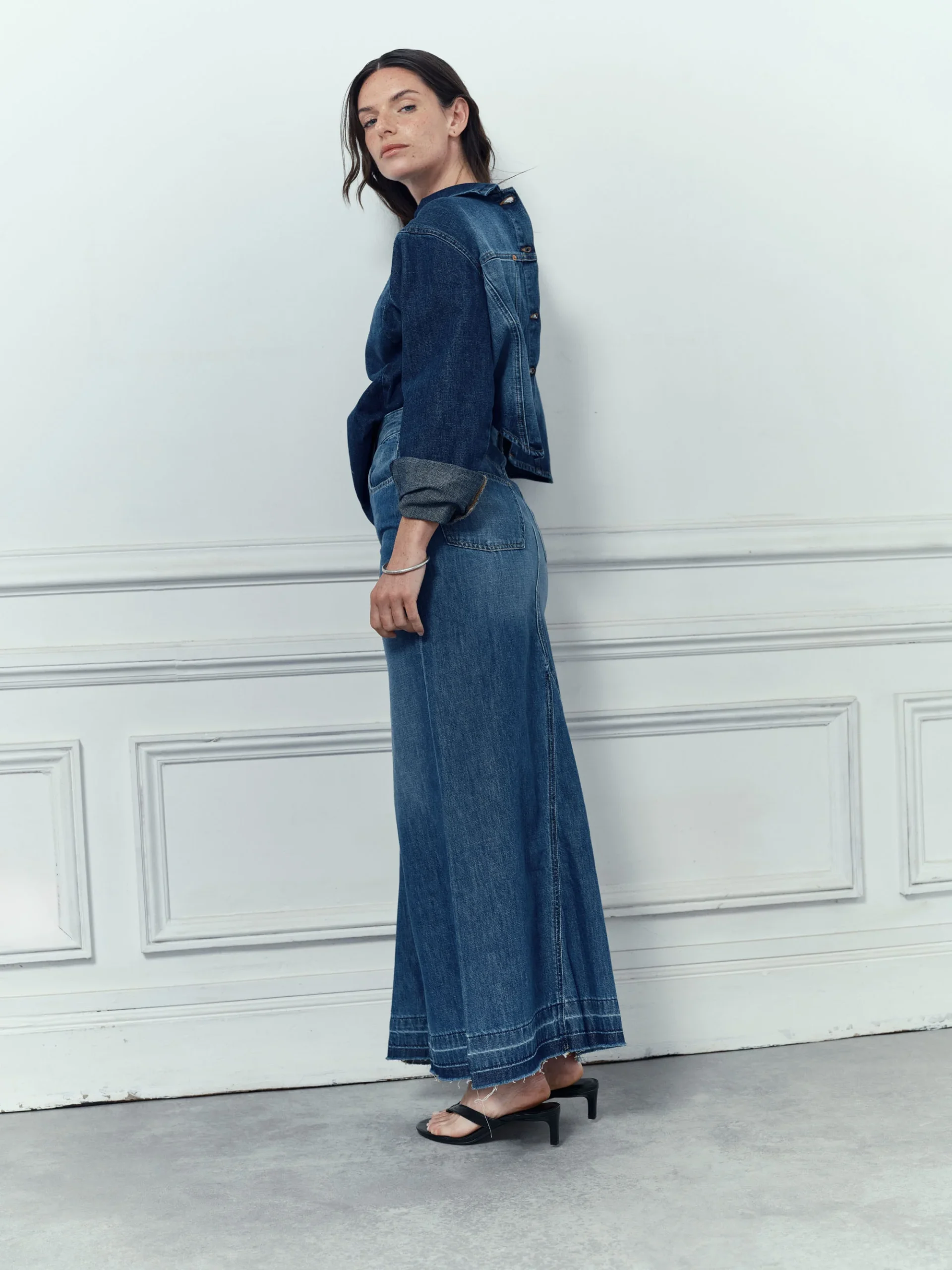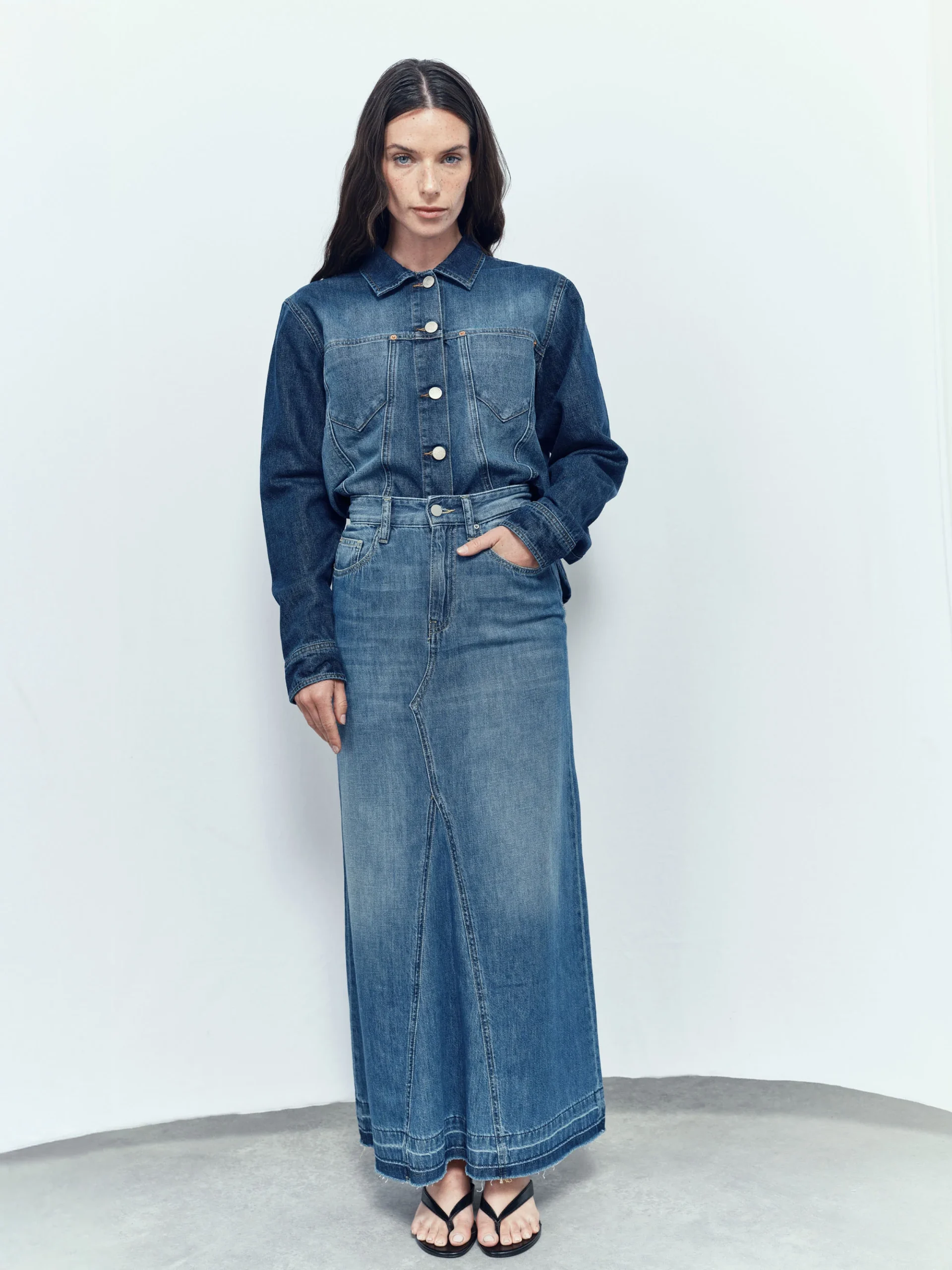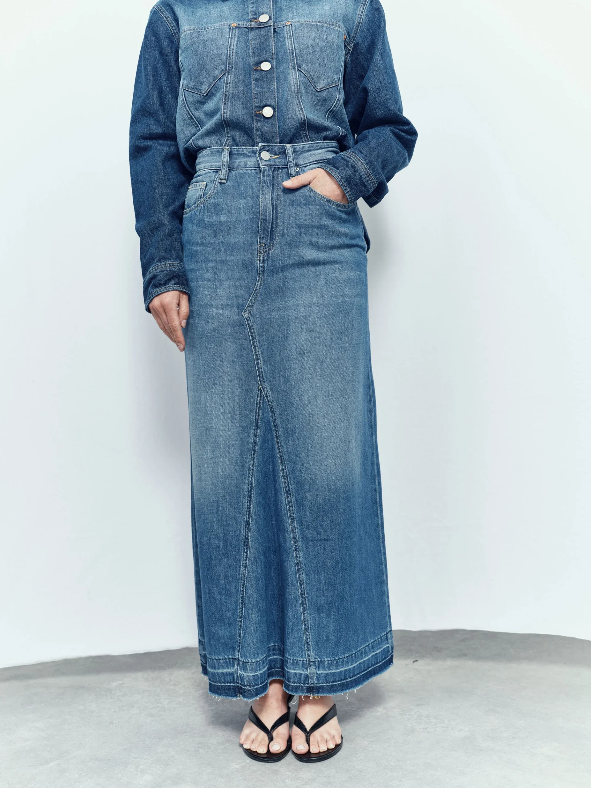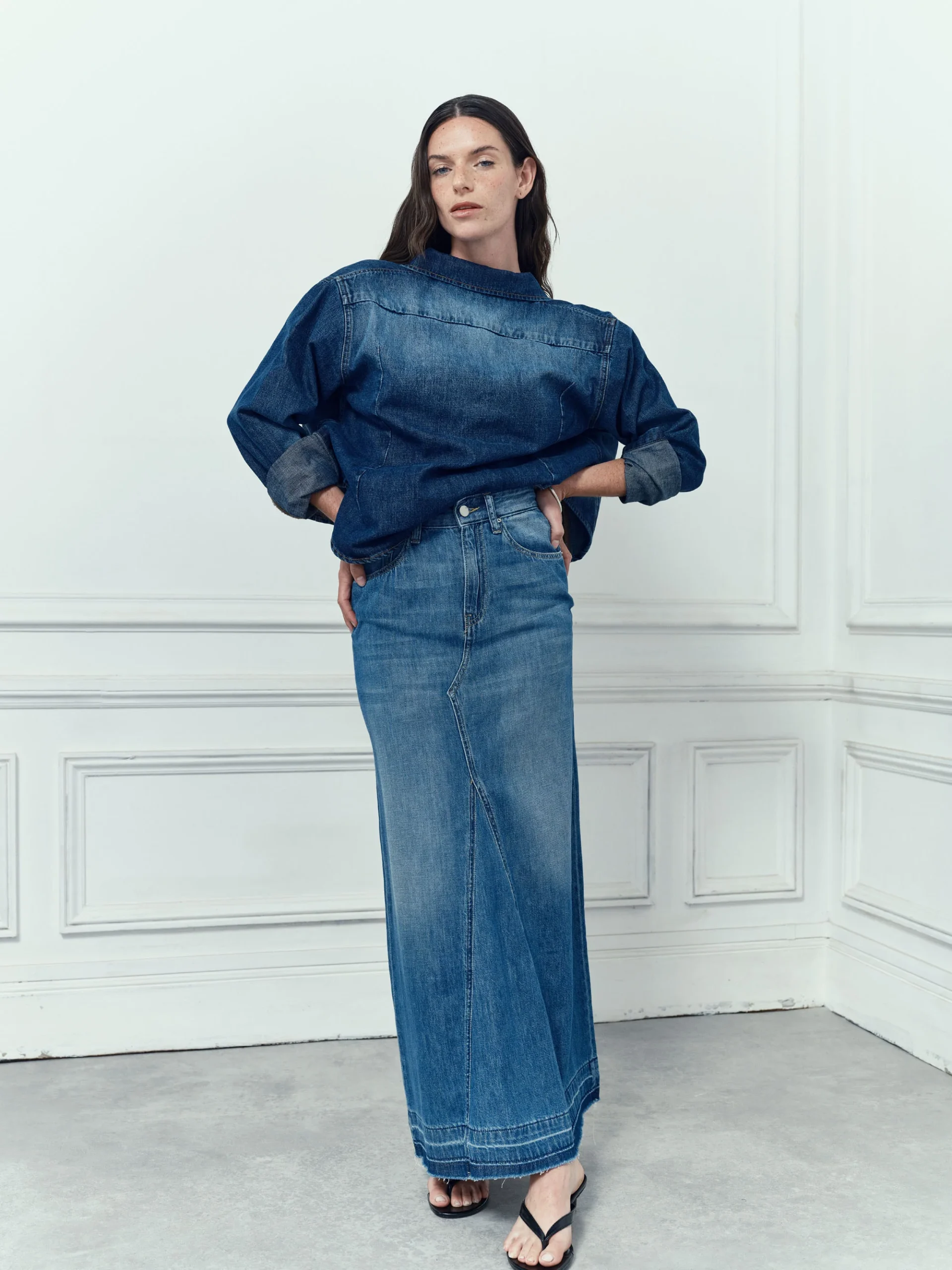 Jupe longue en denim souple délavé, avec coutures soignées au centre. Le bas dévoile un effet unique obtenu grâce à une technique de couture, de délavage et de découture, créant un jeu de teinture et délavage. Cette méthode, associée à la frange, constitue l’essence de ce modèle au style vintage, dérivé du célèbre jean Soul, l’un des best-sellers de la marque depuis l’année dernière.