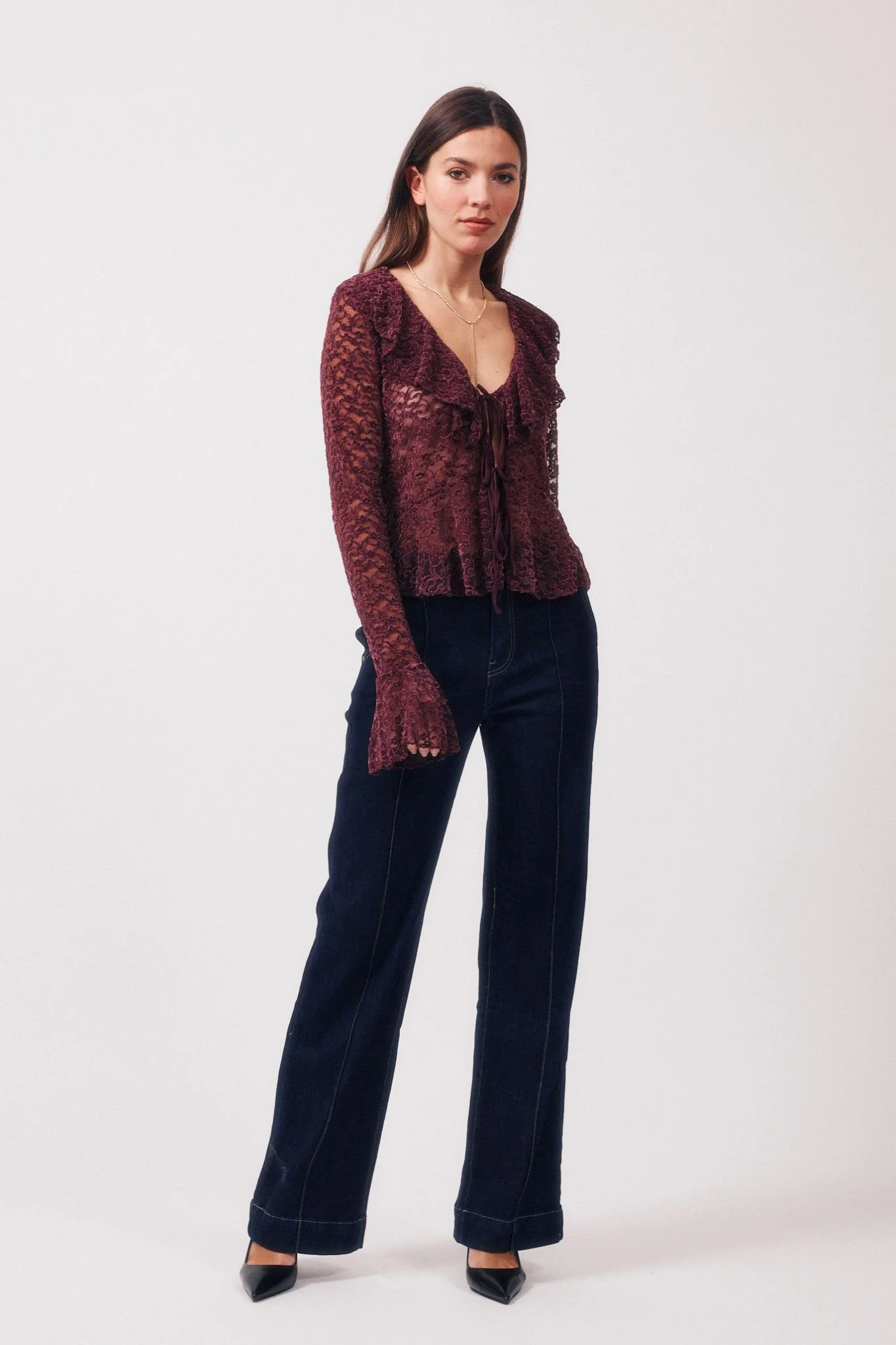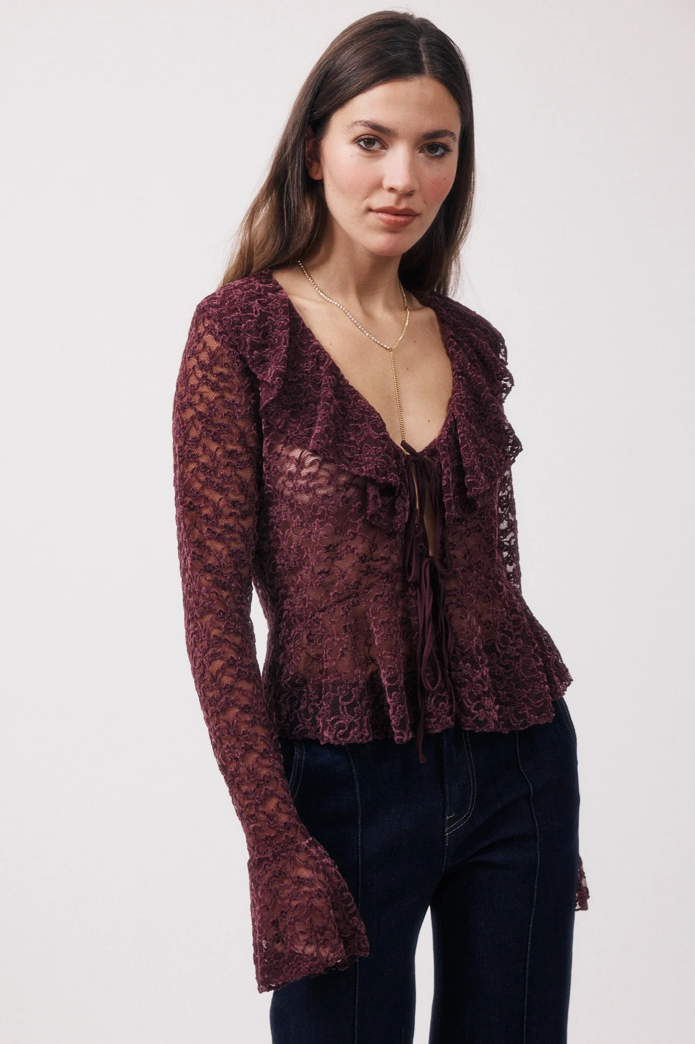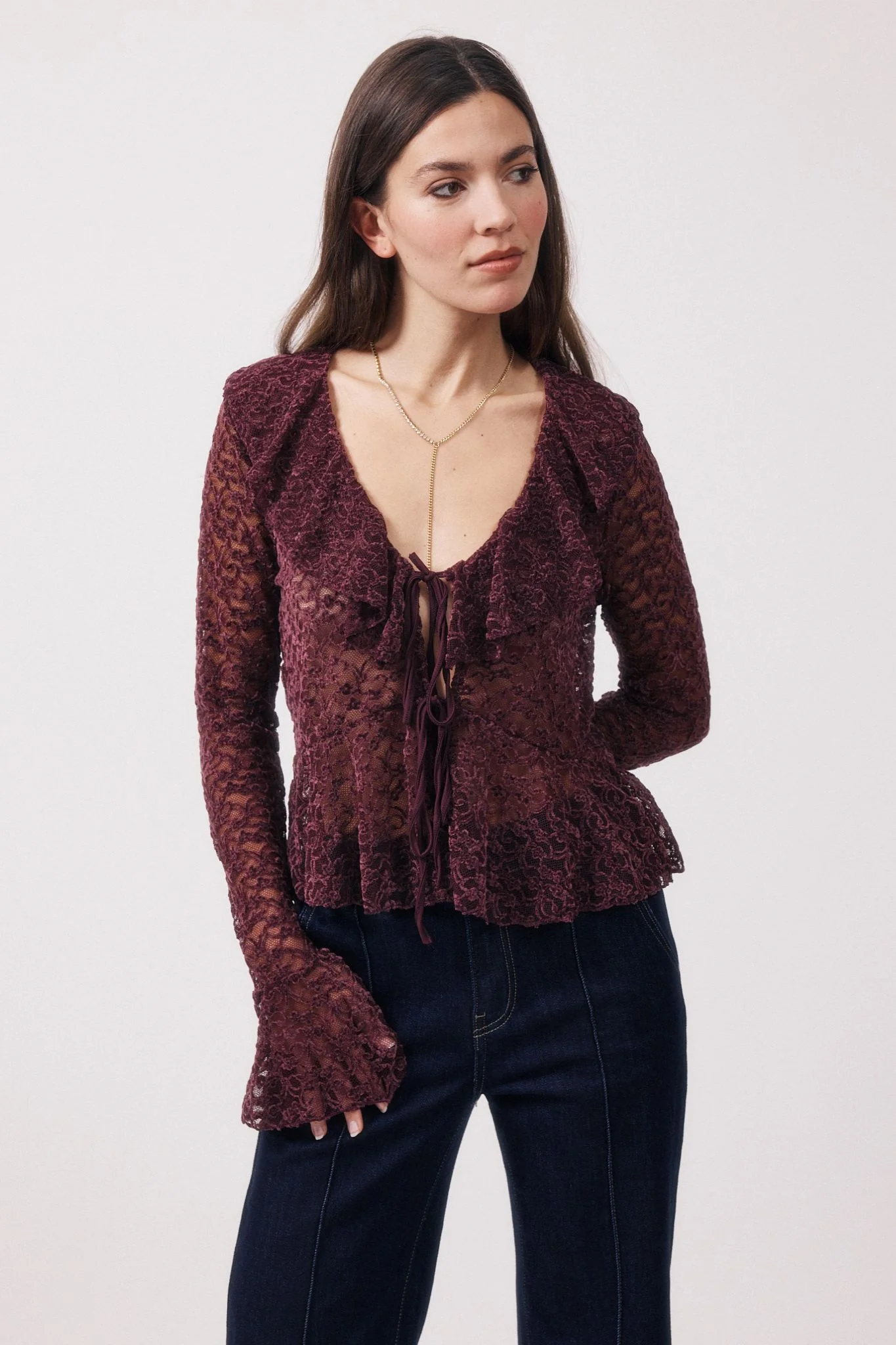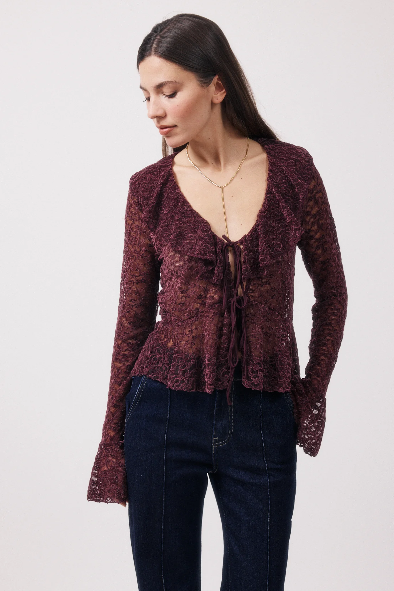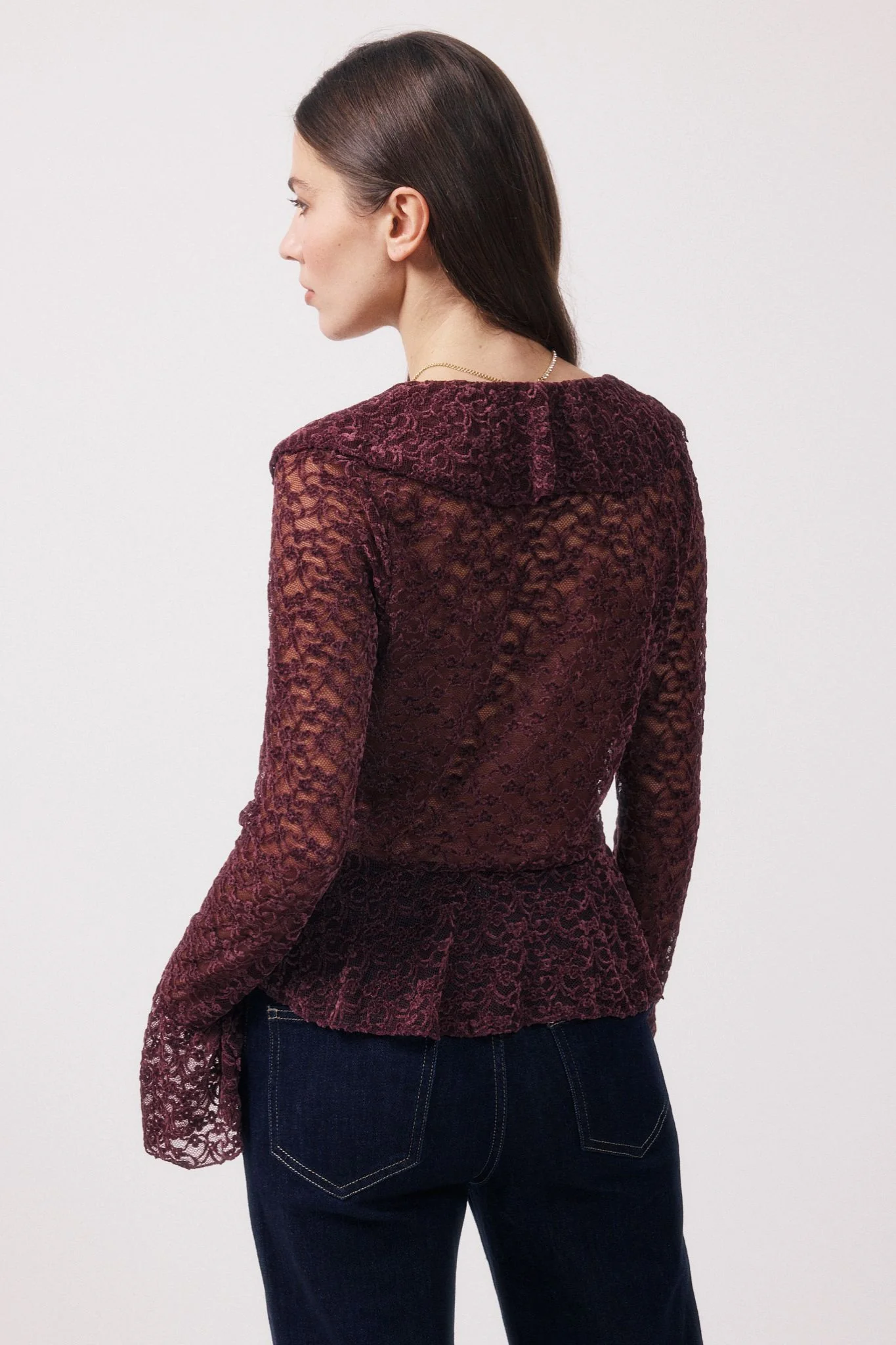 Top en dentelle à la transparence légère, souligné par un grand col et un lien à nouer sur le devant. Sa coupe ajustée s’évase légèrement à la taille, dessinant une silhouette féminine et structurée. Les manches évasées et le jeu de transparence apportent du relief à cette pièce à la fois délicate et affirmée.