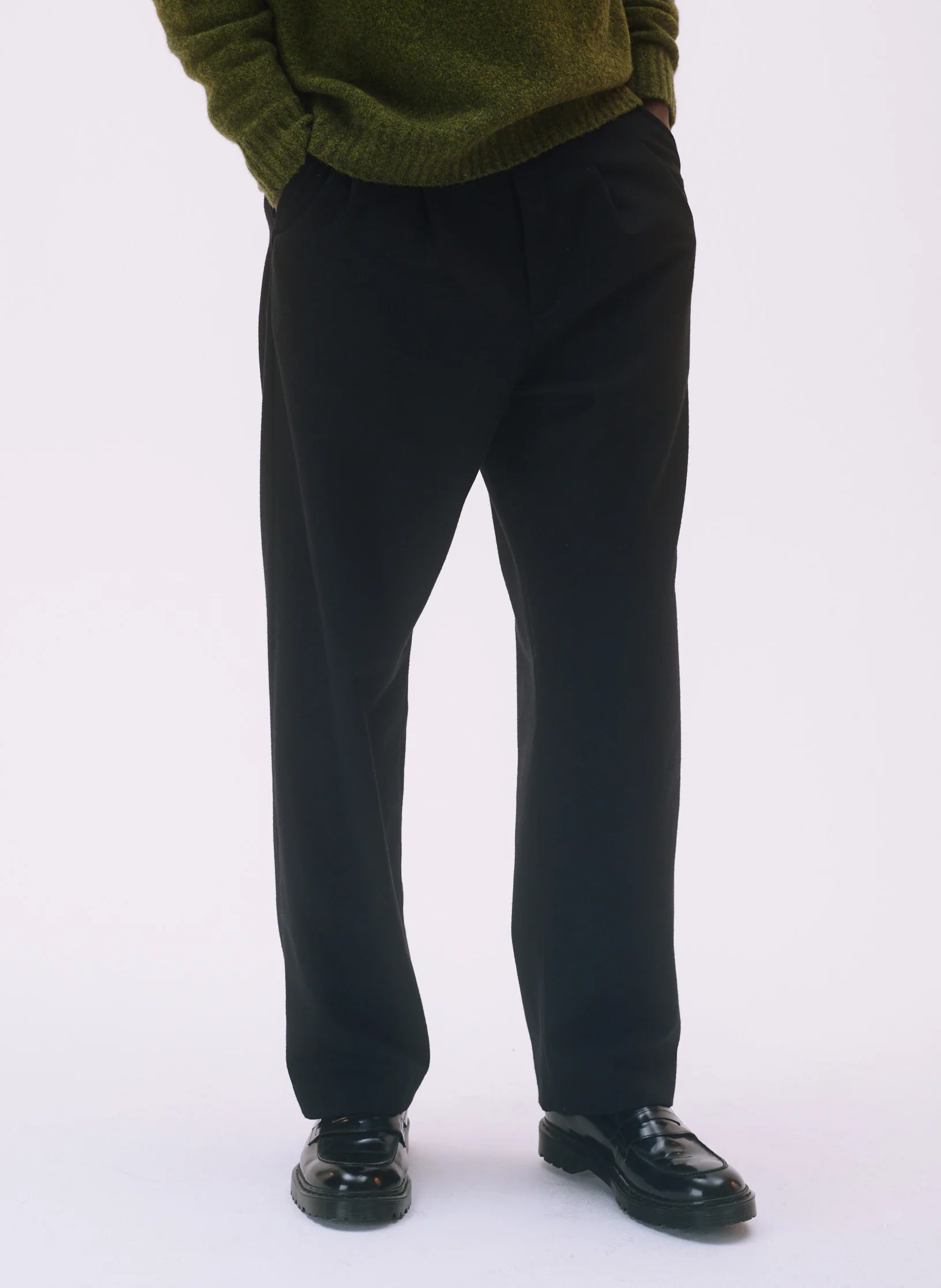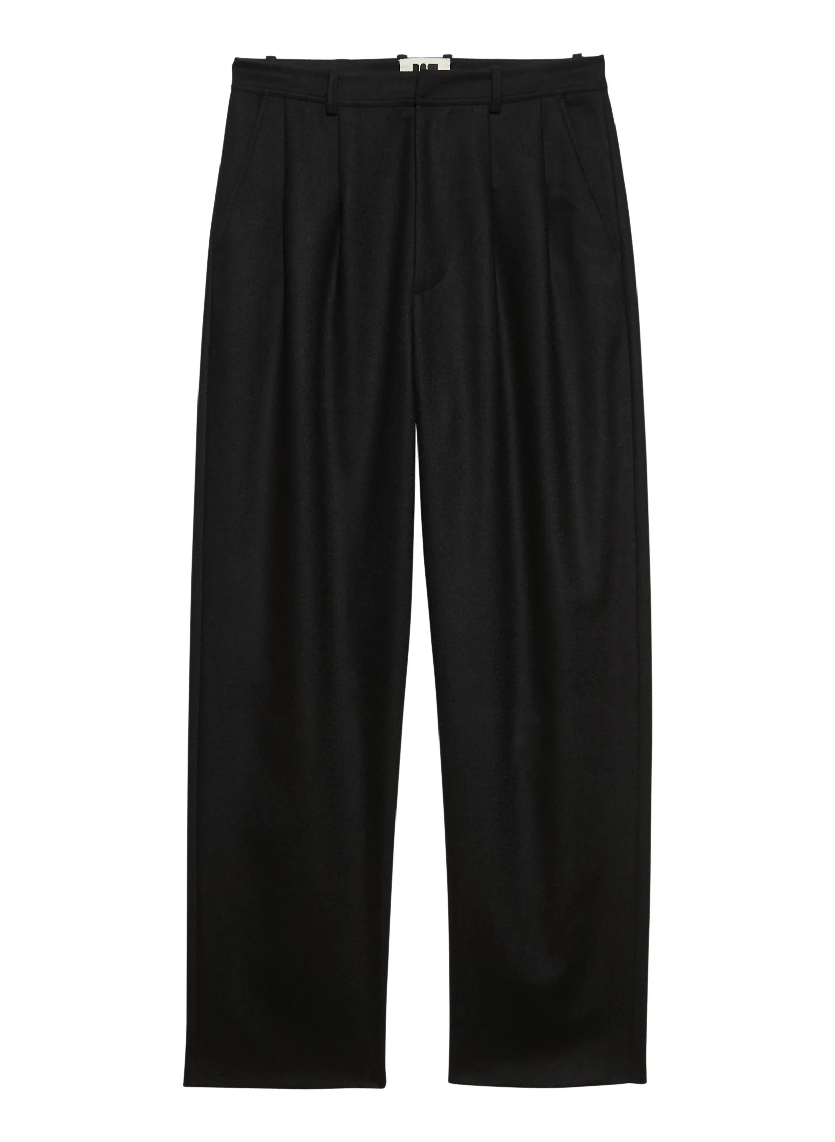 – Pantalon taille haute, à plis piqués, jambe large et droite
