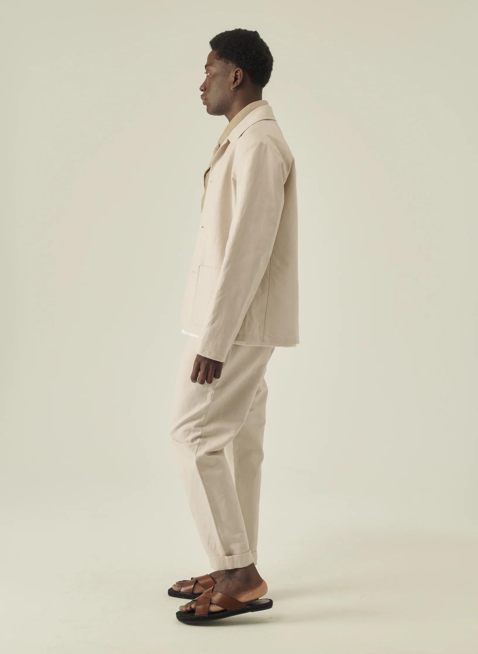 – Pantalon à plis, ample au niveau des cuisses et se resserrant légèrement sur le bas