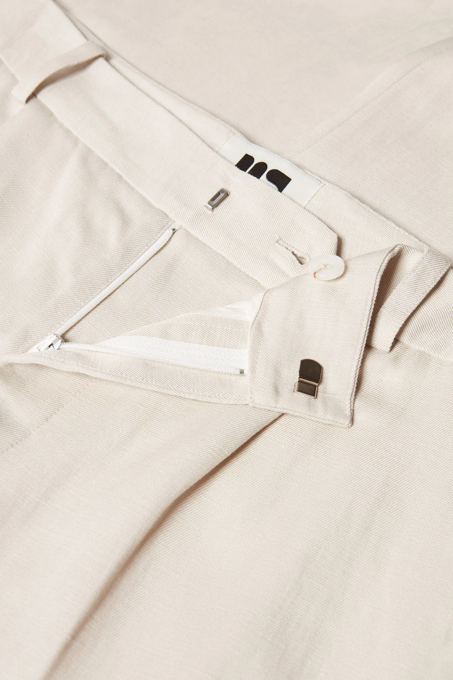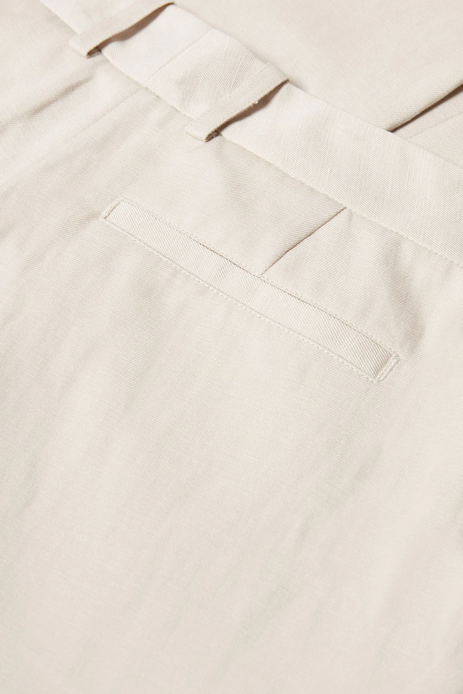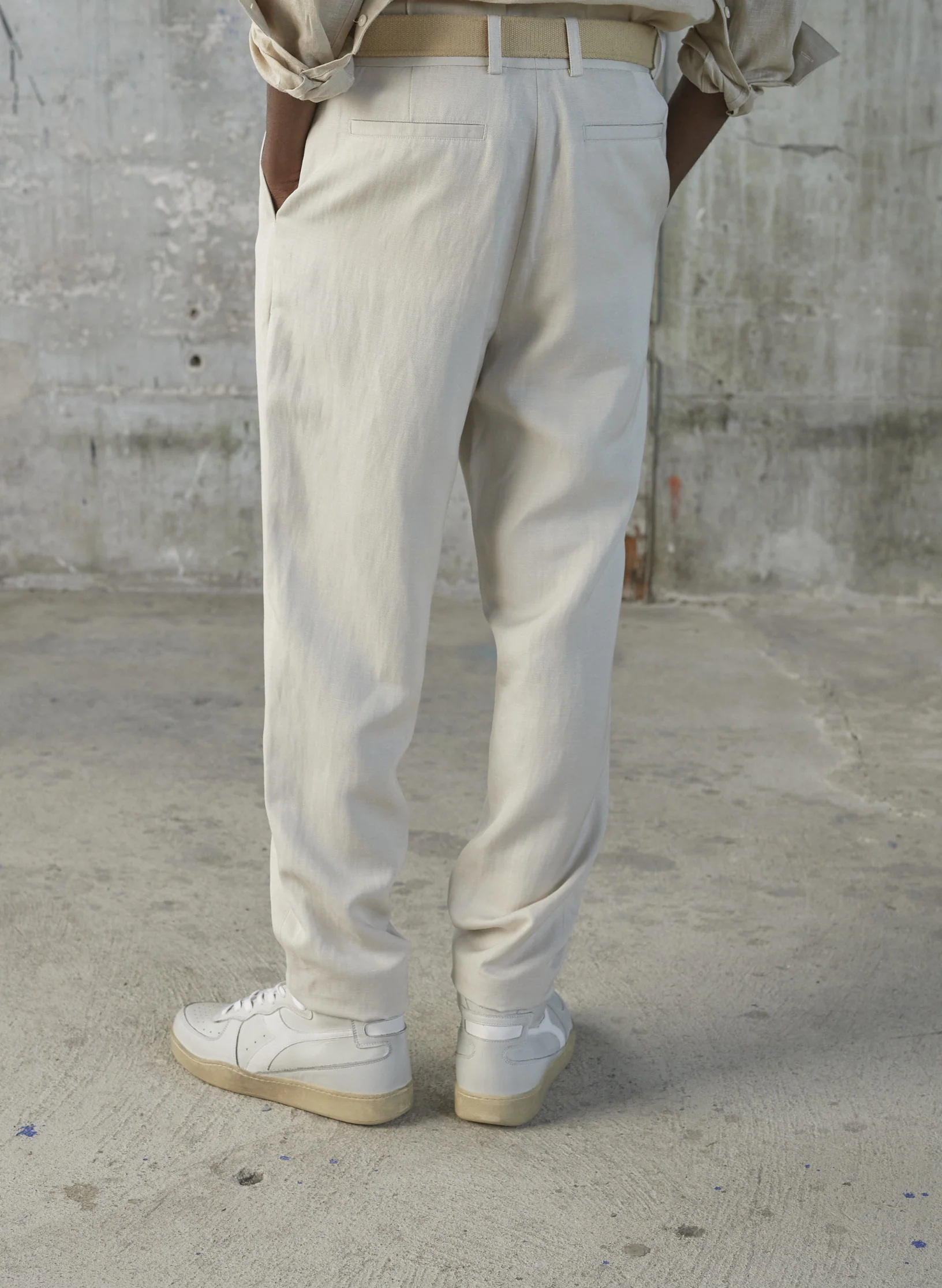 Pantalon carotte en coton/lyocell/lin. – Fermeture zip métallique et agrafe cachée – Ceinture montée avec 6 passants – Pantalon à plis, ample au niveau des cuisses et se resserrant légèrement sur le bas – Revers en finition bas de jambe – 2 poches italiennes sur le devant – 2 poches passepoilées au dos