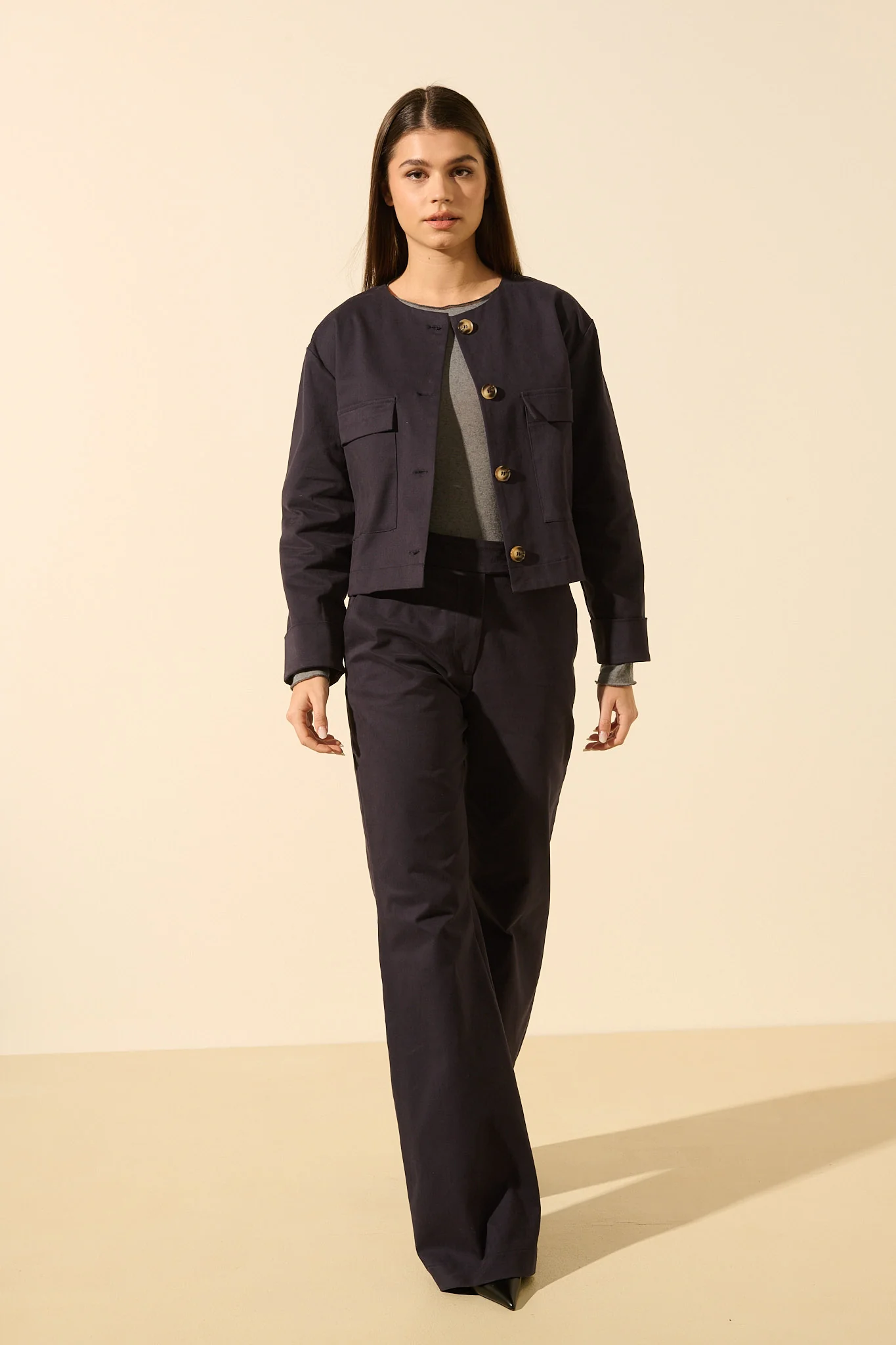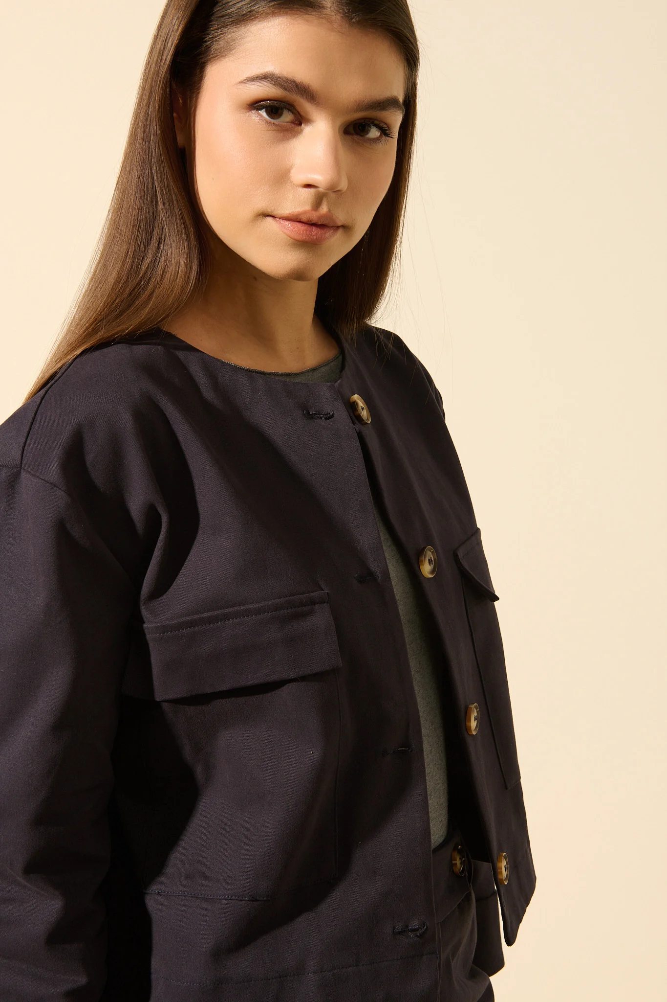 La veste courte au col rond Pauline, revisite les codes du tailoring avec une touche moderne et minimaliste. Dotée de grandes poches plaquées et d’un boutonnage apparent, elle structure la silhouette tout en restant facile à porter au quotidien.