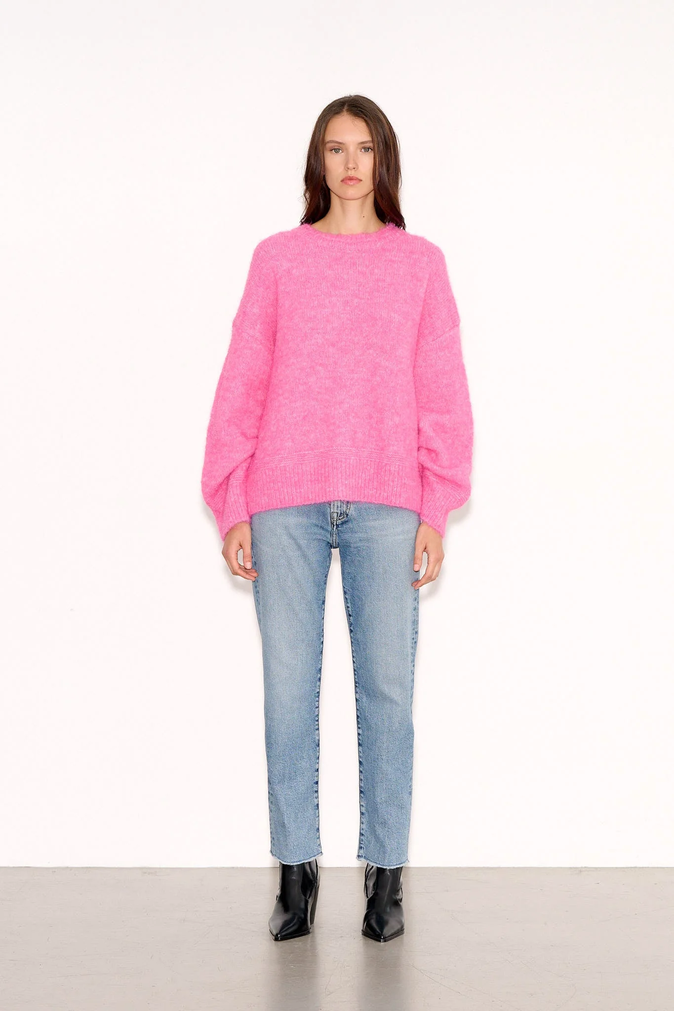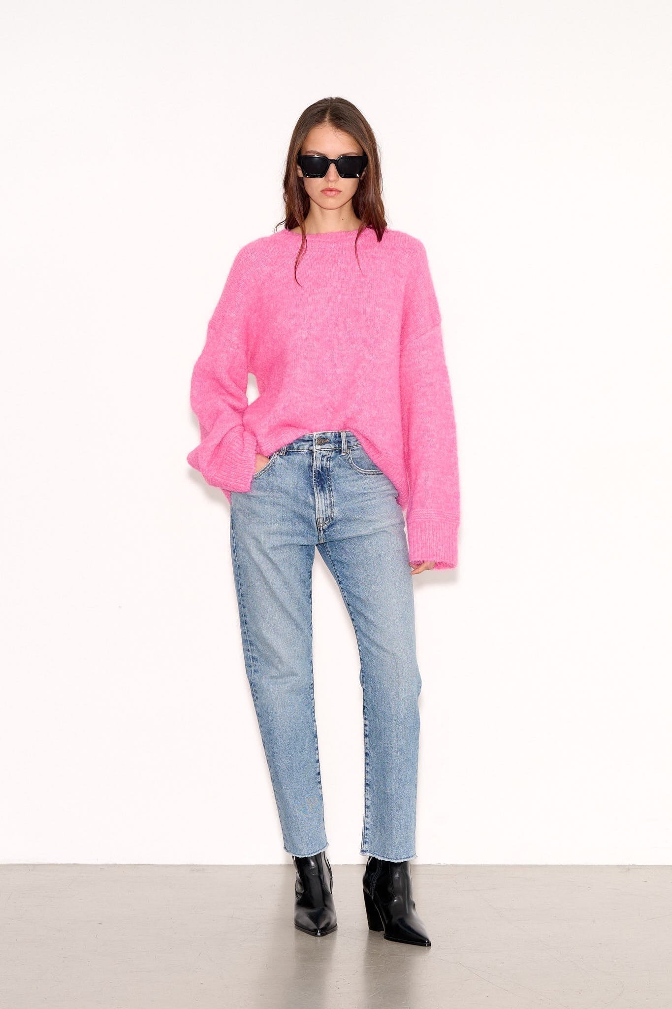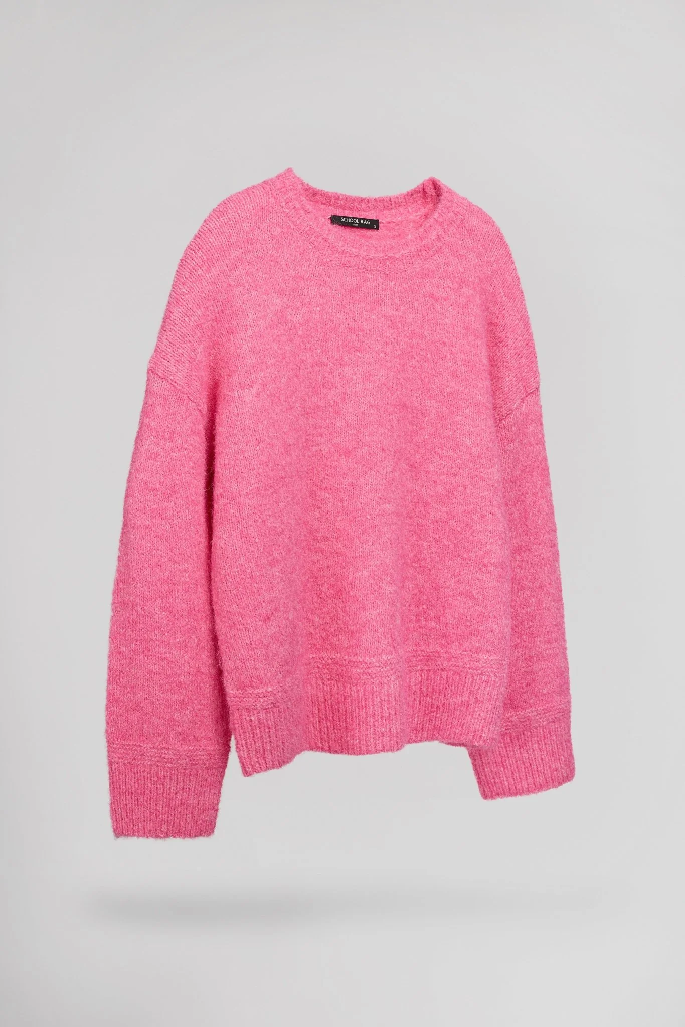 Pull ample en maille duveteuse, coupe droite Encolure ronde finition bord-côte Manches longues et larges, ajustées en bas par un poignet en bord-côte Finition bord côte en bas de vêtement Longueur depuis l’épaule pour une taille S : 59 cm Vous trouverez dans la même matière le pull P-LOBSTY.