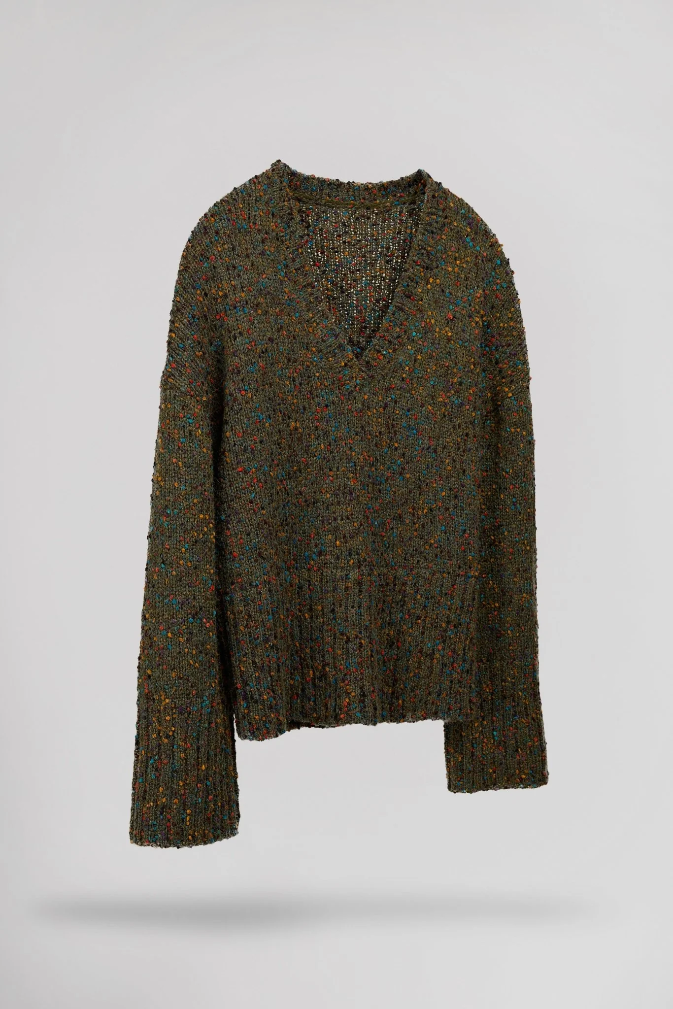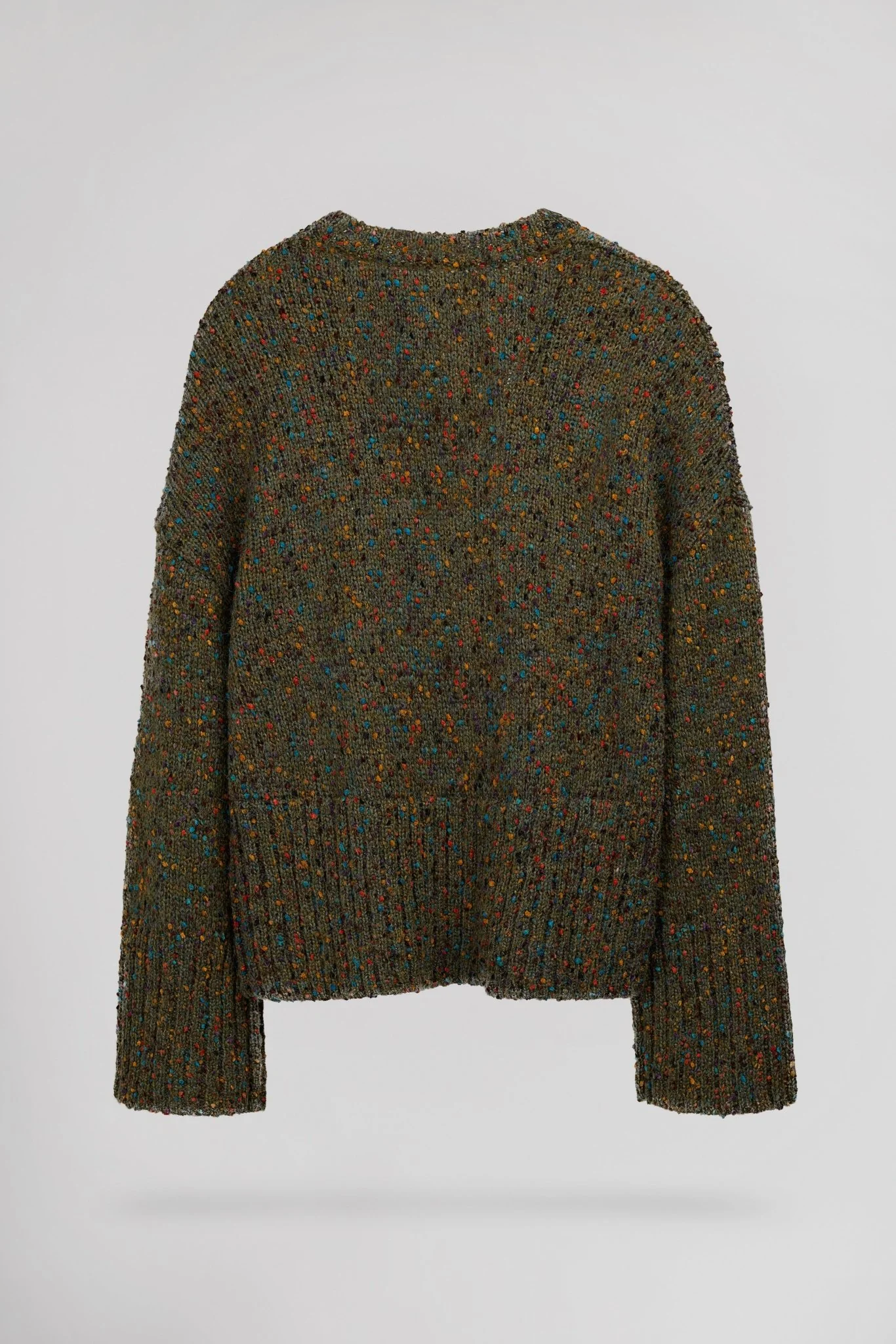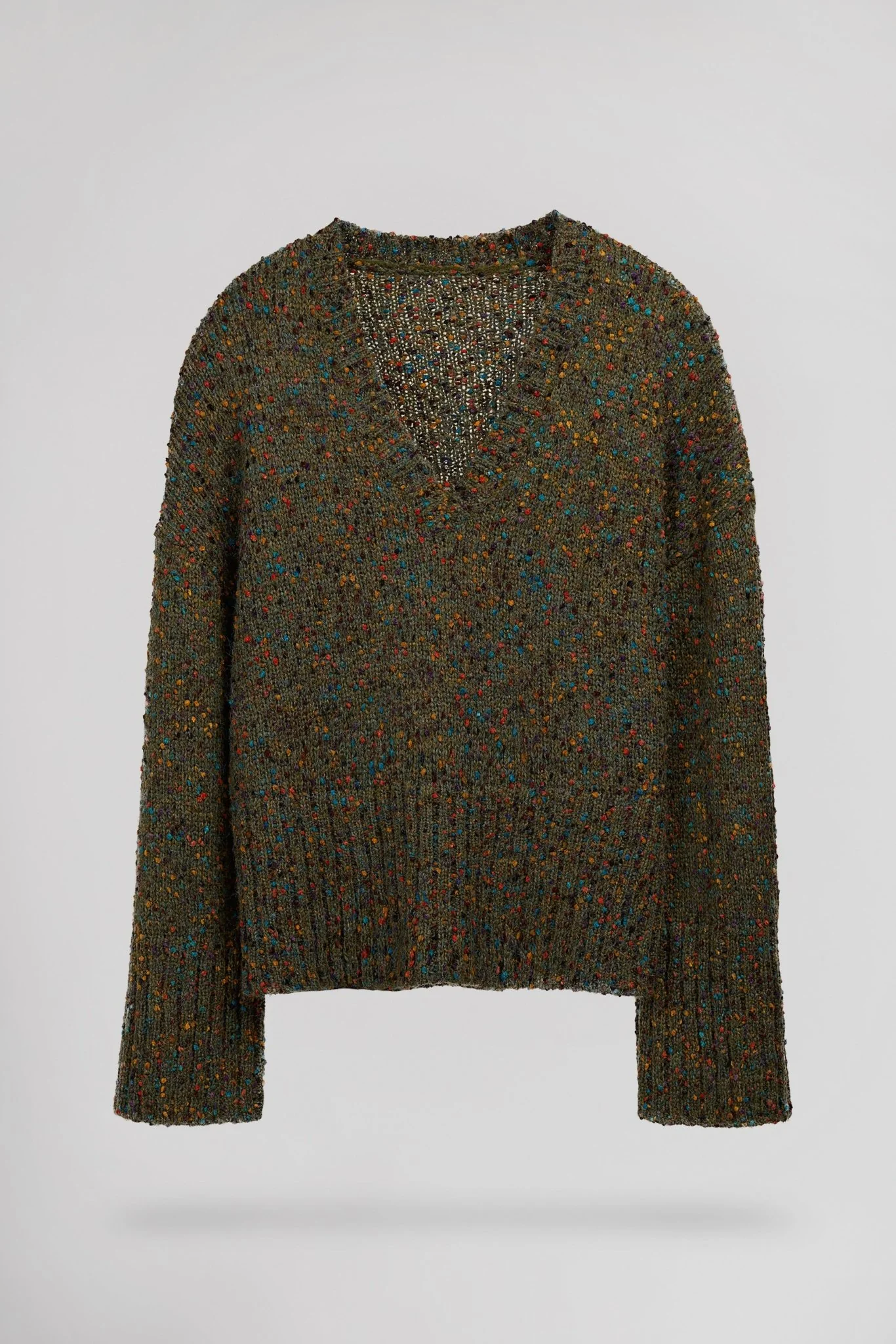 Coupe droite, maille parsemée de petits pois en relief multicolore Encolure V profonde Finitions bord-côte à l’encolure, bas de manche et bas de vêtement Points de feston au bas de manches et du corps Longueur depuis l’épaule pour une taille S : 60 cm