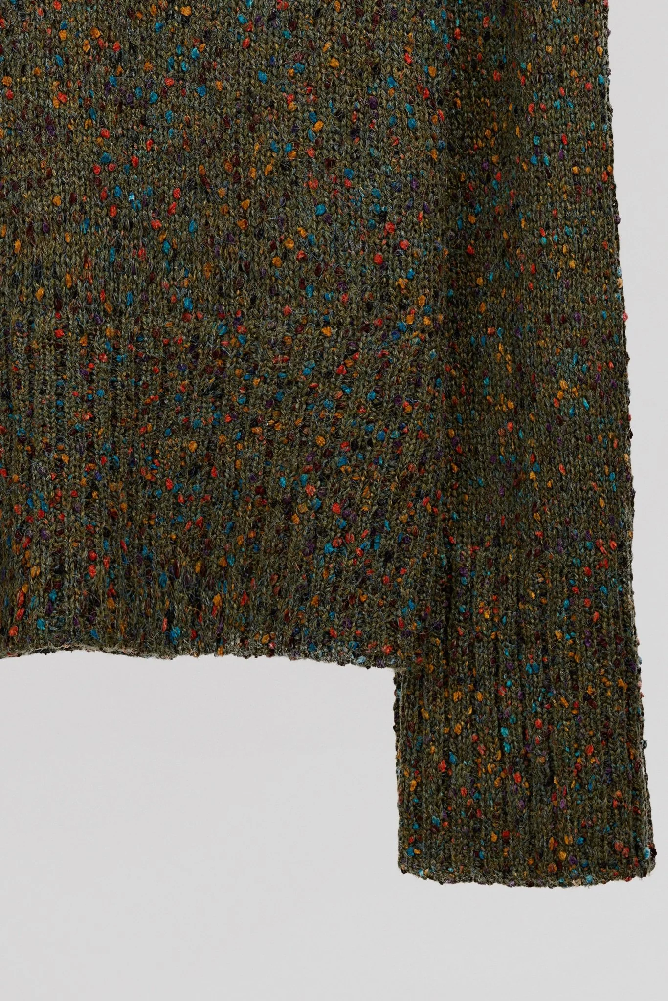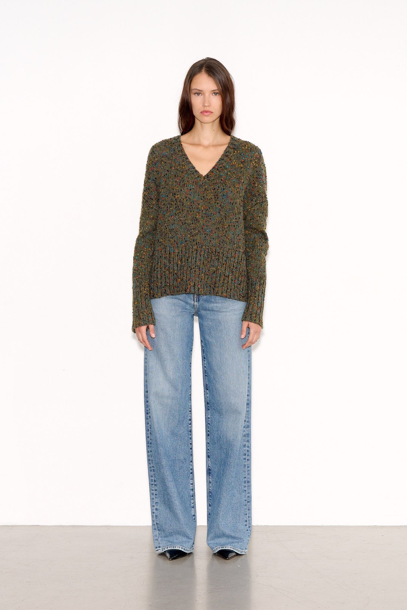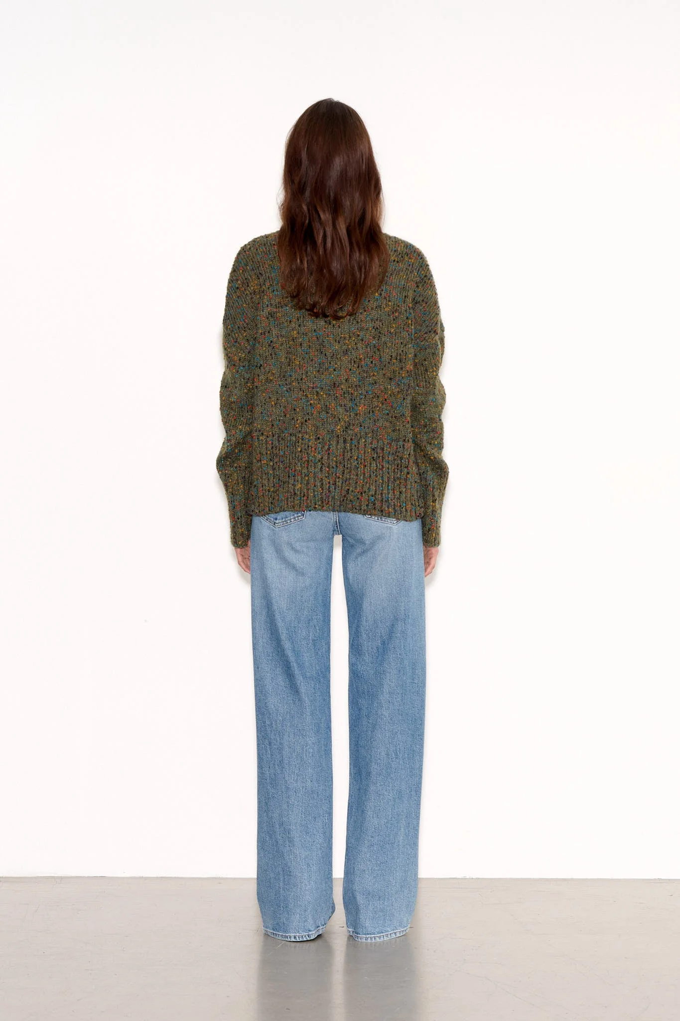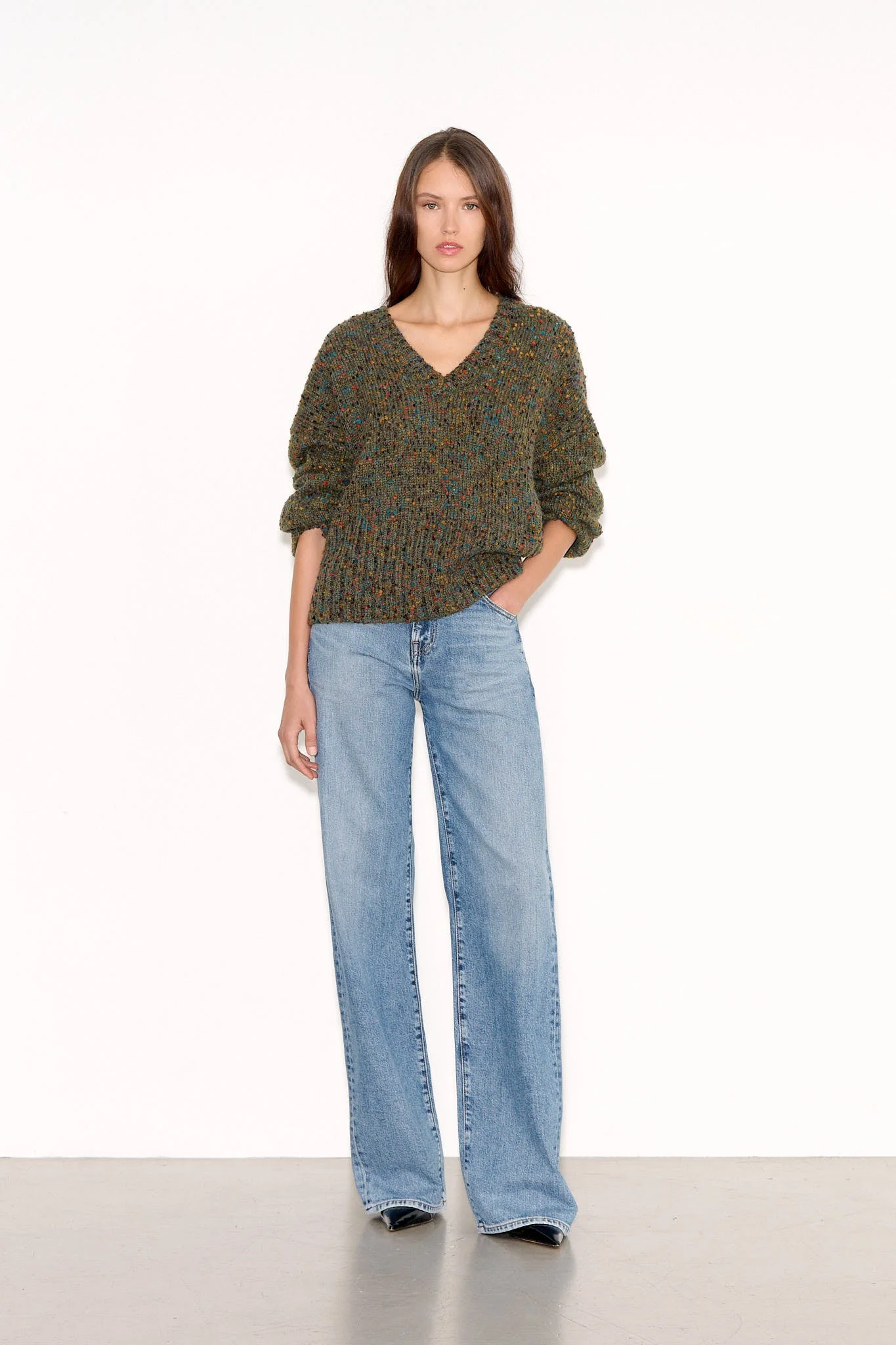 Coupe droite, maille parsemée de petits pois en relief multicolore Encolure V profonde Finitions bord-côte à l’encolure, bas de manche et bas de vêtement Points de feston au bas de manches et du corps Longueur depuis l’épaule pour une taille S : 60 cm