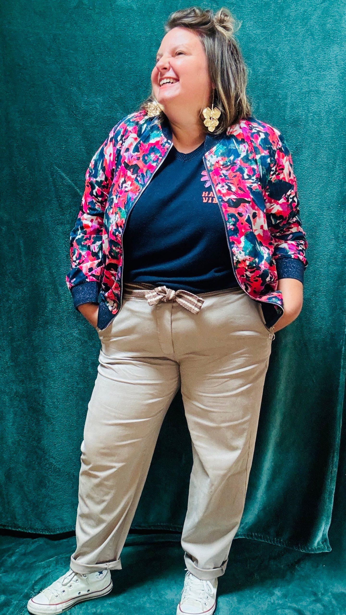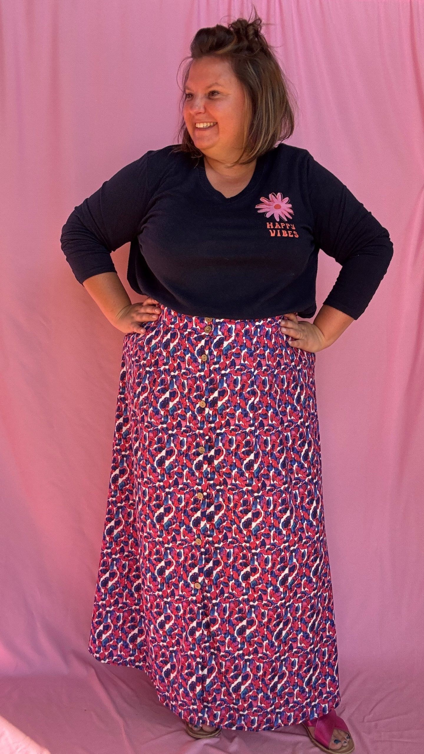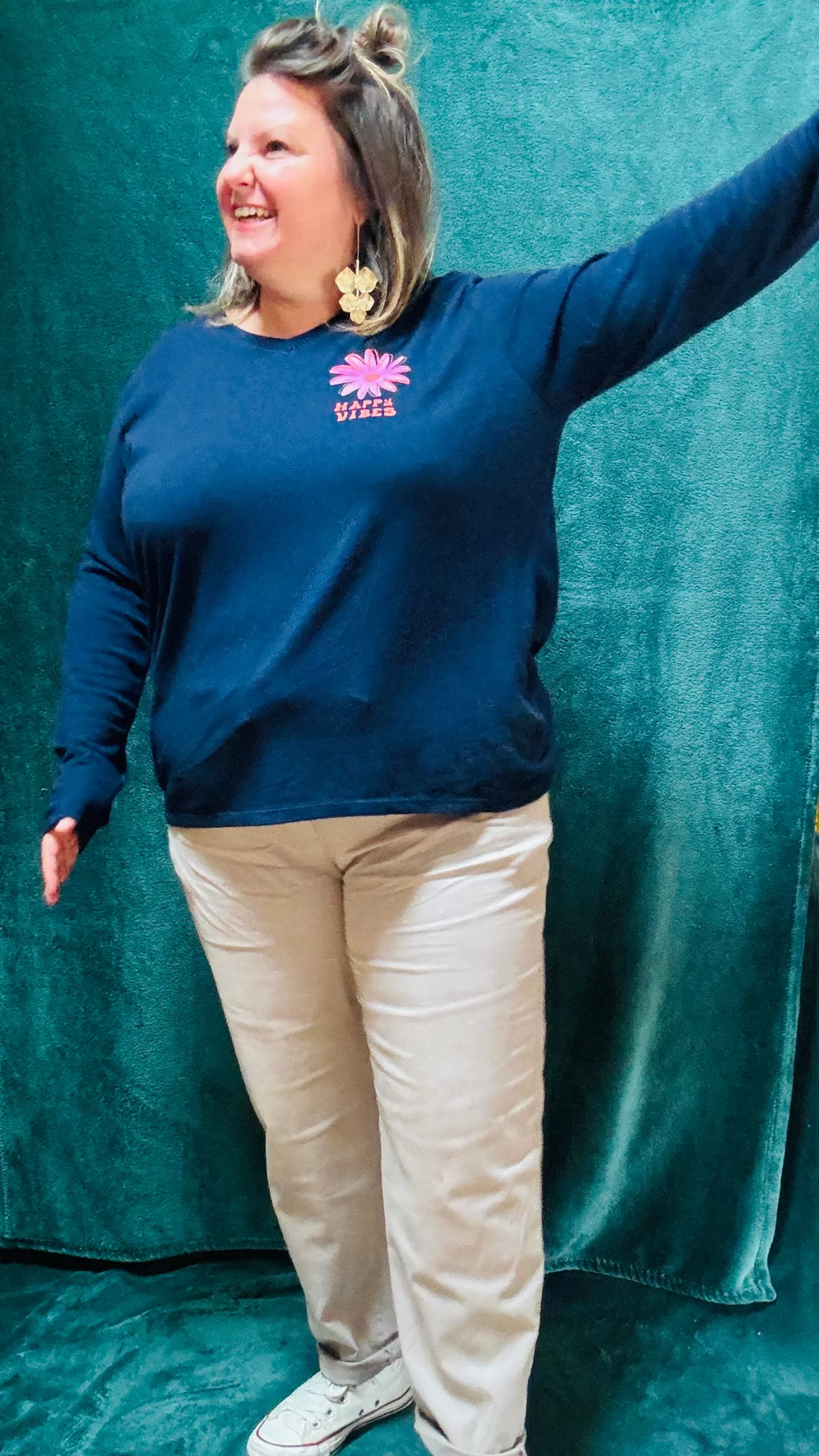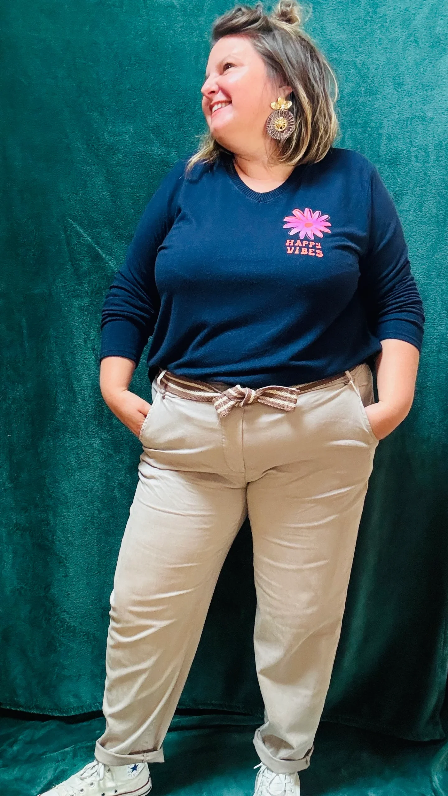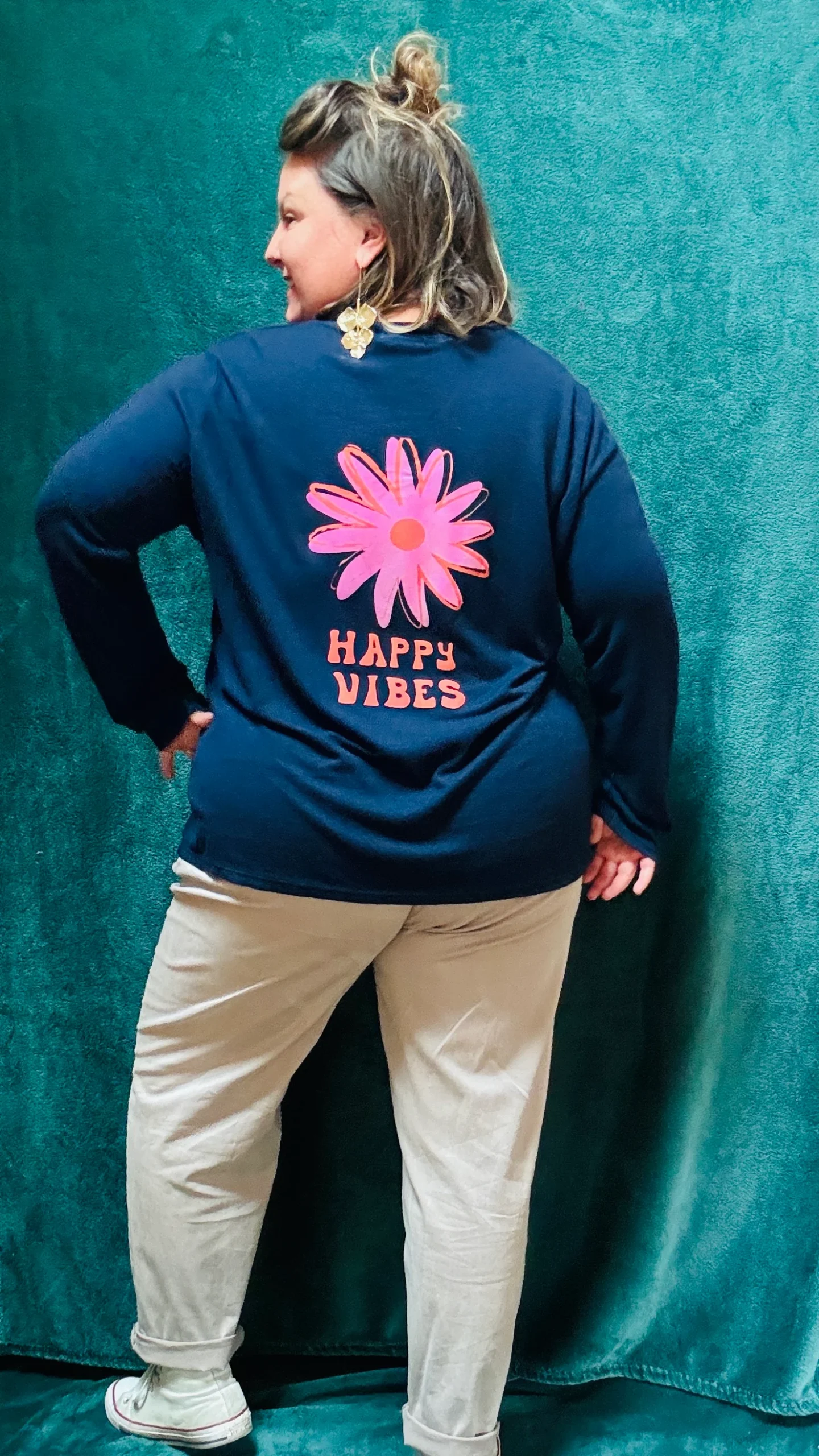 Exprimez votre bonne humeur avec ce pull fin grande taille « Happy Vibes » aux motifs orange et rose, présents sur la poitrine et dans le dos. Ce pull léger à col V est idéal pour celles qui souhaitent allier confort et originalité. Disponible en trois coloris : noir, bleu marine ou camel, il s’adapte à toutes les occasions, que ce soit pour un style décontracté au quotidien ou pour un look plus créatif et artistique.