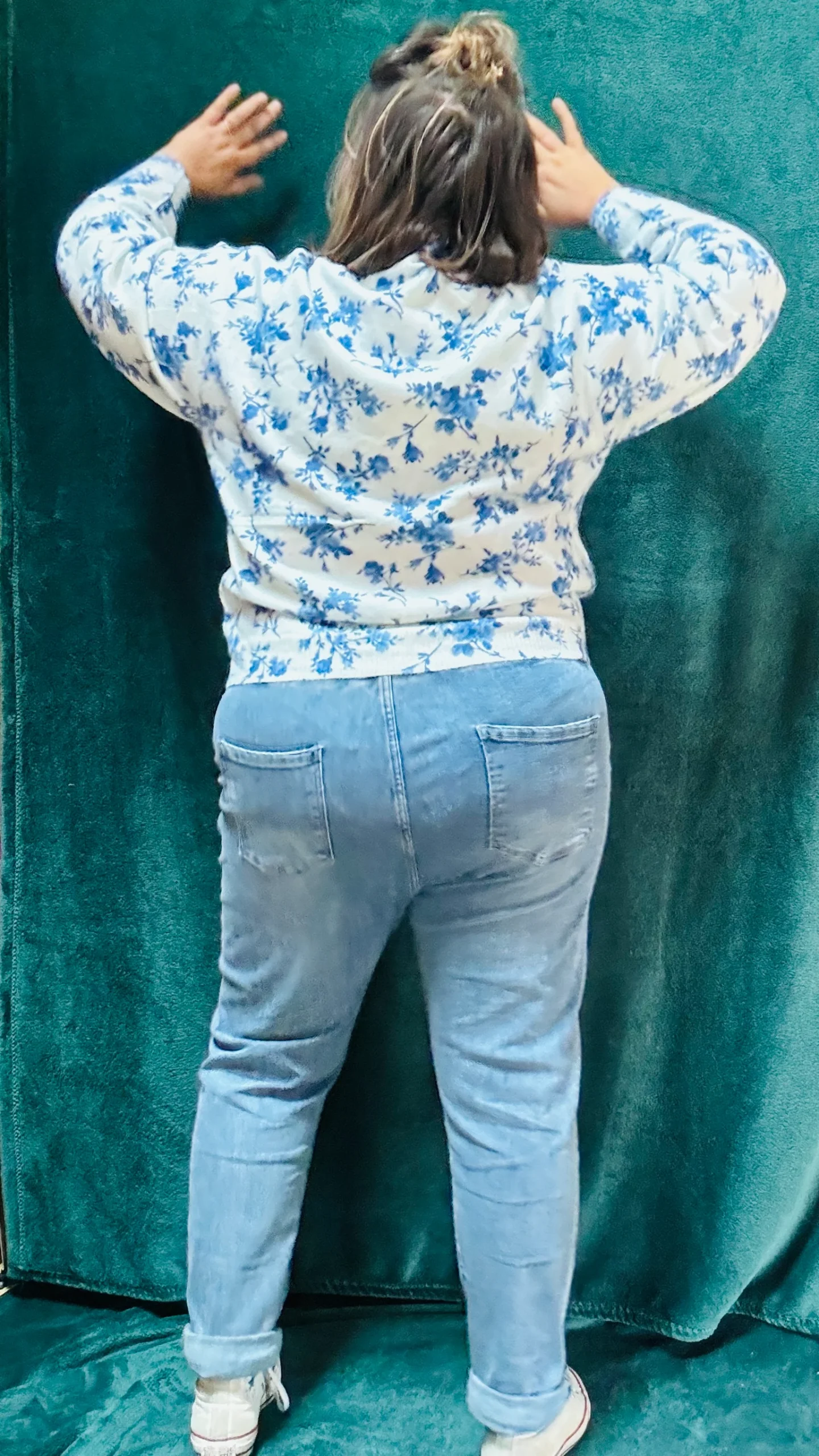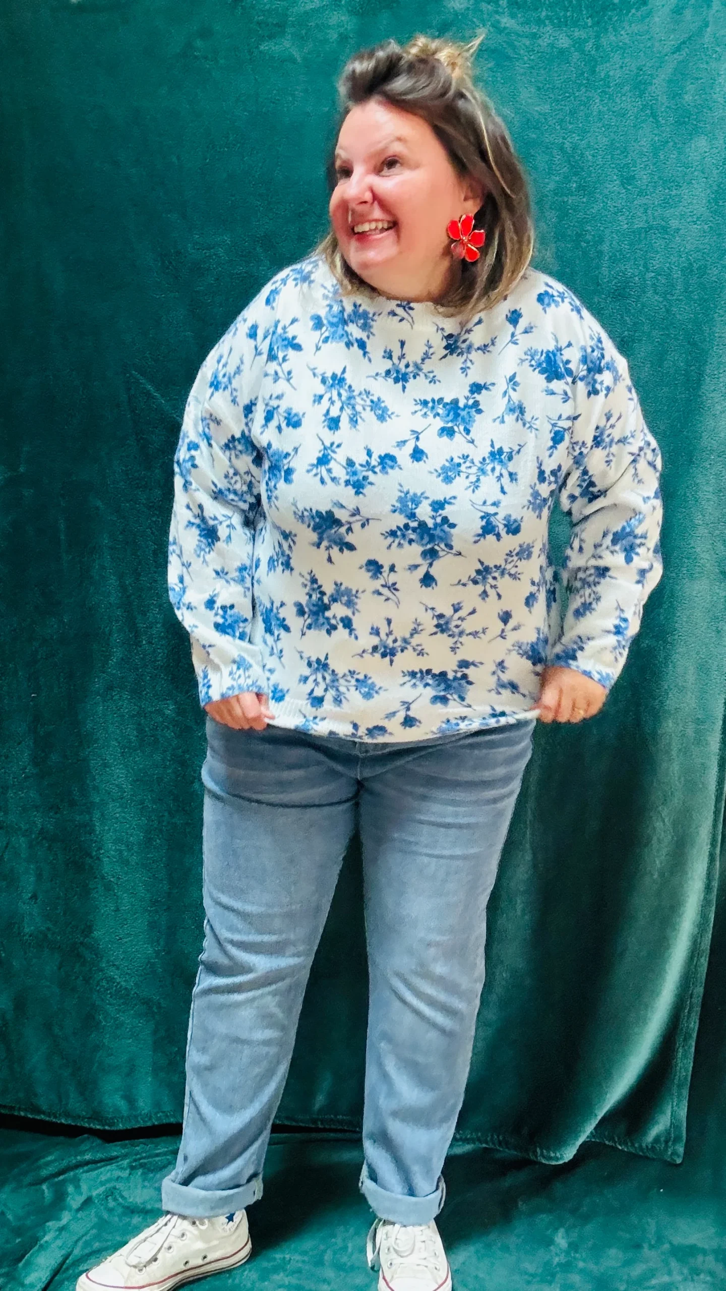 Pull Lolo – grande taille motifs fleuris bleu et blanc