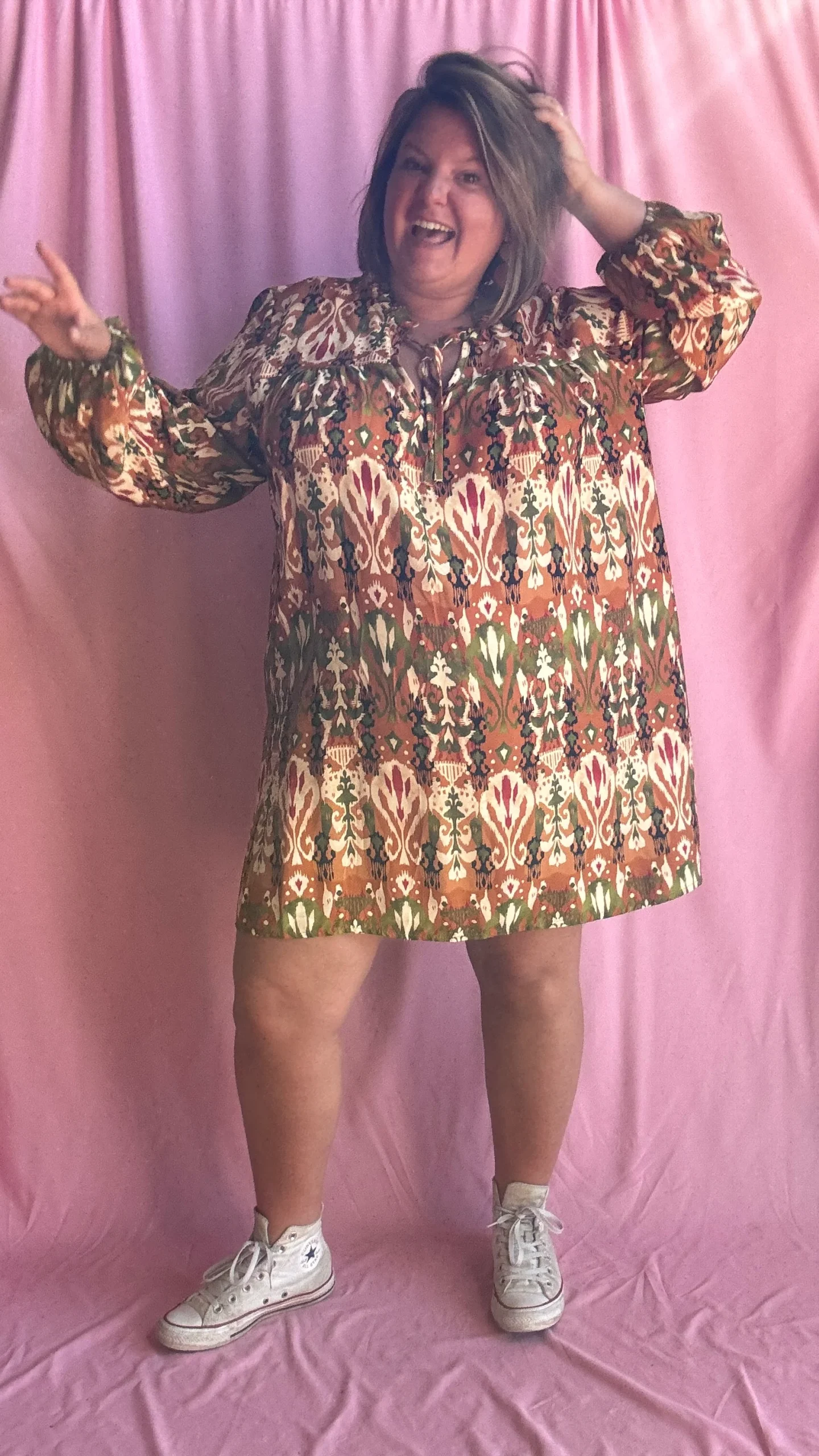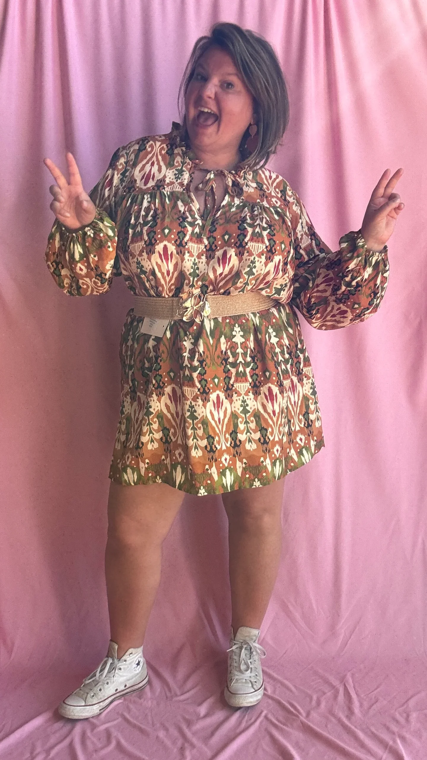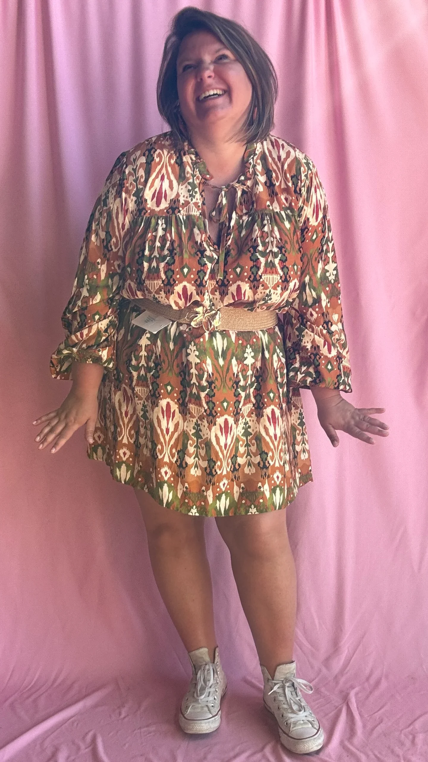 Adoptez un look original et plein de caractère avec cette robe droite grande taille aux motifs légèrement ethniques dans des tons kaki, orange et beige. Sa coupe fluide et droite, légèrement courte, en fait une pièce facile à porter avec ou sans ceinture, selon votre style et vos envies.