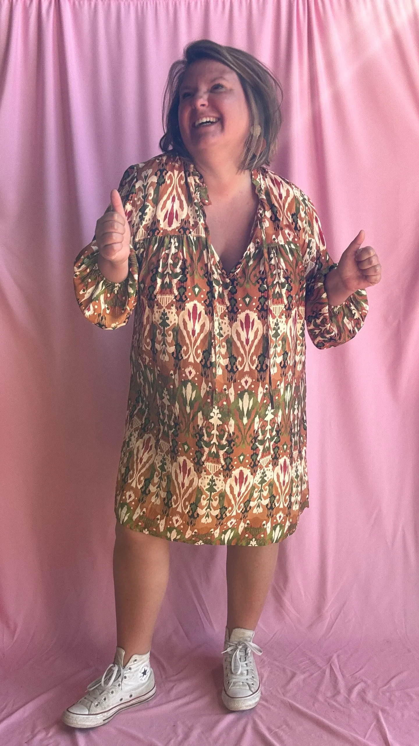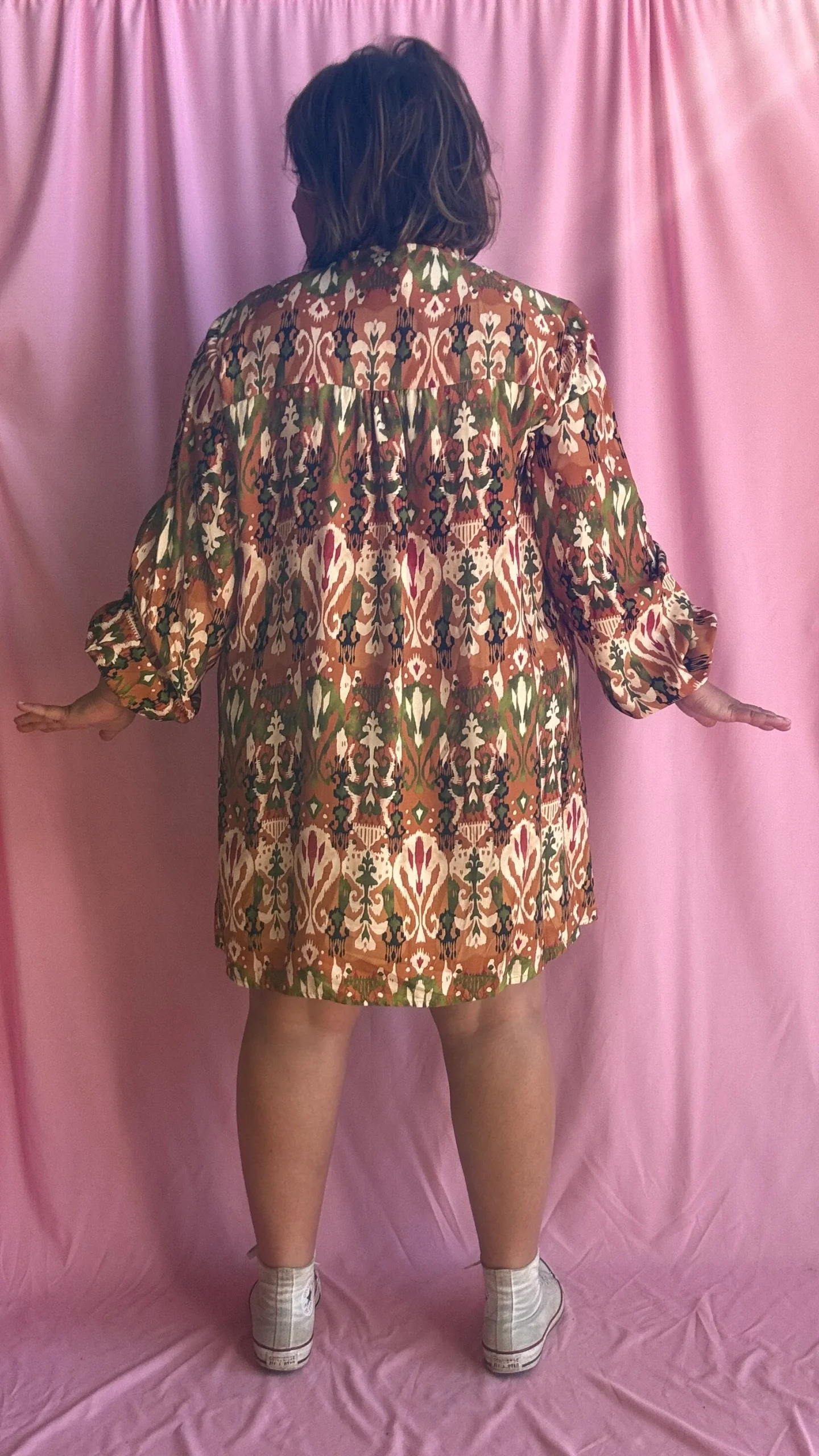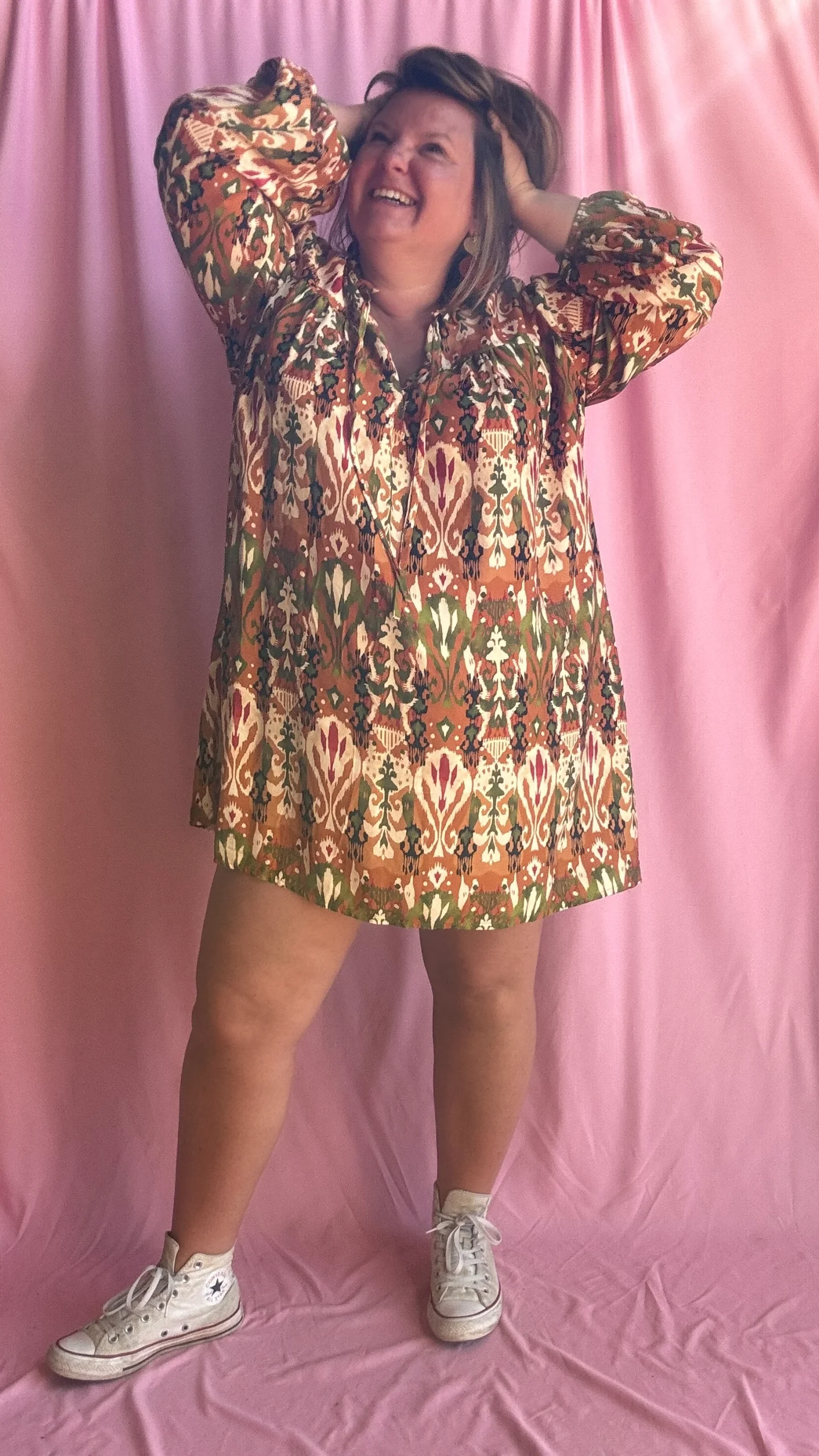 Adoptez un look original et plein de caractère avec cette robe droite grande taille aux motifs légèrement ethniques dans des tons kaki, orange et beige. Sa coupe fluide et droite, légèrement courte, en fait une pièce facile à porter avec ou sans ceinture, selon votre style et vos envies.