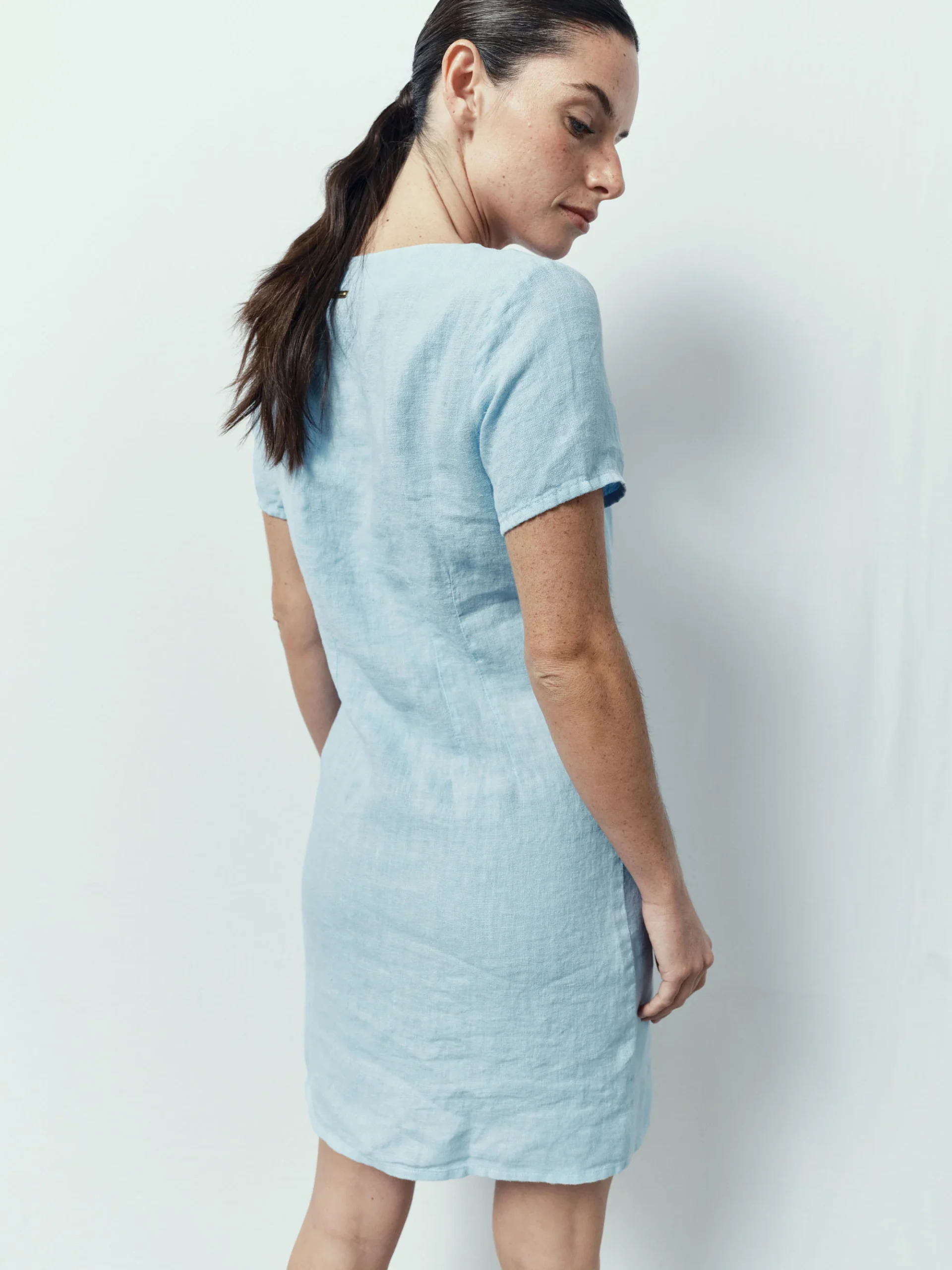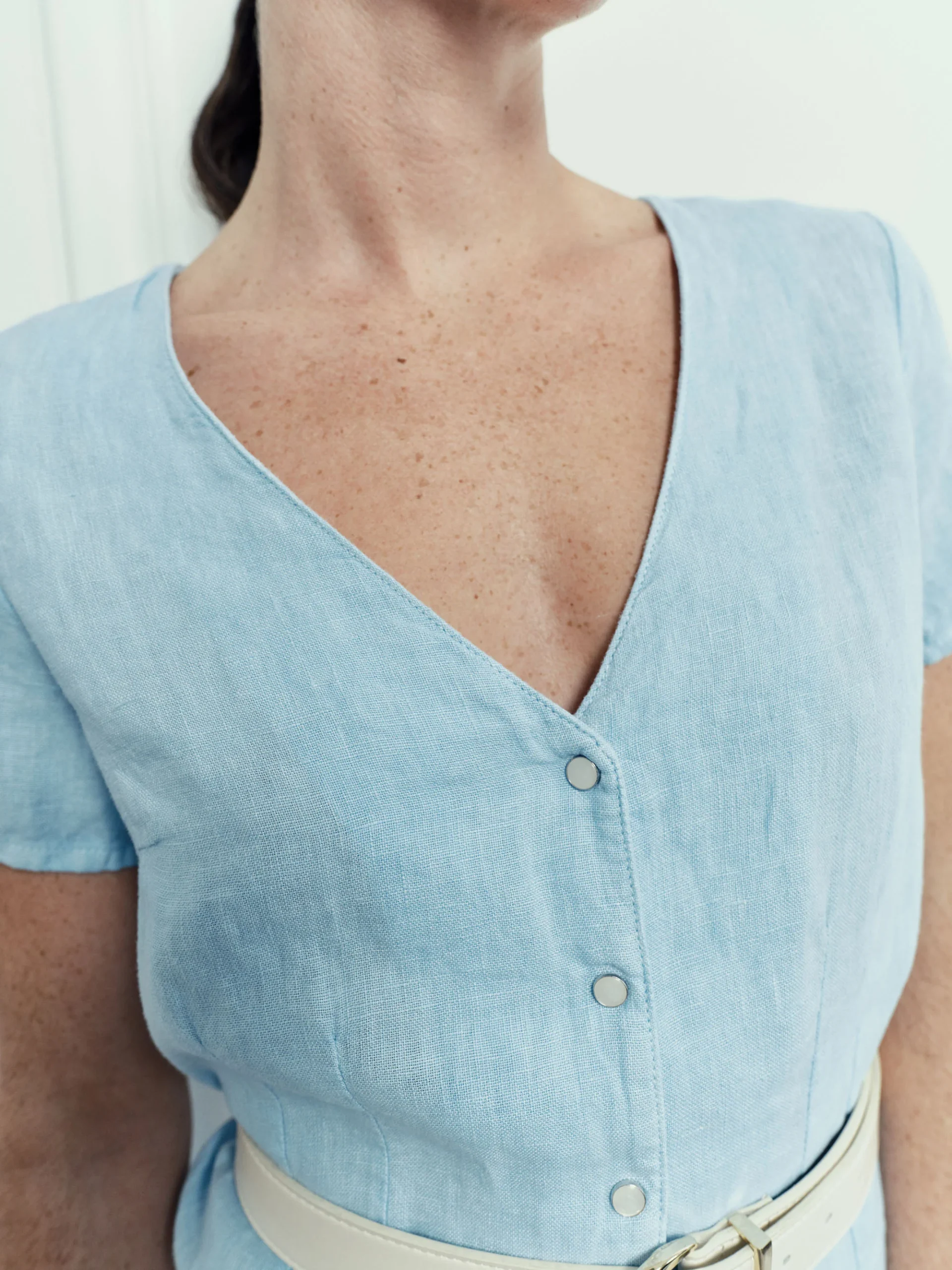 La robe Alena, confectionnée en lin, est une ode à la simplicité élégante. Légère, elle est idéale pour les journées ensoleillées. Son encolure en V adoucie, sa coupe structurée par des pinces et sa fermeture par boutons-pression en font une pièce facile à vivre et à styliser.